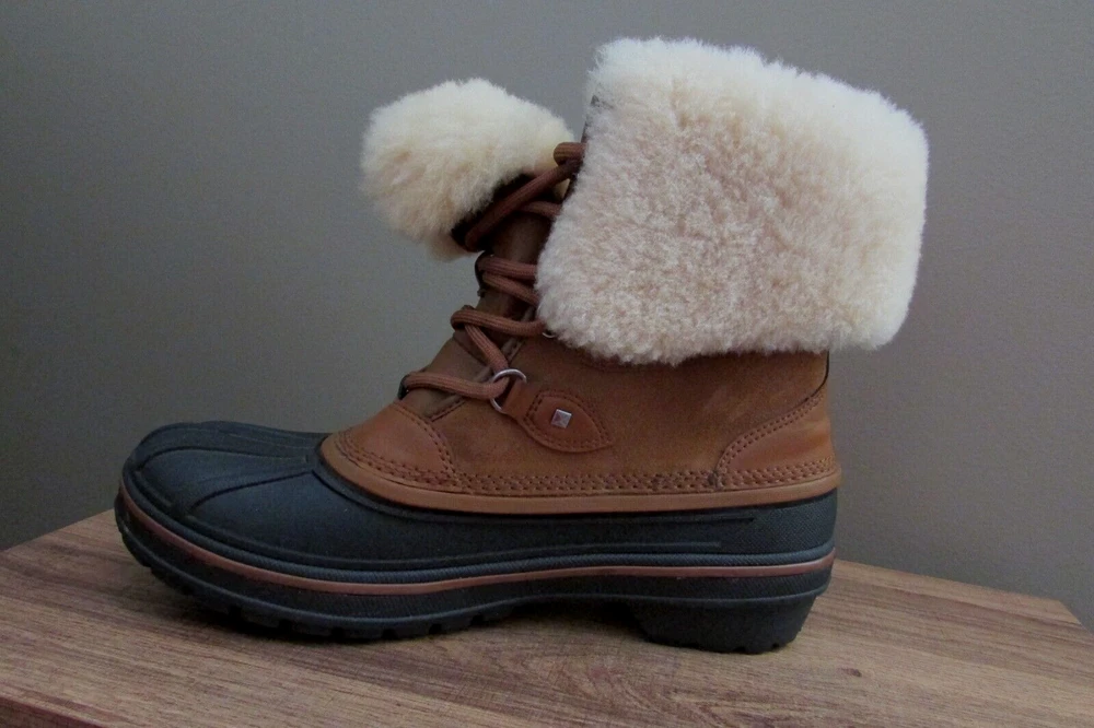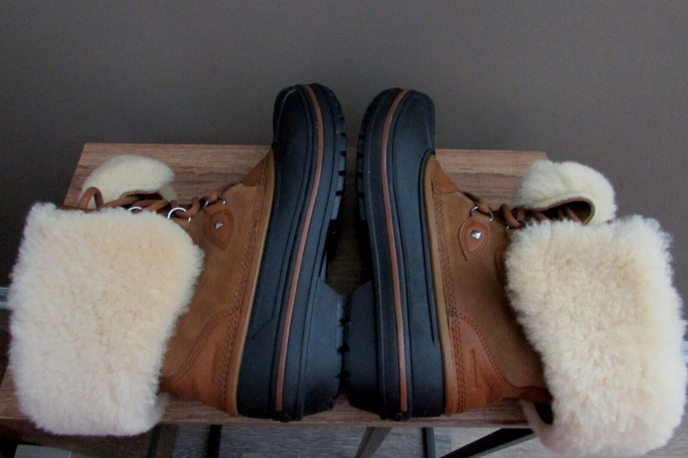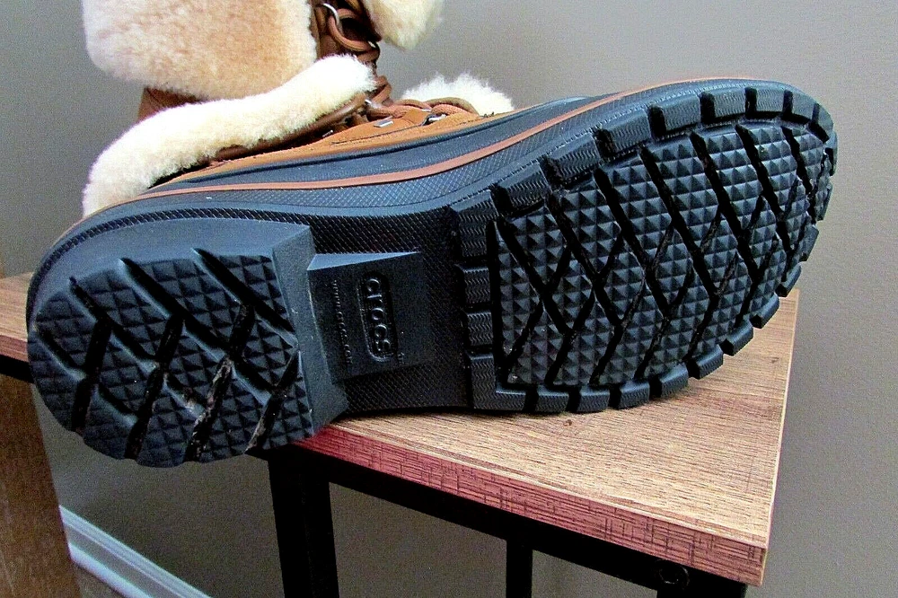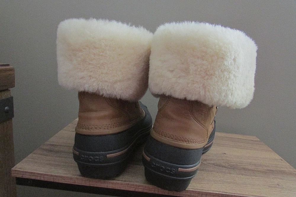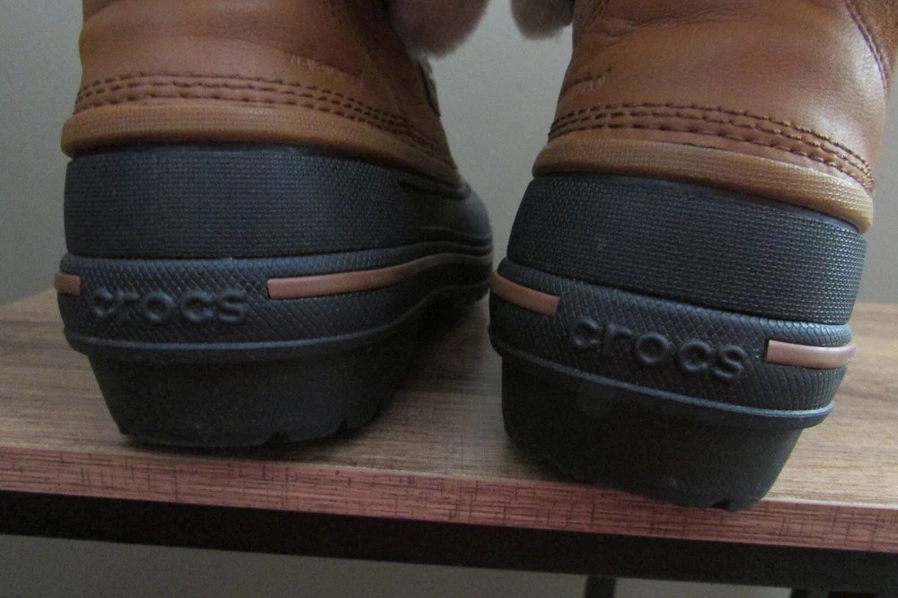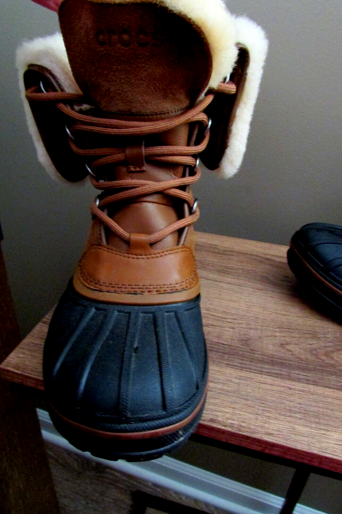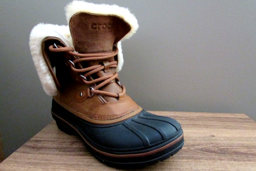 DISCONTINUED HARD TO FIND ALL-CAST 2 LUXE LEATHER WATERPROOF SNOW BOOTS IN WHEAT / BLACK IN WOMEN 8. Enjoy an extra layer of luxury fuzz around the upper shaft of your boots! These are WATERPROOF Crocs snow boots. worn once great condition smoke and pet free home