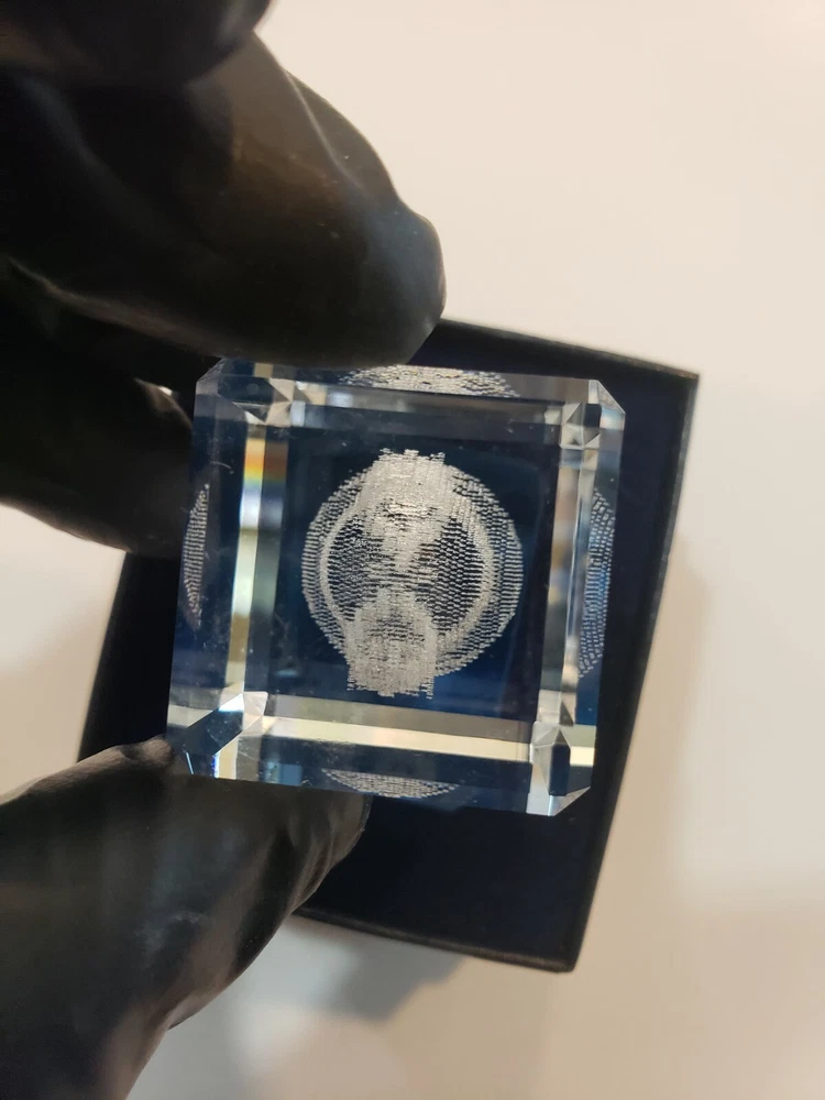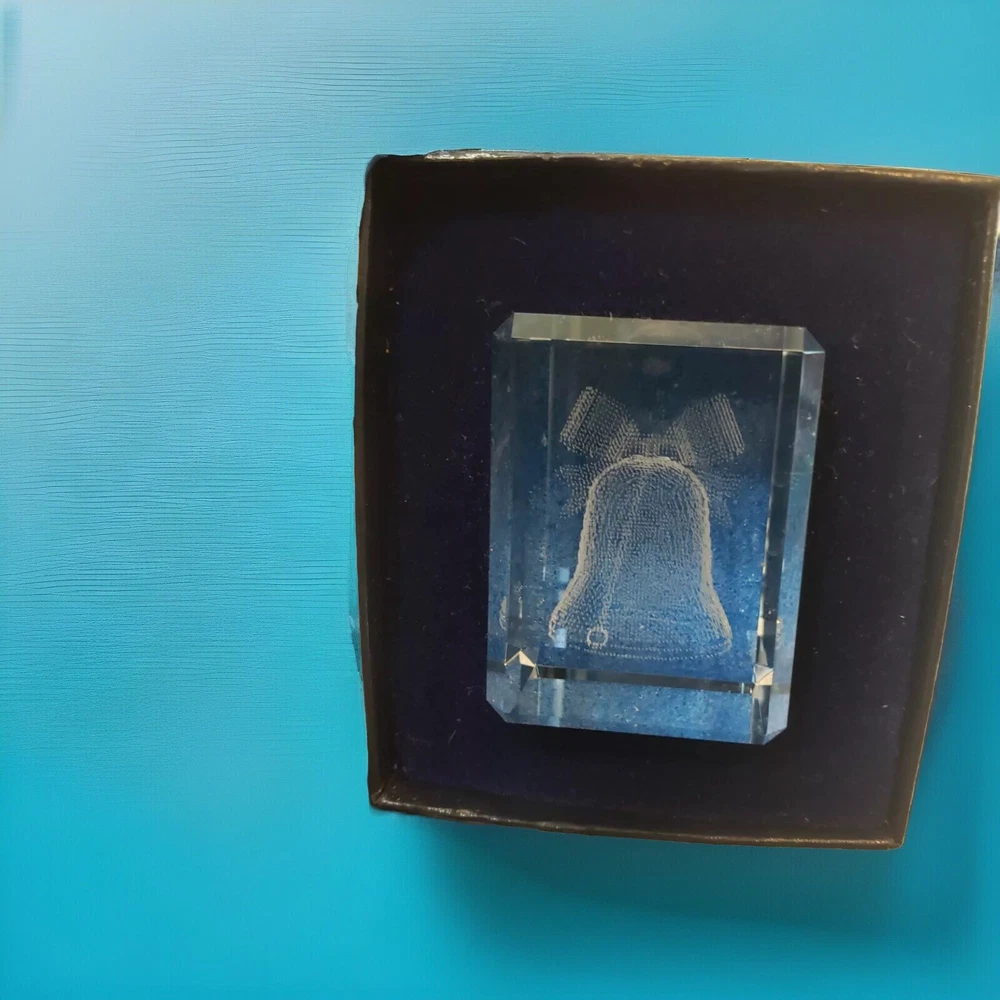 This crystal 3-D laser-etched glass cube is the perfect addition to your holiday décor collection. The cube features a beautiful holiday bell design that will catch the eye of anyone who sees it. Made of high-quality glass, this cube is not only beautiful but also durable and long-lasting. The clear color of the glass and the intricate details of the etching make this cube a unique and stunning piece. It is perfect for displaying on a mantel, shelf, or table during the holiday season. Whether you're looking to add to your own collection or give a special gift, this crystal glass cube is sure to impress. Box may have slight damage