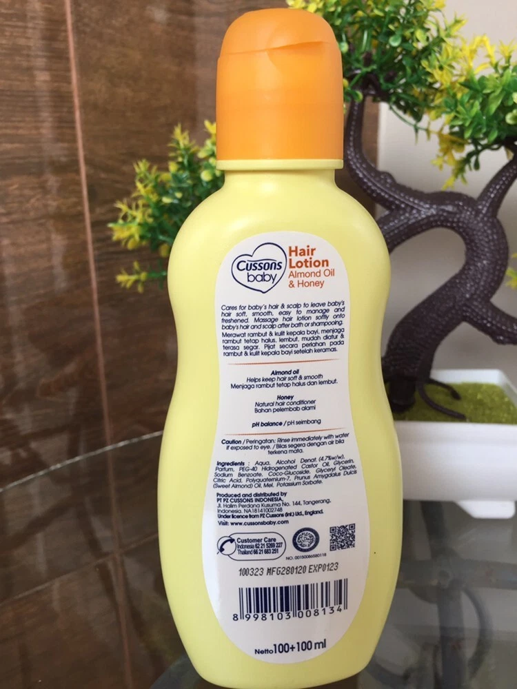 Cussons Baby Hair Lotion Almond Oil & Honey 2x100ml - Baby Hair Lotion cusson baby -Cussons Baby Hair Lotion Almond Oil & Honey contains Almond Oil and Honey, can prevent dry scalp and provide moisture to hair and scalp -Enriched with Honey Natural Conditioner which is proven to provide moisture naturally with a balanced pH. -Cussons Baby Hair Lotion Almond Oil & Honey has a calming scent and has been tested by dermatologists so it is suitable & safe for babies -Made with a gentle formula that suits baby's hair and head.