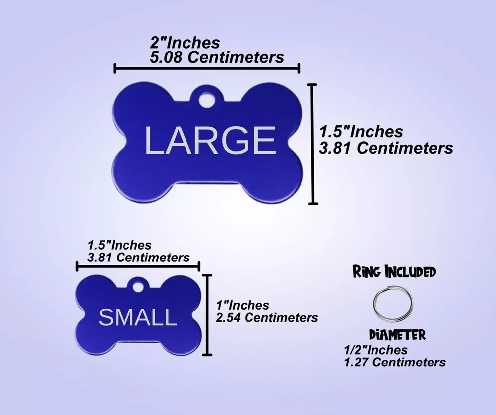 CUSTOM ENGRAVED PERSONALIZED PET TAG ID DOG CAT NAME TAGS DOUBLE SIDE. Condition is "New". Shipped with USPS First Class. Small Tag Size: 1 inch x 1.5 inches x .039 inches thick or 25.4 mm x 38.1 mm x 1 mm thick (see picture) Ring Size: 1/2" diameter Large Tag Size: 1.5 inch x 2.0 inches x .039 inches thick or 38.1 mm x 50.8 mm x 1 mm thick (see picture) Ring Size: 1/2" diameter BONE SHAPE TAG WITH RING INCLUDED Letters will be laser engraved, they won't fade out. 10 COLORS TO CHOOSE For engrave information please make sure to type it after you buy it. if the box to enter the info is not showing, please send message. Please use the "Message to Seller" to let us know as follows" -front side - (letters or numbers you want us to engrave) -back side - (letters or numbers you want us to engrave) (the FEWER letters you use the BIGGER AND CLEAR the engrave will be) If order its placed during business hours before noon, please gave us a couple of hours to do the engrave and we will take it to mail box same day , if the order its placed at night, at afternoon or over the weekend we will take it to the post office on the next business hours. Regular addresses allow 3 to 5 days for delivery. Non regular may take up to 15 days It will be shipped in a letter size envelope Via USPS First Class Mail. Tracking Number will be provided only when buying 6 or more tags. Local pick up? Ok.