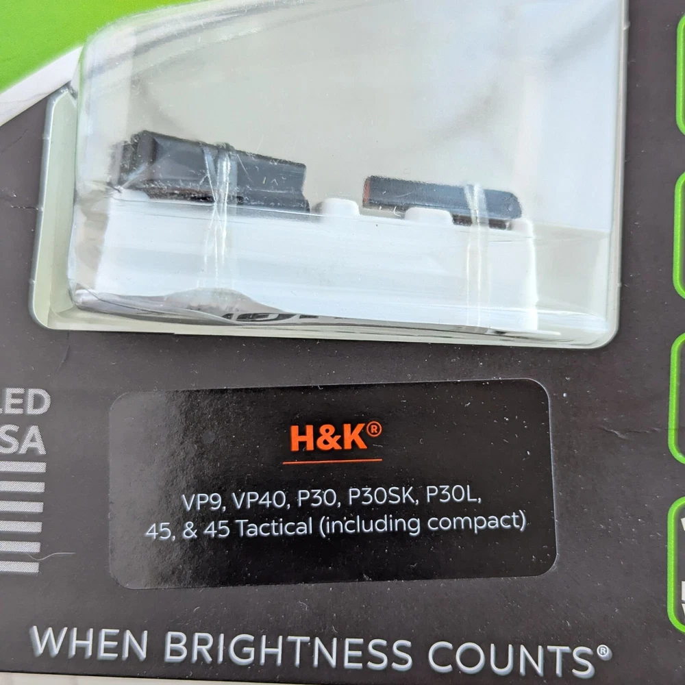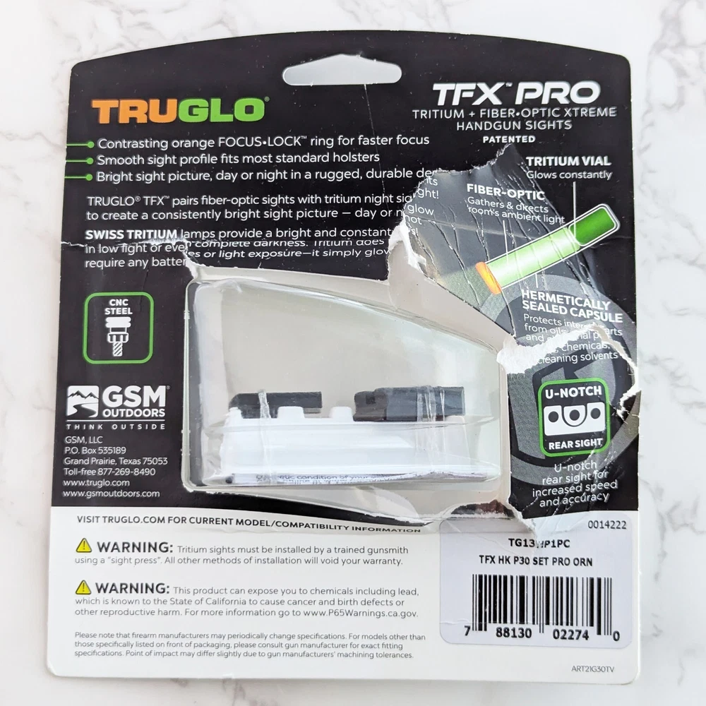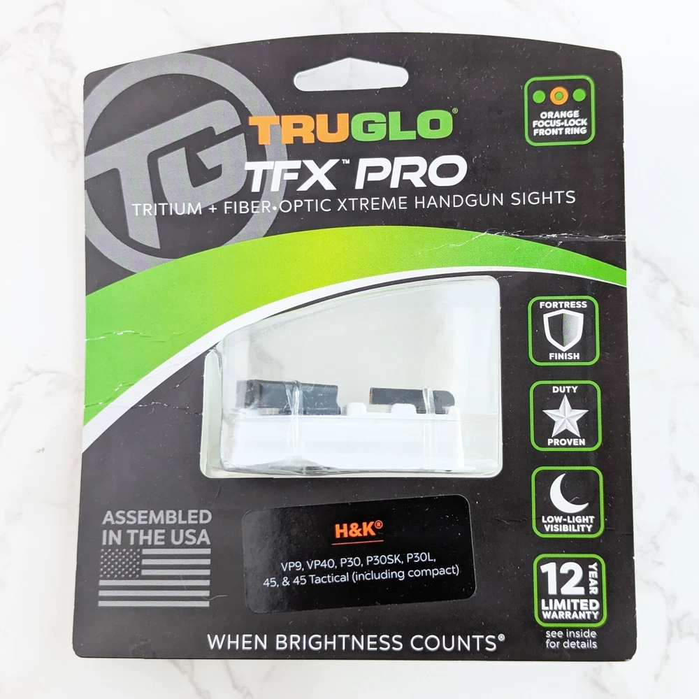 DESCRIPTION ✨ TruGlo TFX® PRO Tritium / Fiber-Optic Sights ✨ NOTE: This is a customer return. The package has been ripped open. Sights are in good condition (see pictures). Sold AS-IS No Returns For H&K®VP9, VP40, P30SK, P30L, 45, & 45 Tactical (including compact) Glowing bright both day and night, TFX® Pro sights are always ready. TFX Pro takes TruGlo's award-winning Tritium + Fiber-Optic technology even further with all the features like a compact snag-free design, longer sight radius, and amazingly durable construction built to handle just about anything. Details : Fits H&K®VP9, VP40, P30SK, P30L, 45, & 45 Tactical (including compact) Contrasting orange colored front sight ring for fast focus Fully protected TFO® technology encapsulated in a virtually indestructible capsule Impervious to oils, chemicals, cleaning solvents, and ultra-sonic cleaning processes Glows in the dark – no batteries or light exposure required FORTRESS FINISH™ nitride protective coating Assembled in USA with quality Swiss tritium for maximum brightness SHIPPING INFORMATION Shipping Rates & Terms Shipping is FREE and includes Tracking Information. Orders are usually processed and shipped within 5 business days, depending on the item. Delivery usually take 2-7 business days depending on the shipping method and your location. Orders are shipped through either USPS, Fedex or UPS, depending on the item. We only ship to within the U.S. PAYMENT INFORMATION We accept the following payment methods, which are offered at eBay Checkout including PayPal, PayPal Credit, Credit Card or Debit Card, Apple Pay & Google Pay. Sales tax is charged and collected by eBay depending on your location. RETURNS This item is sold as-is, final sale. No Returns.