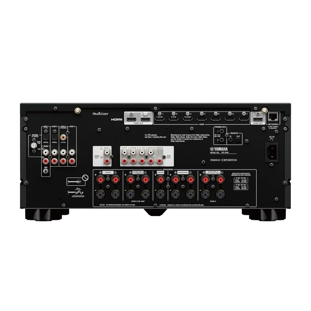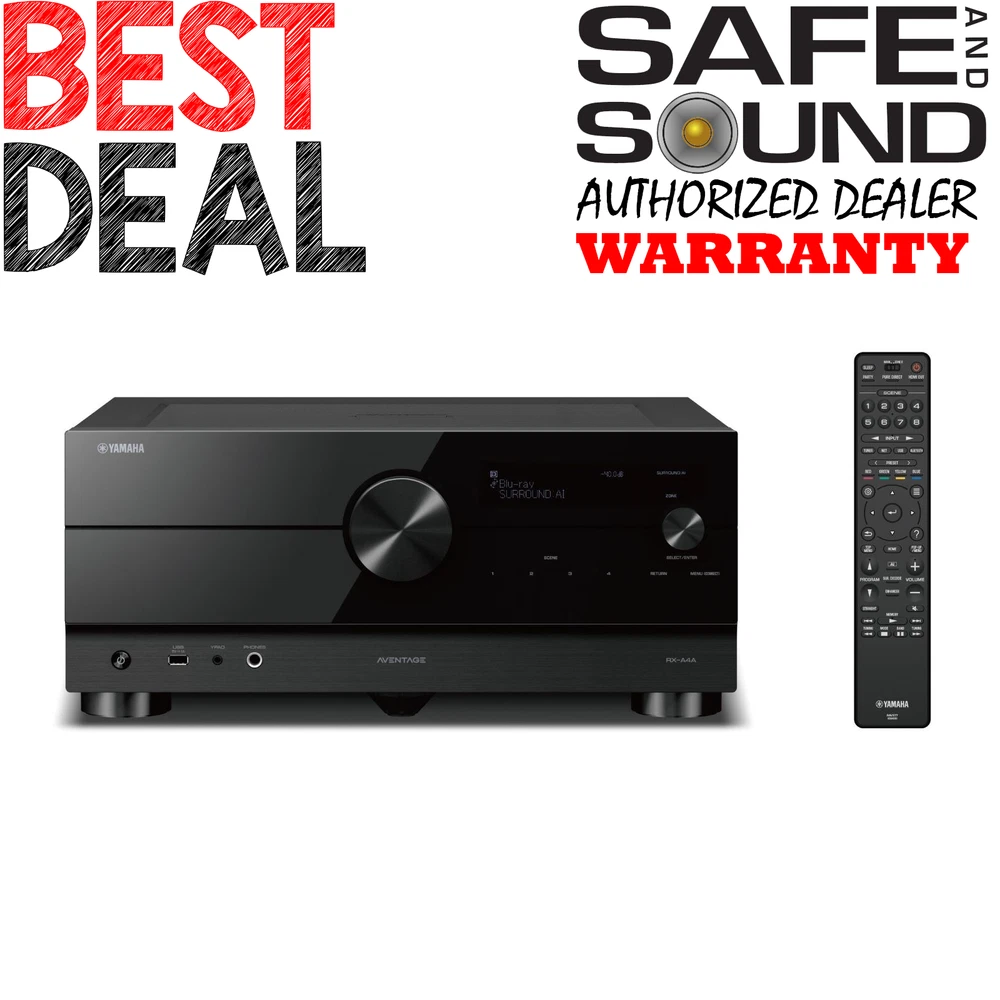 eBay Store Design by OCDesignsOnline Architectural Speakers A/V Receivers A/V Preamp Processors Amplifiers BluRay Players Bookshelf Speakers Cables / Accessories Center Channel Speakers Floor Standing Speakers Headphones / Portable Audio Home Audio Packages Multi-Zone Audio Outdoor Speakers Subwoofers Soundbars Accessories Amplifiers CD Players DACs Integrated Amplifiers Phono Cartirdges Preamplifiers Turntables Two Channel Packages Amplifiers Cables / Accessories Double Din Video / Navigation Double Din Stereo Single Din Stereo Speakers & Subwoofers Menu ... Home audio and video Two channel hifi Car audio and video Trade in used products YAMAHA RX-A4A 7.2 CHANNEL AV RECEIVER What's included YAMAHA RX-A4A 7.2 CHANNEL AV RECEIVER Customer Return item - less than 30 Days old. This unit is thoroughly inspected by our team of experts to ensure it comes with the original accessories and packaging and is in 100% working condition. A Customer Return item item may show slight signs of wear. $974.99 Expert hotline Click Thumbnails to Enlarge Product description Feel your walls melt away. The A4A delivers realistic sound and video that transports you out of your home and into your favorite movie. Whether you’re watching, listening or gaming, you’ll feel completely immersed. 7.2-channel 110-Watt powerful surround sound with Zone 2 4K120 and 8K60 HDMI and HDR10+ (with future update) with HDCP 2.3 and eARC (7 in/3 out) Dolby Atmos ® with Dolby Atmos Height Virtualization and DTS:X ® with CINEMA DSP HD3 ESS SABRE ES9007S Premier Audio DAC for high performance conversion YPAO ™ - R.S.C. with 3D, multipoint measurement, precision EQ and low frequency mode Surround:AI ™ technology automatically optimizes the sound and effects in real-time ALLM, VRR, QFT, QMS (with future update) and Dolby Vision ™ , Hybrid-Log Gamma and BT.2020 Wi-Fi, Bluetooth ® , MusicCast multi-room audio, AirPlay 2 and Spotify Connect Voice control with Amazon Alexa, Siri ® (via AirPlay 2) and Google Assistant Pandora ® , Spotify, Napster, SiriusXM, TIDAL, Deezer, Qobuz, Amazon Music HD 3rd-party control driver-capable, easy IP set-up and remote IP control Phono input The Benchmark for AV Receivers AVENTAGE AV receivers are the reference standard to which all others are compared. Passionate engineering and meticulous attention to detail produce the Yamaha hallmark of True Sound. You can feel the quality in the design and fabrication – from every electrical path, component and piece of material. Each element was scrutinized with intense detail to produce the finest, first-class performance. The AVENTAGE AV receiver is a work of visual and acoustic art. SURROUND:AI™ Artificial intelligence (AI) technology built into the DSP analyzes the scene of the entertainment content and then creates the optimal surround effect to reproduce it with the ultimate impact. This AI instantaneously analyzes scenes by focusing on distinct sound elements such as dialogue, background music, ambient sounds and sound effects, and automatically optimizes the surround effect in real time. Imagine having a Yamaha sound engineer listening right next to you, tuning the best sound live and specifically for you. AI technology creates a compelling sense of realism with expressive power beyond conventional sound field effects, giving you the most profound entertainment experience possible. Qualcomm® QCS407 with 64-bit high precision processing delivers precise surround sound. Cinema DSP HD3 for Movie, Music and Games This Yamaha flagship 3D sound field playback technology was created by combining actual measured sound field data with cutting edge digital signal processing technology. The revamped CINEMA DSP HD3 features new signal processing algorithms and maximizes theater sound effects, accurately reproducing a new dimension of realism for a sound field with a rich sense of presence and no feeling of boundaries. By using front, center and surround speakers to create a rear virtual speaker, CINEMA DSP HD3 playback of up to 11.1 channels is possible* even with a 7.1-channel speaker configuration. *Requires connection to a front presence speaker. Dolby Atmos® and Dolby Atmos Height Virtualization Feel every dimension in Dolby Atmos. Enjoy a 5.1 surround speaker system and two additional overhead speakers or two Dolby Atmos elevation speakers, delivering dramatic overhead effects for truly enveloping audio. For those without in-ceiling or upward firing speakers in their system, Dolby Atmos Height Virtualization technology can simulate the Atmos experience. Configure up to five speakers to replicate the effect of two in-ceiling speakers, or utilize all seven channels to simulate the powerful effect of four overhead speakers. DTS:X® DTS:X immersive audio formatting places sound where it would naturally occur in space, creating life-like, multi-dimensional audio. The included spatial remapping engine of DTS Neural:X™ offers improved immersion and heightened realism in all your favorite movies. Compressed Music Enhancer When music is encoded into a digitally compressed format like MP3, the frequency response suffers. The Yamaha Compressed Music Enhancer employs sophisticated digital signal processing using exclusive algorithms to restore what was lost, so the music always sounds the way it should. High Slew Rate Amplifier The slew rate measures how quickly an amplifier can respond to a rapid change of input level, which contributes to delivering a precise signal transmission and is especially effective with high resolution audio signals. This newly designed circuit achieves both a high slew rate and stable signal transmission, allowing it to handle each audio signal with precision and accuracy. High-Quality Digital Components The Qualcomm® QCS407 is designed to provide truly superior audio performance, with support for Dolby Atmos and DTS:X immersive home audio, as well as a dedicated high-performance audio DSP. Incorporating the SABRE ES9007S Premi
