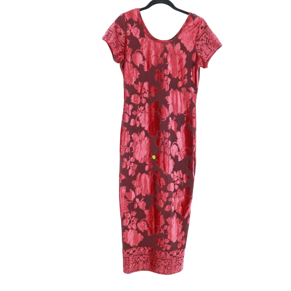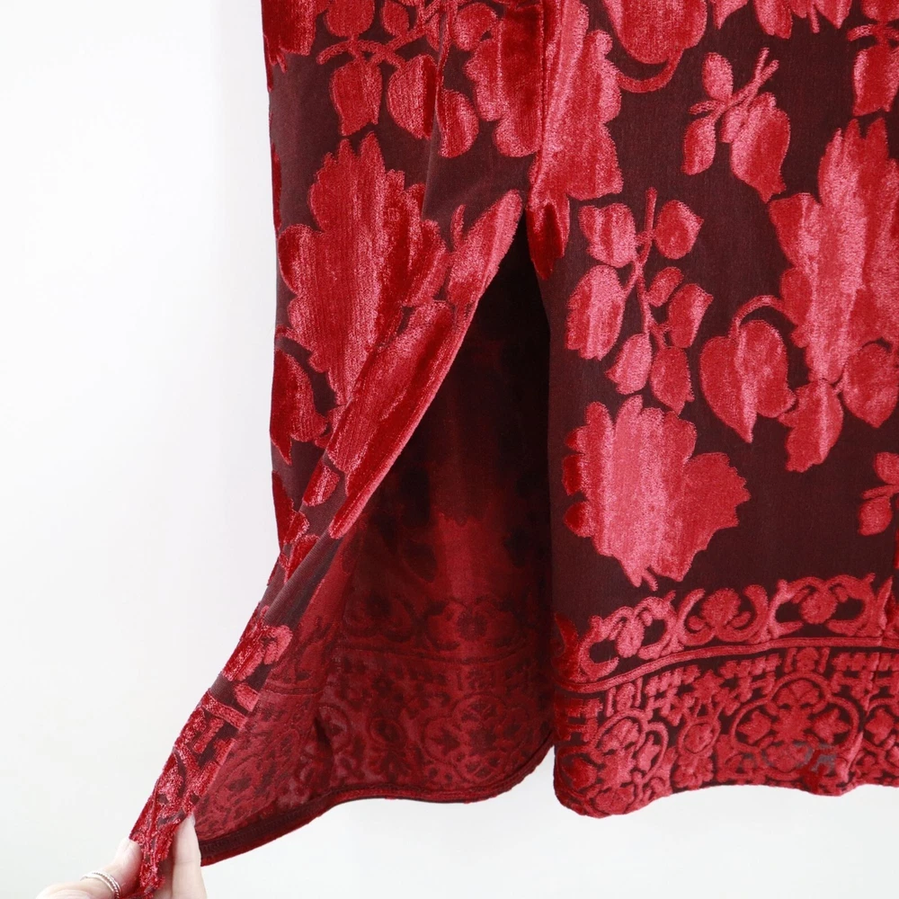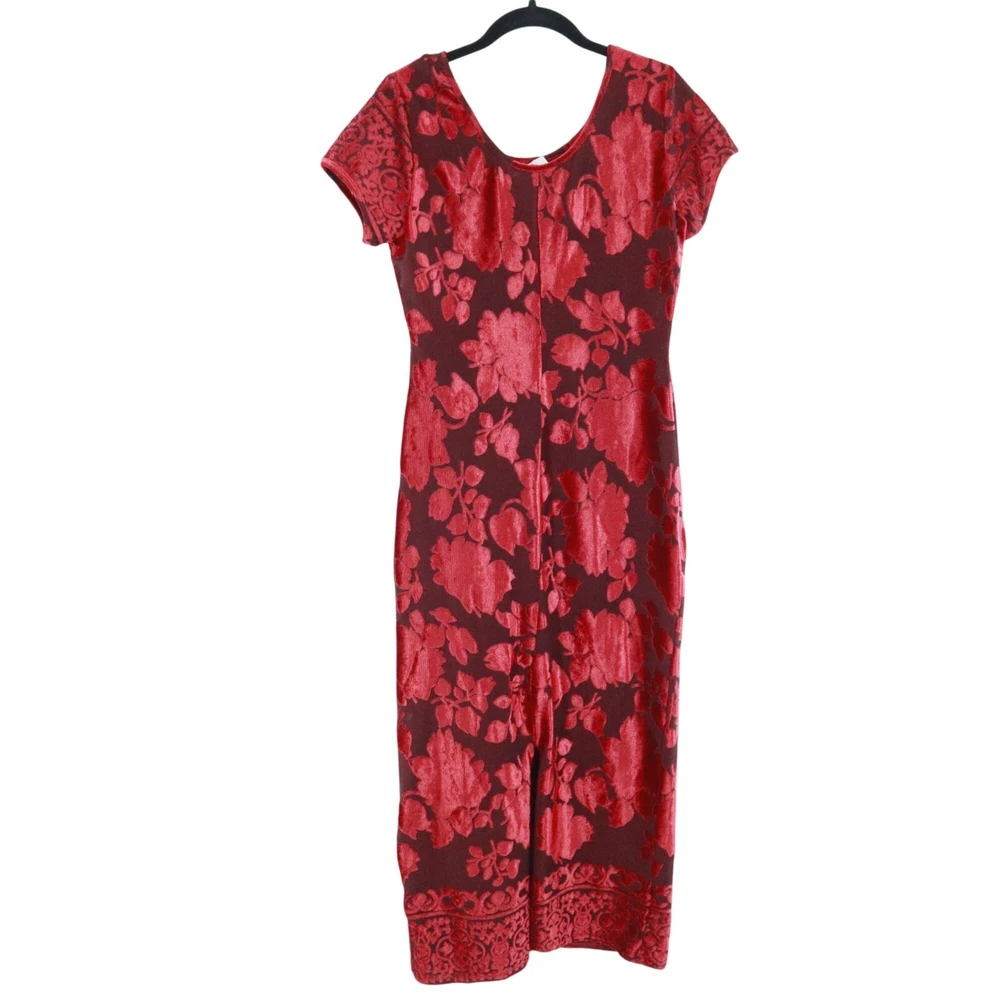 Step out in this dress and watch as heads turn faster than a whirling dervish at a disco party. The floral burnout velvet design makes you look like a walking bouquet, perfect for those who want to bring a touch of whimsy to their wardrobe. • Short sleeves • Floral burnout velvet • Scoop neckline • Long length • Intricate hem design • Ideal for evening wear, cocktail party and special events Features: y2k, vintage, burnout velvet, gypsy, whimsigoth, boho, dark feminine, floral, bohemian, brunch, elegant, classic, retro, formal, events, evening wear, party, cocktail Size: Womens MP Condition: Pre-Owned Good Great pre-owned condition, see photos for details. No size or material tags, use measurements. Tiny snag on front and snag on back.
