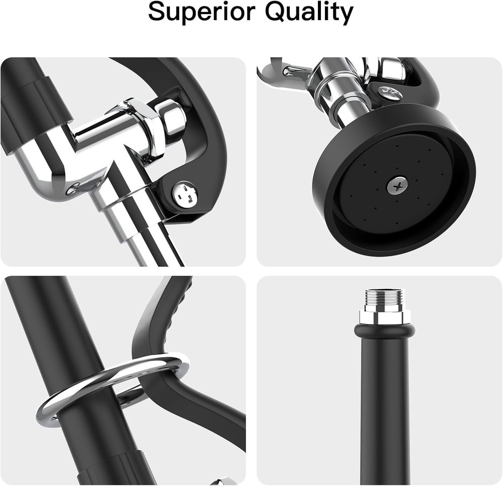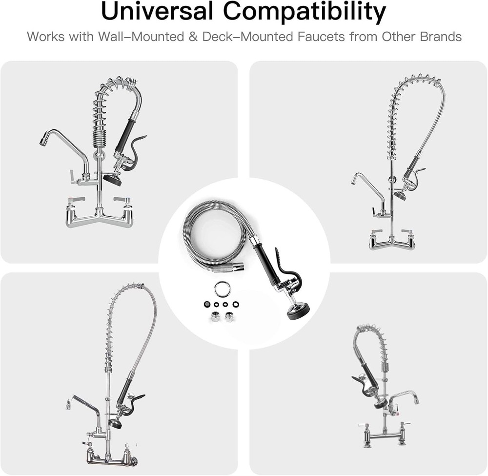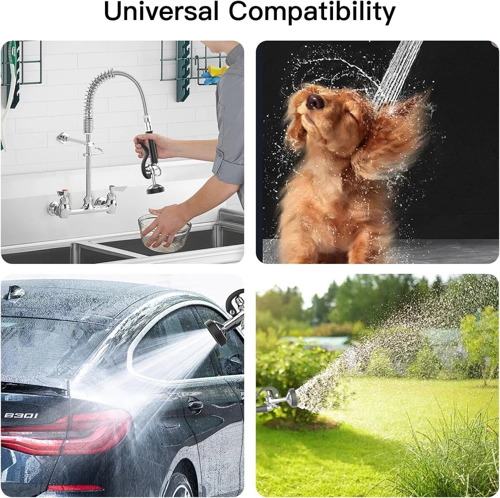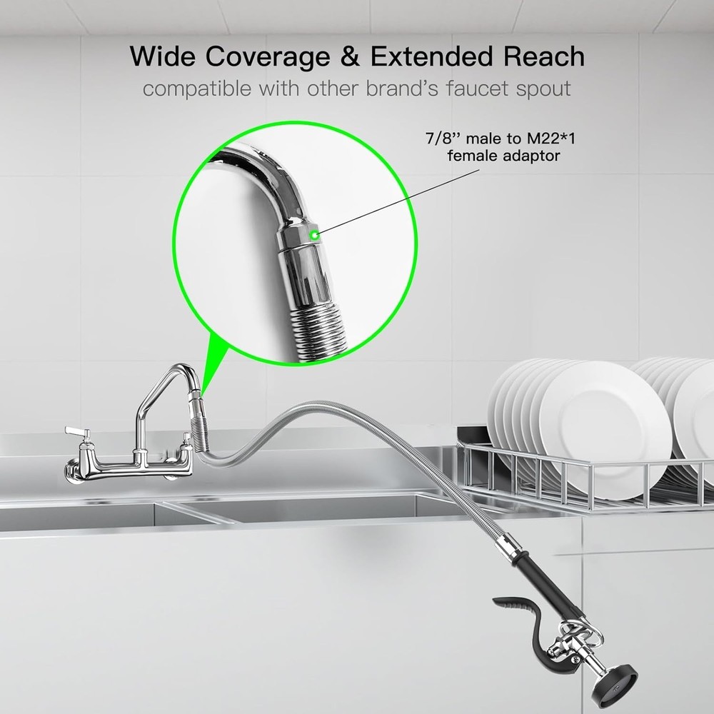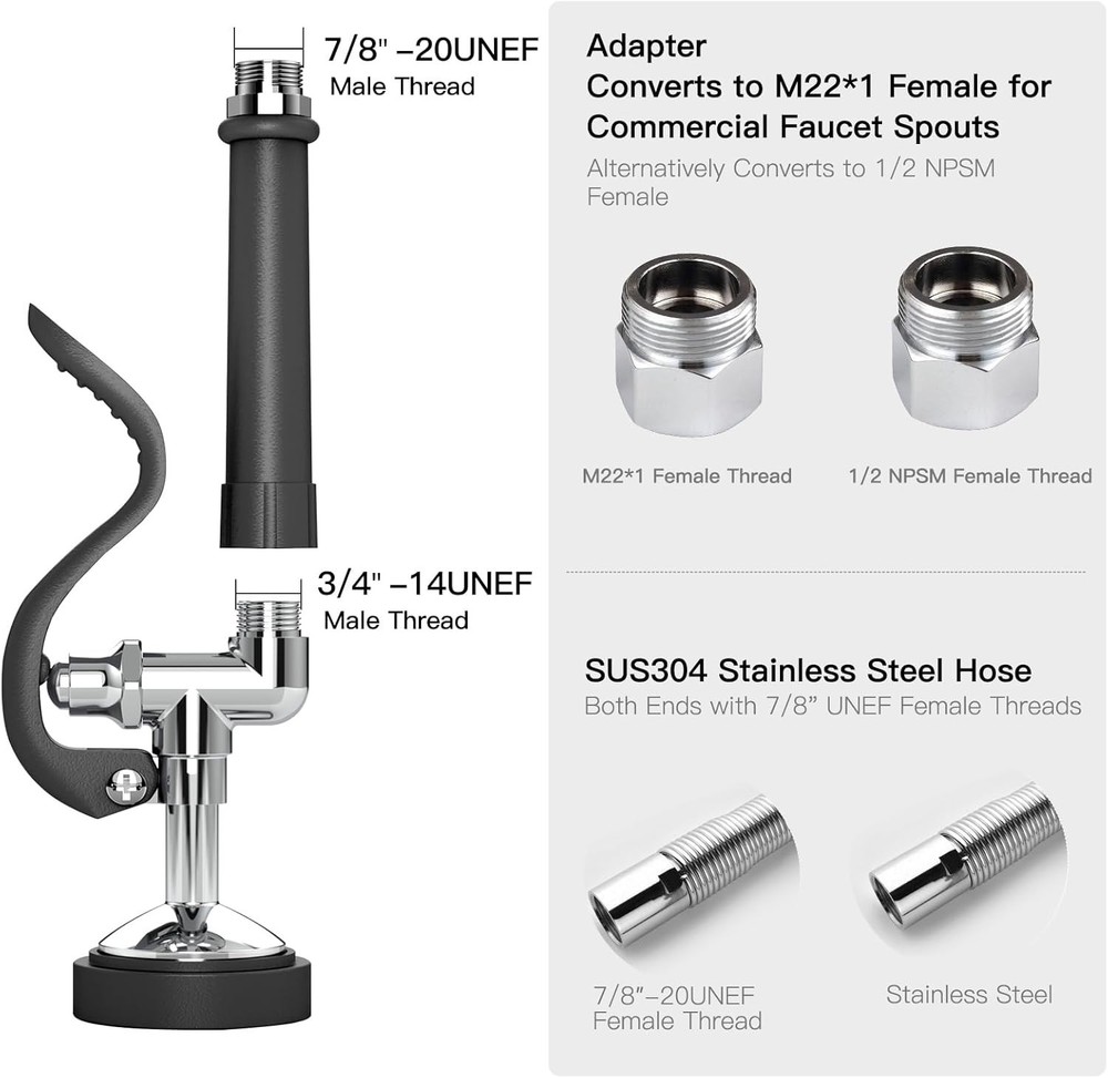 【Versatile Pre-Rinse Sprayer】This pre-rinse sprayer is designed for restaurants, cafes, bars, and other commercial kitchens. It is also perfect for washing sinks, floors, and even pets, making it a great choice for multiple cleaning scenarios 【Standard Compatibility with Faucets】Equipped with 7/8''-20 UNEF female threads on both ends, this sprayer works seamlessly with most commercial faucets and pre-rinse hoses. Its universal design ensures easy installation in any commercial setup 【45-Inch Pre-Rinse Hose】The 45-inch stainless steel pre-rinse hose provides excellent flexibility and reach, making it easy to clean large sinks and hard-to-reach areas. The rust-resistant construction prevents leaks and supports consistent performance 【Quick Installation, No Tools Needed】Install this sprayer in minutes without the need for tools. The simple design makes maintenance and replacement fast and convenient, saving time during busy operations 【Leak-Proof Handle Design】The reinforced handle is designed for frequent use and offers a comfortable grip during cleaning tasks. Filter gaskets at the connections prevent debris buildup and ensure leak-free operation 【Complete Package for Easy Setup】The package includes a pre-rinse sprayer, a 45-inch stainless steel hose, two adapters (7/8'' male to M22*1 female and 7/8'' male to 1/2'' NPSM female), one O-ring, and four gaskets, ensuring everything you need for quick and hassle-free installation
