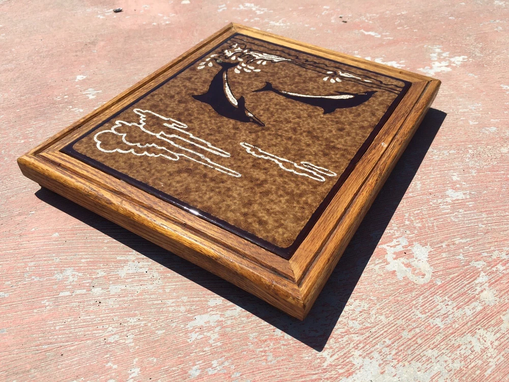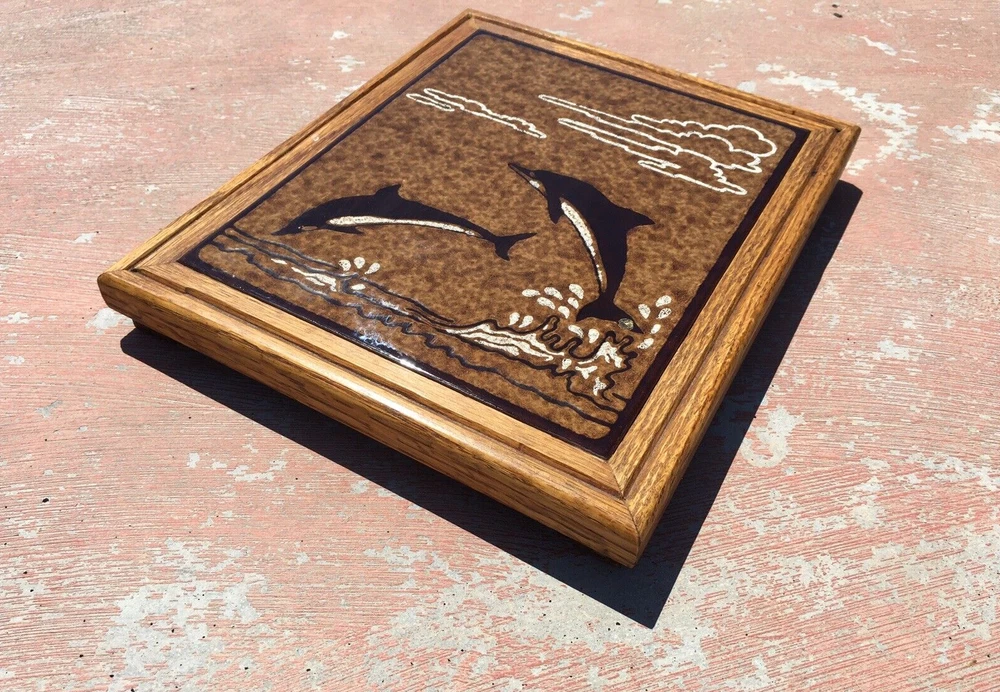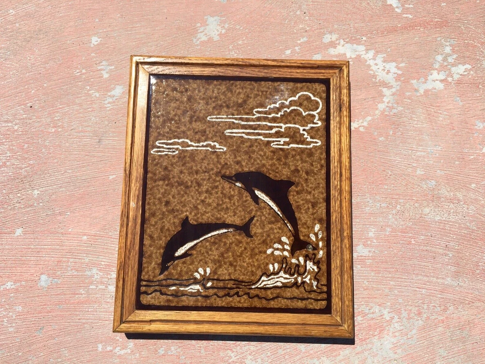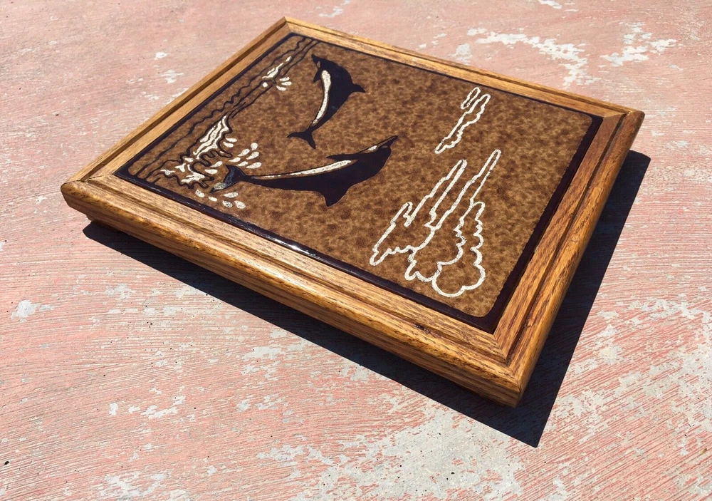 Vintage Italian Ceramic Tile Trivet Dolphins Playing Wood Frame Signed Cabbiani 1992 in excellent condition as can be seen in attached photos. Measures 11 3/4 x 9 3/4 x 1 3/4" footed with felt to prevent scratching to surfaces. Please review all actual item pictures to further describe condition and to show any other imperfections. Comes from a smoke free, pet free home. Along with "recycling" items of yesteryear, I emphasize the importance of environmental safety and not abusing our Earth's natural resources. Recycled materials may be used when packing merchandise and will not compromise the integrity of safe delivery.