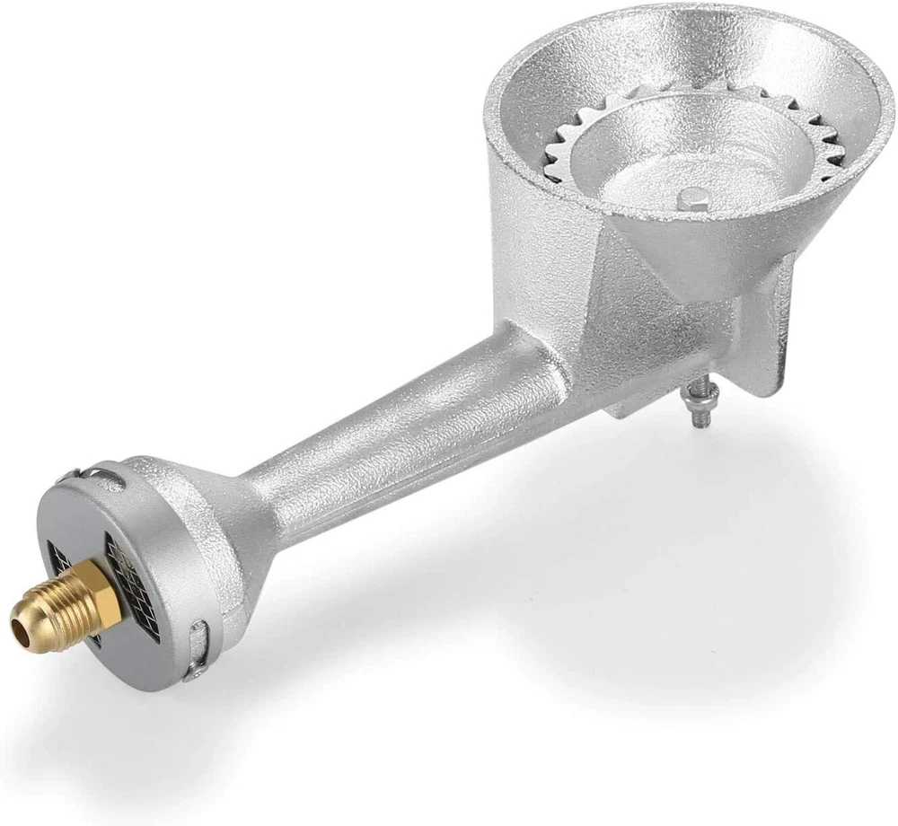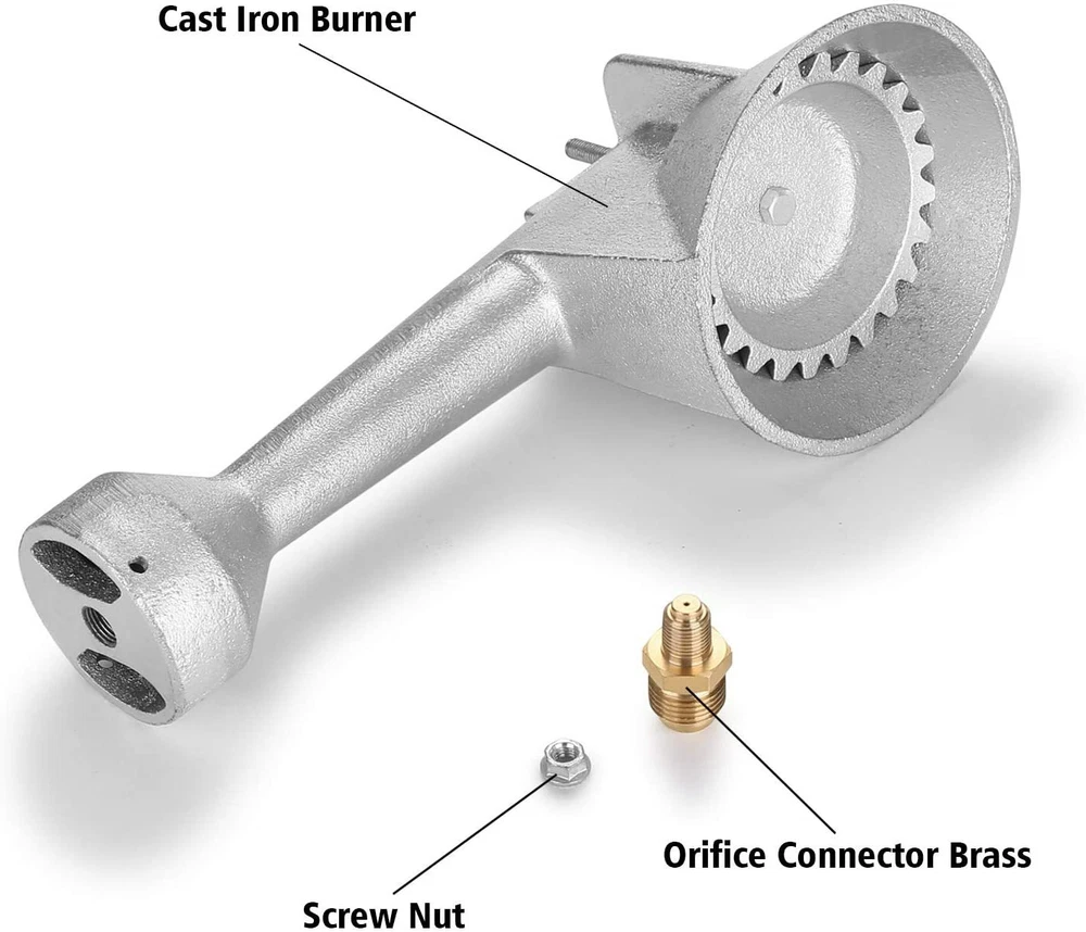 eBay High Pressure Propane Cast-Iron Round Burner Head, Propane Burner Head with Orifice Brass Fitting Universal Cast-Iron Round Burner Head: It is made of high quality cast iron and has better heat resistance than conventional aluminum burners. It also has air shutter for better ventilation to the propane can thorough combustion. You can use it with high pressure or low pressure regulators. Built in Air Shutter: It also has air shutter for better ventilation to the propane can thorough combustion and prevent your griddle, pot and all other coolwares from darkspotting. Brass Fitting: 3/8" flare M x 1/8" MNPT high quality brass. Application: Fits most propane grill, stove, smoker, burner, heater, fireplace, fire pit, cooker, turkey fryers, torches and variety of high pressure appliances. Attention: It can only be used for propane. And it is suitable for high pressure system. Please do not use for low pressure equipment to prevent damage to your low pressure equipment. Product Specification This product is 65000 BTUs. Propane Burner Head : Material: High quality Cast Iron Negotiability: Air Shutter can control the amount of air coming in. Brass Fitting : Material: High Quality Brass Size: 3/8" flare M x 1/8" MNPT NOTE! To be used with Propane Only.