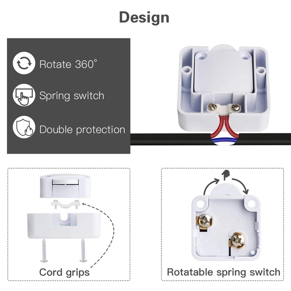 Cabinet Lamp Switch, 2 Pack Wardrobe Touch White Switches, Normally Closed Wardrobe Touch Switch, for Close Open Door Drawers On Off Light Switch (Pack of 2-White) Material: The cabinet lamp switch is made of PC Flame Retardant, ensure the reliability and durability of the switch. Size: 52x50x18mm/2.05x1.97x0.71in.Maximum current: 2A. Maximum voltage: 250V. Design: The exterior is a white plastic cap , and the interior is a scroll switch design. The wardrobe touch switch is equipped with a cord grips and screws for better fixing. Working principle: When the door or window is open, if the switch is not pressed, the light will be on; when the door or window is closed, the switch is pressed and the light will be off.Specific installation method, please see the 5th picture. Application: Used in various lighting fixtures with power cord control wardrobe door, cupboard doors, sliding doors, hotel wardrobe, cupboards etc. ❆Cabinet Lamp Switch Product Description:❆ When the door or window is open, the contact will give an open signal, light on and when the door is closed the contact will give a closed (circuit) signal, light off. Specific installation method, please see the 5th picture. Used in various lighting fixtures with power cord control wardrobe door, cupboard doors, sliding doors, hotel wardrobe, cupboards etc. ❆Specification:❆ Product Name: Cabinet Lamp Switch. Material: PC Flame Retardant Maximum current: 2A Maximum voltage: 250V Size:52x50x18mm/2.05x1.97x0.71in Package Contents:❆ 2 x Cabinet Lamp Switch 2 x Plastic Caps 2 x Cord Grips 8 x Screws ❆After-sale: ❆ The cabinet lamp switch is backed by our unlimited 2-year warranty, please email us for fast replacements or refunds if there has any product issue. SHIPPING - We offer FREE shipping on all orders! - We ship within 3 business days of payment, usually sooner - We use a selection of shipping services such as UPS, FedEx, USPS etc - We only ship to the lower 48 states, no APO/FPO addresses or PO Boxes allowed International buyers – please note: Import duties, taxes, and charges aren't included in the item price or postage cost. These charges are the buyer's responsibility. - Please check with your country's customs office to determine what these additional costs will be prior to bidding or buying. - We have confidence in our products, but if you are not fully satisfied please contact us within 30 days of purchase and you will get full refund. * Order Cancellation Policy ** You can return a product for up to 30 days from the date you purchased it. 1. The seller reserves the right to cancel the special case only due to eBay cancellation fee. 2. The decision of seller is the final. 3. The seller will respond to the cancellation request within 2 business days. Please wait for the result of cancellation. 4. In case the cancellation is not completed by some reasons, the buyer can follow the options below to get the refund. 4.1 The buyer can reject the item when it arrives. 4.2 The buyer can send the item back to the seller within 30 days If the buyer receives item (USA Shipment ONLY). The seller will provide the FREE return label to the buyer when the buyer opens " Return Item" case on eBay by using the reason as "Change my mind" ONLY. 5. When buyer has placed the order. The order will be processed and completed by automatic warehouse system within 5 minutes. In case that buyer sends the cancellation request after 5 minutes of placing the order, the request will be rejected. **Sending direct message to cancel the order is not allowed for every case.* Return Policy For the return case - If buyer would like to return the items for refund or replacement, please CONTACT SELLER to receive the free return label from seller. The refund or replacement will be processed with the tracking number of return label which is provided by seller only. The other ways of return which are not approved by seller will not be processed for the refund or replacement. CUSTOMER SERVICE - We try our best to make sure every customer is completely satisfied. - If there's a problem, feel free to message us! - We're happy to help.
