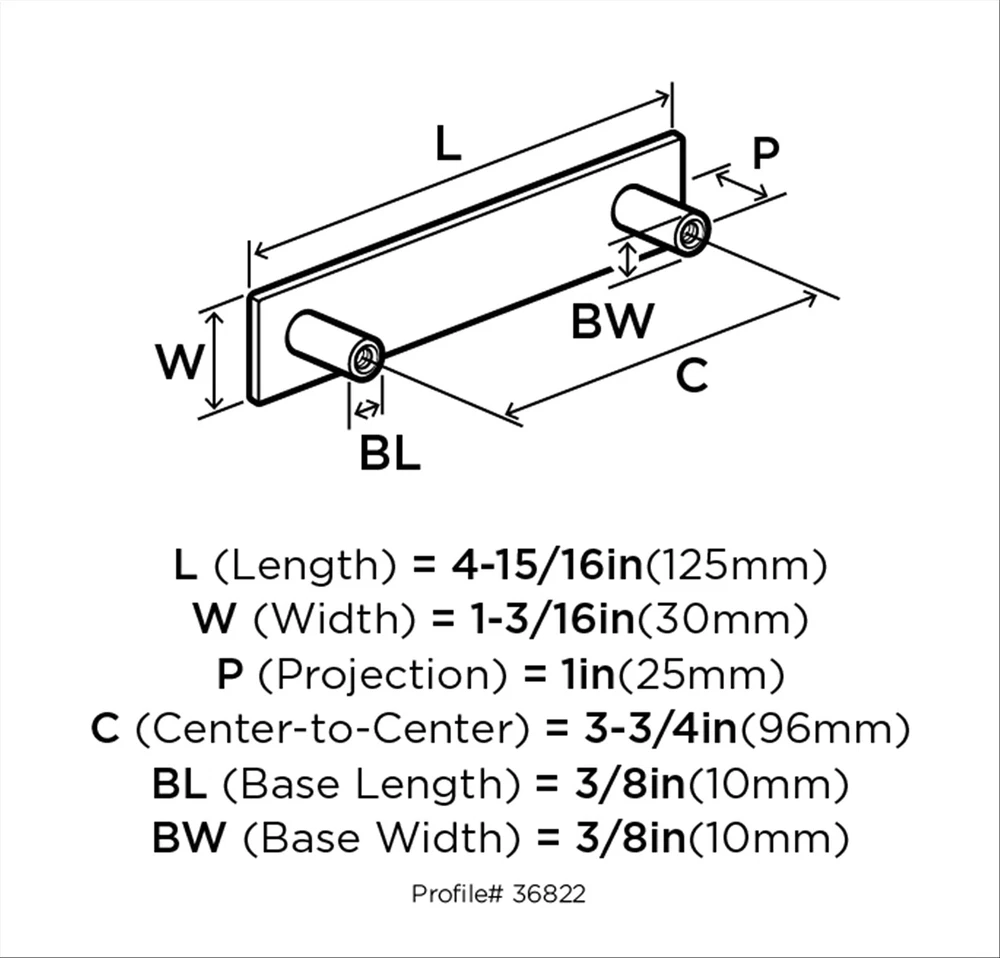 The BP36822MB Kamari 3-3/4 in (96 mm) Center-to-Center Pull is finished in Matte Black. Drawing inspiration from the sand patterns found on exotic volcanic beaches, the Kamari collection features a scalloped surface that adds a high-end designer look to any cabinet or drawer. The backdrop of starred skies and elegant evenings, black can be unmistakably striking. Matte Black adds a simple, yet bold statement to any room. Founded in 1928, ’s award-winning home solutions including decorative and functional cabinet hardware, bath accessories, decorative hooks and wall plates have built the company’s reputation for chic design accessories that inspire homeowners to express their personal style. offers a variety of styles and finishes at affordable prices that add the perfect finishing touch to any room. VERSATILE - Contemporary style adds an easy designer upgrade to any cabinet drawer, cabinet door or furniture piece DURABLE - High quality construction for lifelong durability CONVENIENT - Mounting hardware included for quick and easy installation - Coordinates seamlessly with finishes from popular plumbing and lighting brands DISCLAIMER - We do our best to show colors accurately, but they might look different on your screen due to individual monitor settings