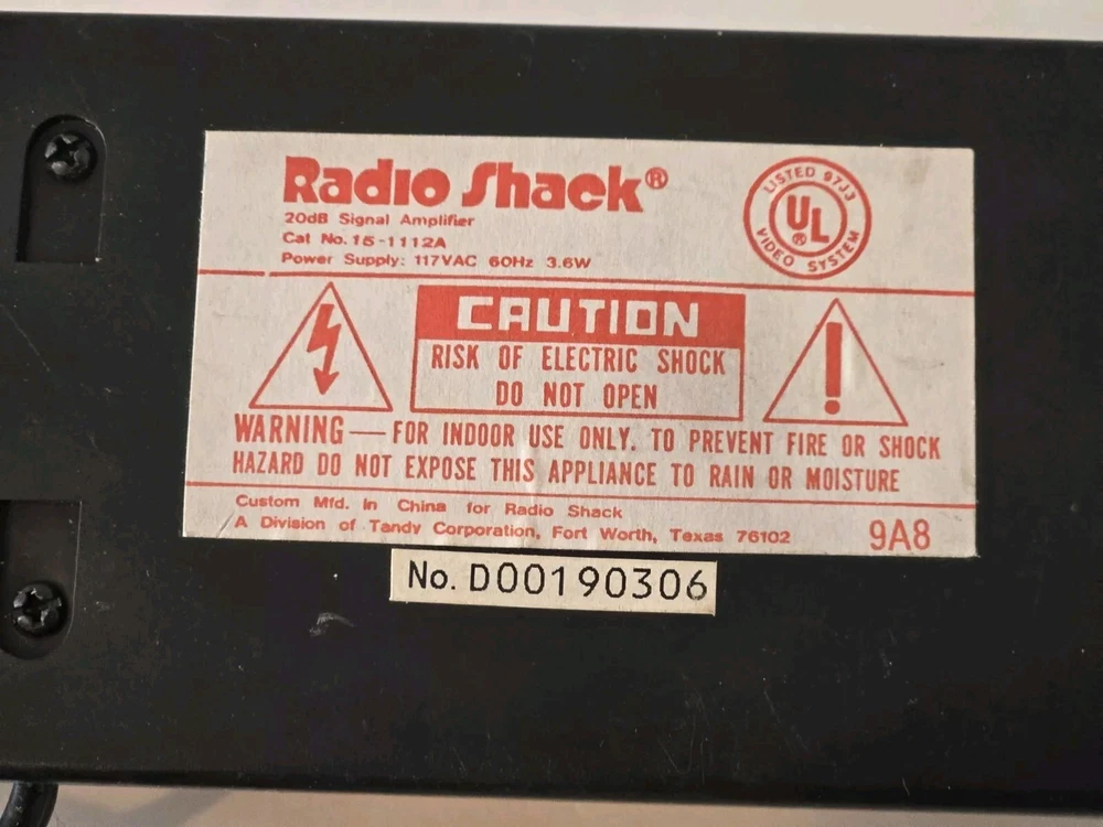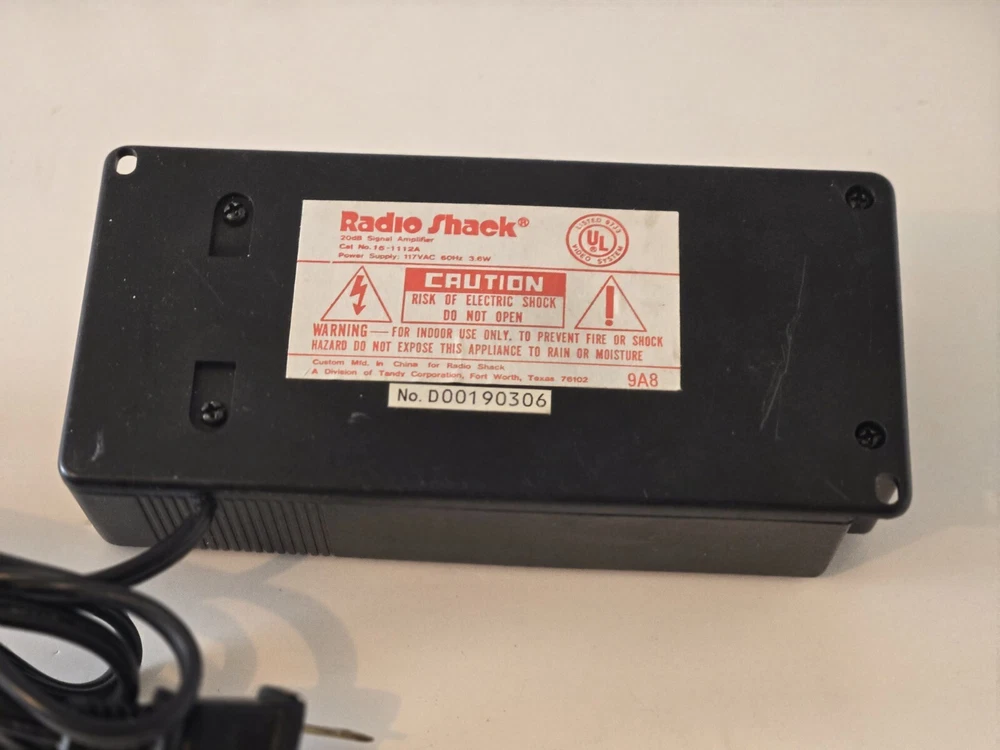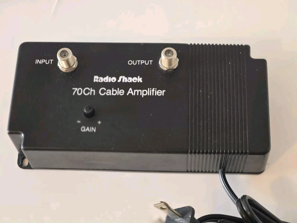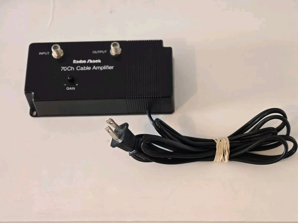 Cable Amplifier Radio Shack Brand 70 CH 20 dB Signal, Black, Cat No 15-1112A Enhance your cable TV signal with this high-quality cable amplifier from RadioShack. This unit is designed to boost the weak VHF and UHF signals and provide a clear and stable output. With a power of 117VAC 60Hz 3.6W, this unit is compatible with various cable products and has one input and one output. The black color and sleek design make it a perfect addition to any home entertainment setup. The RadioShack 15-1112A cable amplifier is a reliable and efficient solution for improving your cable TV reception. It is suitable for use with VHF and UHF signals and has a signal gain of 20dB. This unit is easy to install and use and is a great addition to any home entertainment setup.