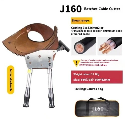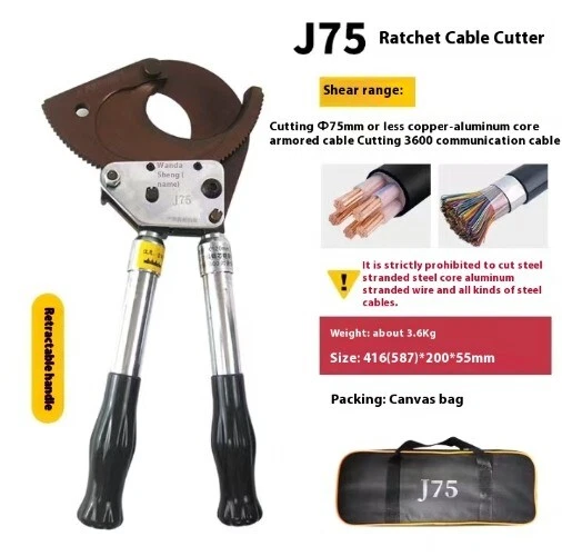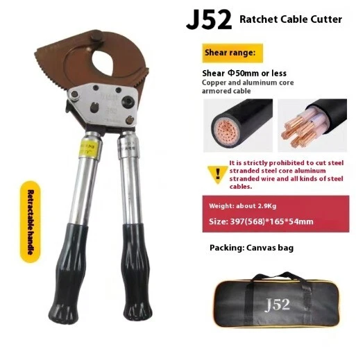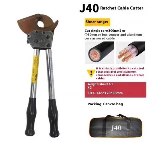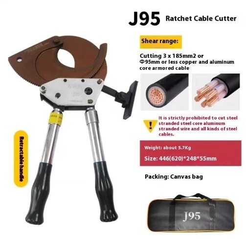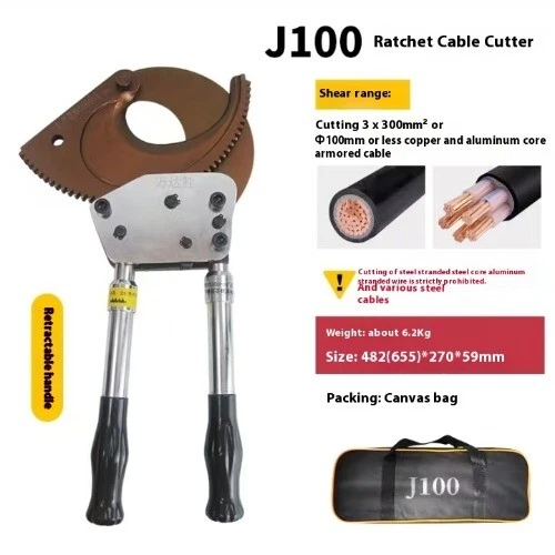 Cable Special Scissors Copper Aluminum Armored Wire Cutting Pliers Industrial Grade J100 Ratchet Cable Cutter Cutting range. Cutting 3X300mm2 or 100mm in the following copper-aluminum core armored cable Strictly prohibited to cut steel stranded steel core aluminum stranded wire and a variety of steel cable Weight: about 6.5Kg Size: 482(655)*270*59mm Packing: canvas bag eBay