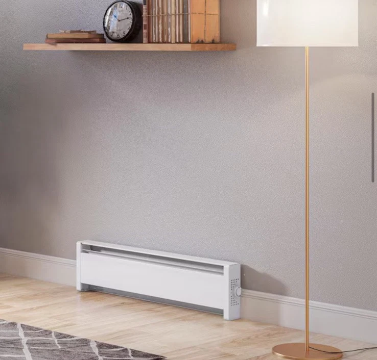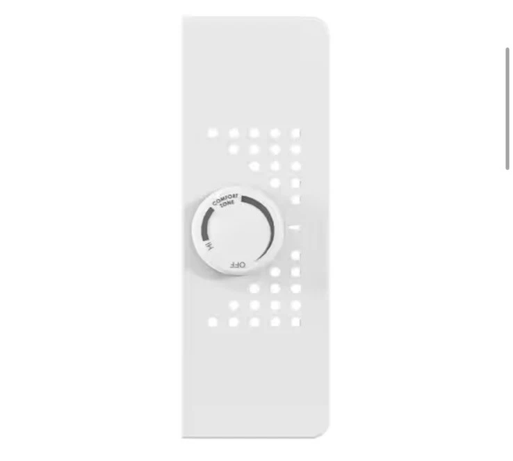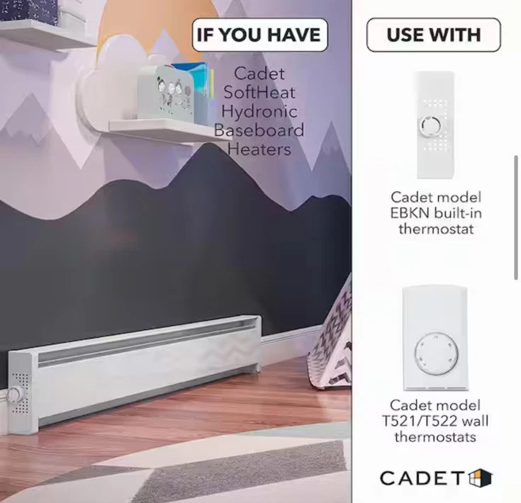 Easy to install and operate, this Cadet SoftHeat baseboard-mount double-pole thermostat provides simple temperature control. Designed exclusively to fit on Cadet EBHN hydronic baseboard heaters, this thermostat can be mounted to either end of the heater and fits seamlessly onto the heater as an endcap. A large, twist-dial knob adjusts smoothly and features a low position and additionally an off setting for added peace of mind. Provides built-in temperature control on the baseboard heater, eliminating the need for a wall thermostat and additional wiring Compatible with all voltages of SoftHeat EBHN hydronic electric baseboard heaters only Seamlessly mounts to either end of a SoftHeat EBHN hydronic baseboard heater Simple 4-wire installation (double-pole) and includes an off setting 25 Amp Temperature temperature range is 45°F - 80°F Bright white Accessory to ETL listing of Cadet SoftHeat electric baseboard heaters California residents see Prop 65 WARNINGS Product Information Internet # 100120925 Model # EBKNW Store SKU # 219347 E55