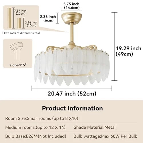 Menu 1. We require immediate payment. 2. We currently accept payment via eBay managed payments only. 3. Once payment is cleared, we will dispatch your shipment within 1-3 business days. Please refer to the "Shipping" tab for more information regarding shipping speed to your destination. Fandelier Ceiling Fan with Light, Caged Ceiling Fan with Light Semi Flush Mount, 20 Inch, Remote Control, Gold Fandalier 6 Speeds Low Profile for Girl's Bedroom, Living Room Product description Feather Ceiling Fan:Gold ceiling fan with light is made of metal and feather shaped glass. It has a modern style inspired by the white feathers on swans. This Semi-Recessed Ceiling Fan with Light has a sleek look and provides warm light Peace of Mind and Power Saving:Girls Bedroom Ceiling Light Ceiling Fan has a timed off feature that allows you to set the gold ceiling fan with lights to turn off after 1, 2, or 4 hours, so you can enjoy a sound night's sleep. This feature not only helps to save electricity, but also reduces energy costs Product upgrade:In order to better match and customer demand our design team has changed the colour scheme of the nuts from silver to brass, which I think will be more in line with the elegant and romantic bedroom style Quiet and cozy:Girls Bedroom Chandelier Ceiling Fan with a silent copper motor, 7 fan blades, and a timer that you can set to turn off after 1, 2, or 4 hours. It saves power and reduces energy costs. The fan is quiet with no annoying sounds Easy to install:Our feather chandelier ceiling fan is easy to install. The adjustable height bar (7.87" + 3.94") makes it easy to install to your favorite height. High quality gold metal fittings ensure durability and look beautiful in bedroom hallway living room kitchen Customer Service:We provide accurate after-sales service to ensure your satisfaction with our gold chandelier ceiling fans! Our professional team is available 24/7 to help with any product-related issues and ensure that you're completely satisfied with your caged ceiling fan with light gold PLEASE MESSAGE US IF YOU HAVE ANY OTHER QUESTIONS, AND MANY THANKS FOR READING ALL OF THIS. Copyright ©#. All Rights Reserved.
