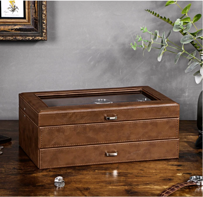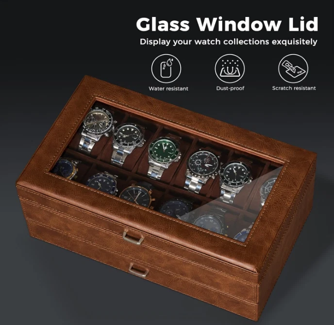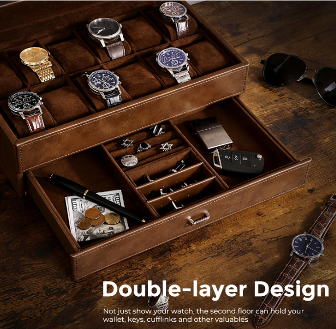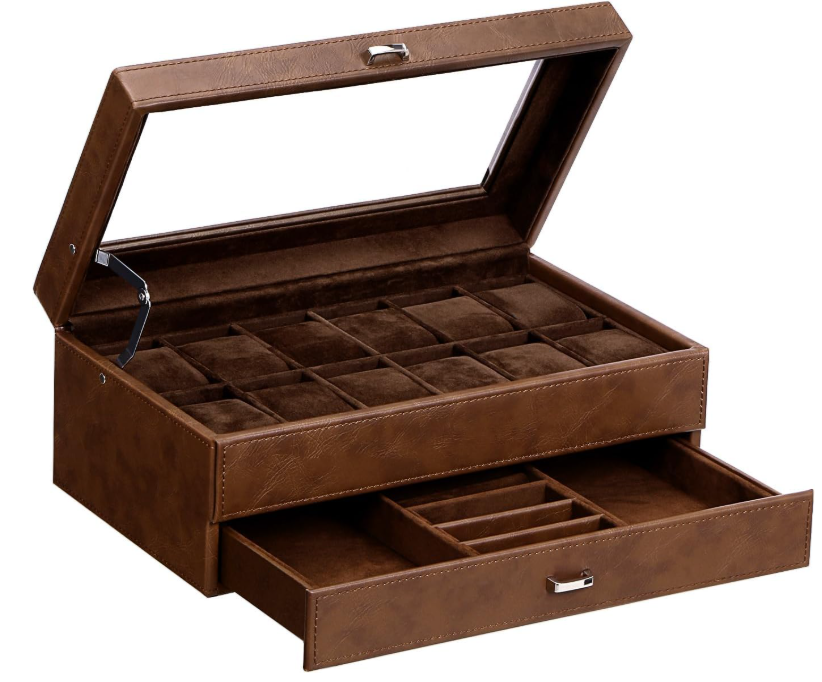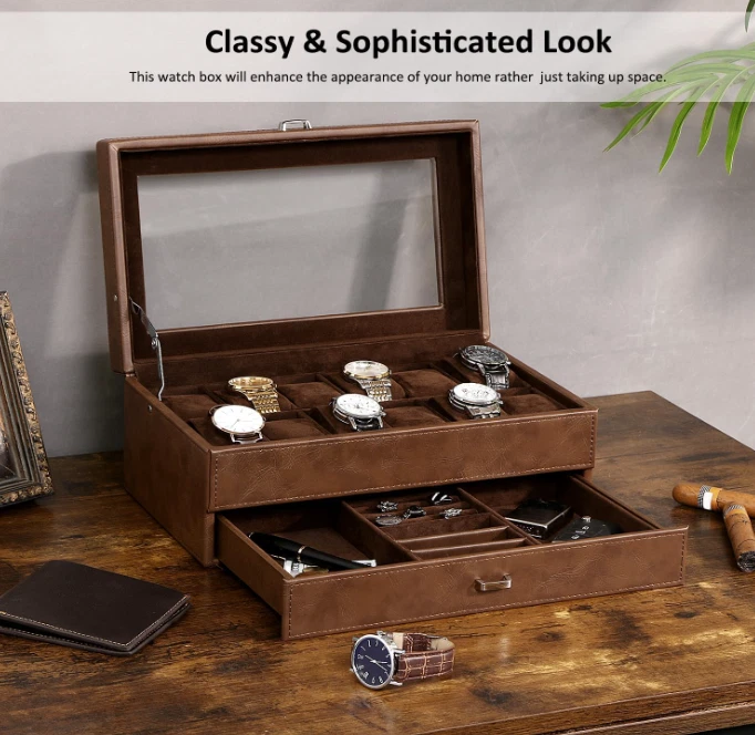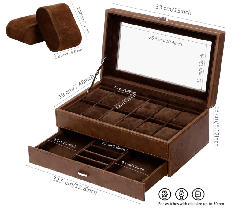 Caja organizadora para relojes con 12 ranuras, doble capa y tapa de vidrio grande ✨ El paquete incluye: 1 caja para relojes, 12 almohadas extraíbles y 1 joyero para hombre. 📌 Material: Cuero sintético + forro de franela. Ventana: Vidrio auténtico. Color: Espresso. Dimensiones de la caja: 33 x 19 x 13 cm. Ventana: 26,5 x 13 cm. Peso neto: 3 kg. 🧵 Materiales de calidad: Esta caja para relojes está hecha de cuero sintético color espresso y terciopelo suave en el interior. Su diseño clásico y moderno incluye almohadas que protegen su reloj de arañazos. Es ideal para colecciones personales, exhibición en tiendas y decoración del hogar. 🗂️ Doble capa: Esta vitrina para relojes cuenta con dos capas funcionales. La capa superior ofrece 12 compartimentos con almohadas extraíbles. El cajón inferior incluye joyero para hombre, estuche para anillos, dos tarjeteros para pendientes y dos bandejas para joyas. Perfecto para collares, pulseras, gemelos, billeteras, llaves, tarjetas y otros accesorios. 🔍 Tapa de cristal transparente: Este estuche para relojes incorpora una gran ventana de cristal transparente. Permite ver y elegir rápidamente el reloj ideal para cada ocasión. Protege contra el polvo y facilita la limpieza. 📏 Tamaño total: El estuche mide 33 x 19 x 13 cm (largo x ancho x alto). Cada almohadilla para reloj mide 4,6 x 7,2 x 3,2 cm. Apto para relojes con esferas de hasta 50 mm. 🎁 Para un ser querido: Este organizador de relojes para hombre incluye una elegante caja de regalo. Ideal para padres, madres, esposos, hijos, compañeros o amigos. Perfecto para Día del Padre, San Valentín, aniversarios, cumpleaños o graduaciones.