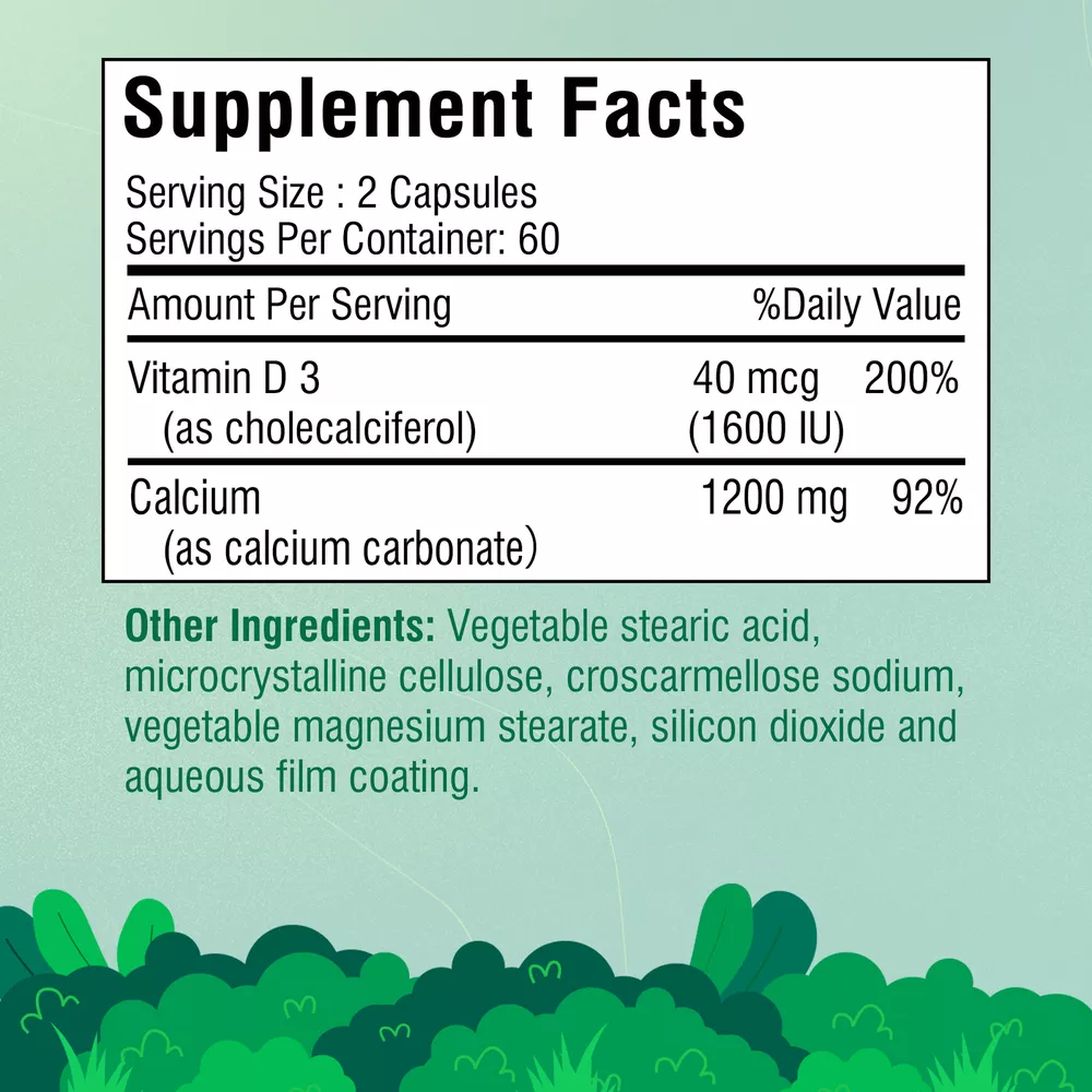Effects: Immune Support,Muscle Health Ingredients: Calcium,Vitamin D3 Directions: Take 2 capsules once daily after a meal. Shipping: Ships within 48 hours on working days. Shelf life: 2 years Description: Bone & Teeth Support: Our potent calcium carbonate formula supports strong bones and teeth health. Immune Support: Fortified with Vitamin D3, our calcium and vitamin D supplement provides potent bone and immune support. Free of gluten, wheat, yeast, milk, lactose, flavors and non-GMO. Document