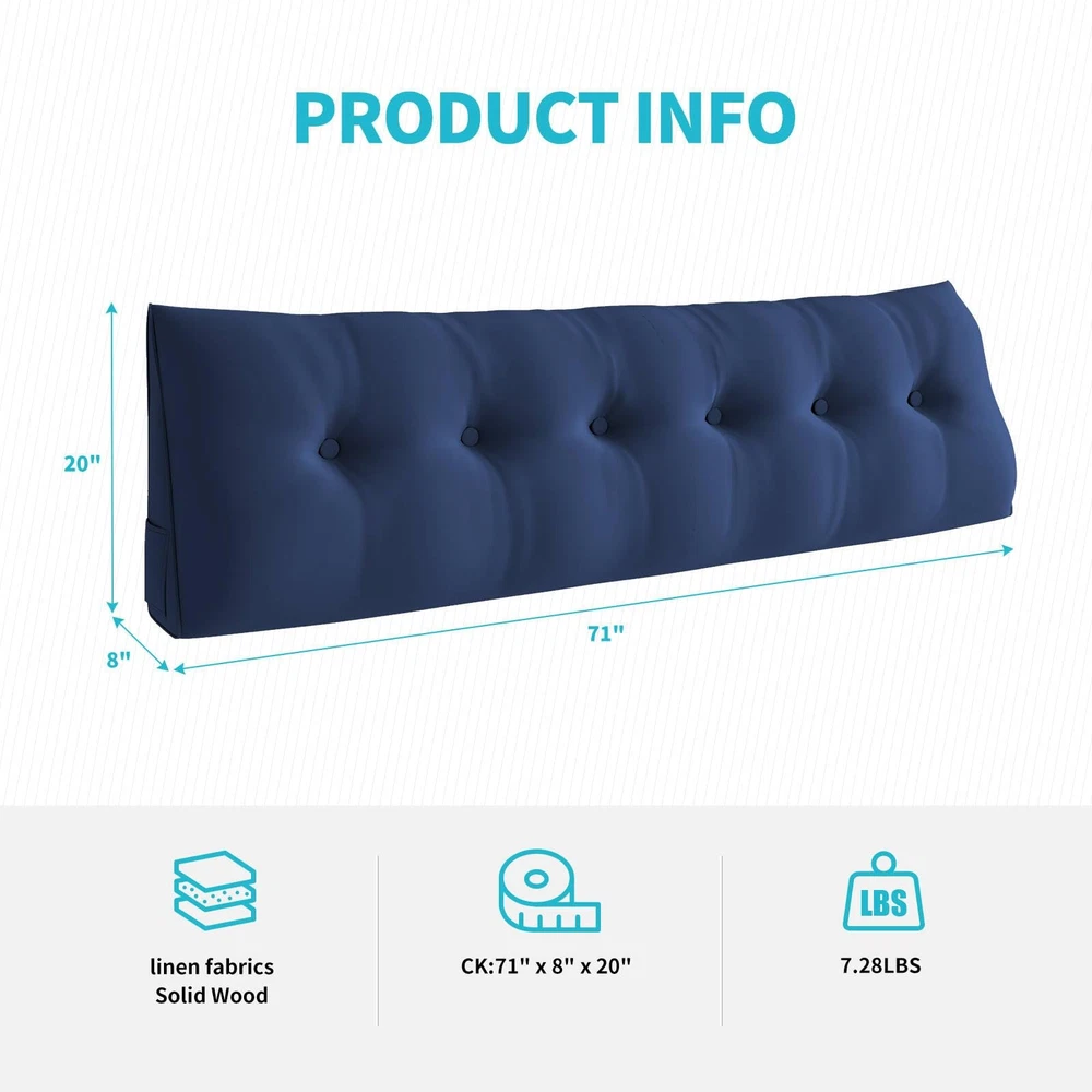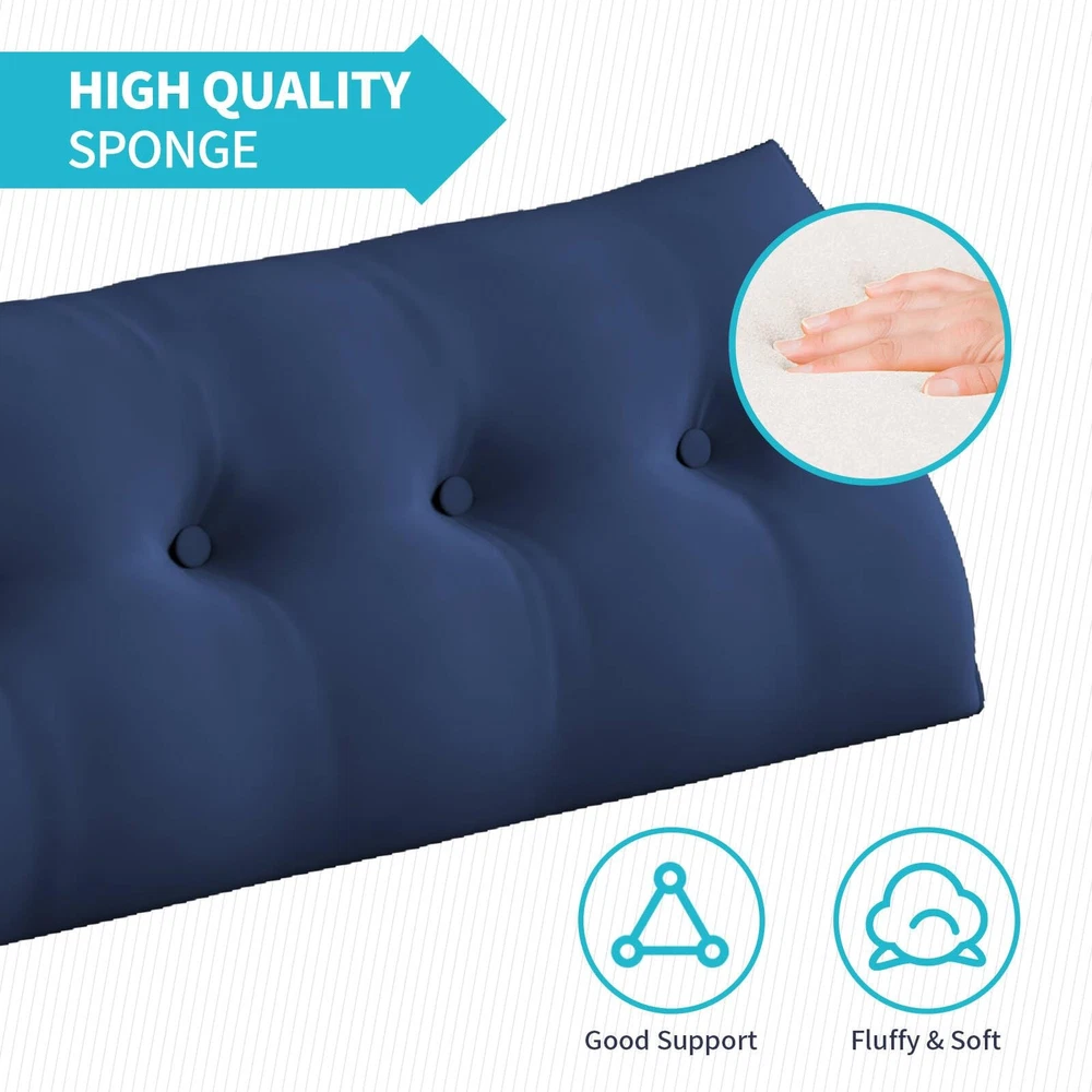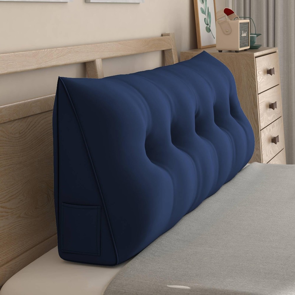 Large Headboard Pillow, Triangle Reading Bolster Pillow with Two Side Pockets, Long Wedge Cushion for Bed or Pregnant Woman, Dutch Velvet Fabric, California King Size, Blue 【Multipurpose and Practical】Available in five different sizes, you can choose our triangle pillow wedge for your desired placement area. This wedge pillow serves multiple purposes, acting as a comfortable substitute for a headboard and providing support while watching movies, reading, or using a laptop. It can also be used as a backrest or seat cushion on a sofa, floor or bay window, delivering optimal softness and comfort. 【Convenient Side Pockets】Both sides of the cushion pillow are equipped with side pockets, approximately 8 centimeters wide. It allows you to store small items such as charging cables, plugs, headphones, pens, mobile phones, air conditioner remote controls, and more. The pocket provides excellent storage capacity, keeping our bedside tidy and organized. 【Easy to Clean】The two-way zipper design allows for effortless removal of the headboard cushion’s pillowcase. Simply unzip and open the buttons to take off the removable cover. The pillowcase is machine washable and we recommend to wash it with a water temperature below 30 degrees Celsius for easy and convenient cleaning. 【Optimal Usage Experience】Featuring a unique button tufted design, this wedge pillow headboard conforms to ergonomics, providing excellent support for the waist, back, neck, and shoulders. It helps prevent various issues and alleviates discomfort caused by prolonged sitting. This reading pillow is an ideal choice for pregnant women, postoperative recovery or anyone seeking enhanced comfort and support. 【Note】Please note that the package may be compressed during transportation. To restore the wedge headboard pillow to its original fluffy shape, it is recommended to place it in a well-ventilated area for 48-72 hours, allowing the cotton to regain its full fluffiness.