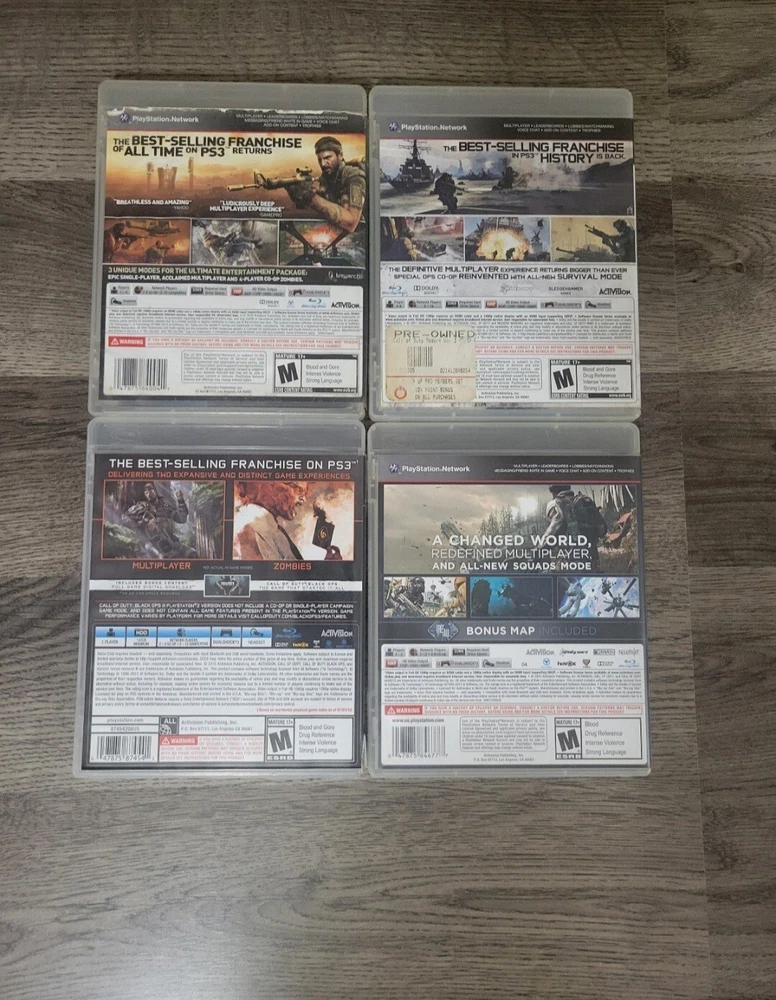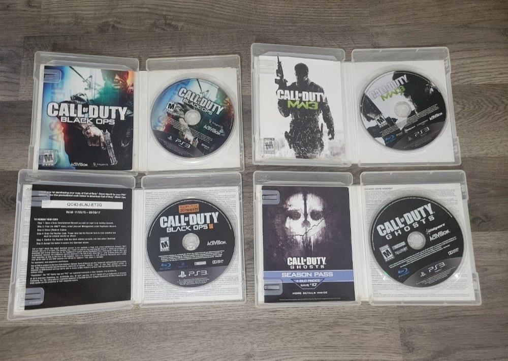 Call Of Duty Game lot of 4 for Playstation 3. Includes COD Black Ops, COD Black Ops III, COD MW3, and COD Ghosts. All discs are in great condition. COD Black Ops cover art has some wear, see pictures.