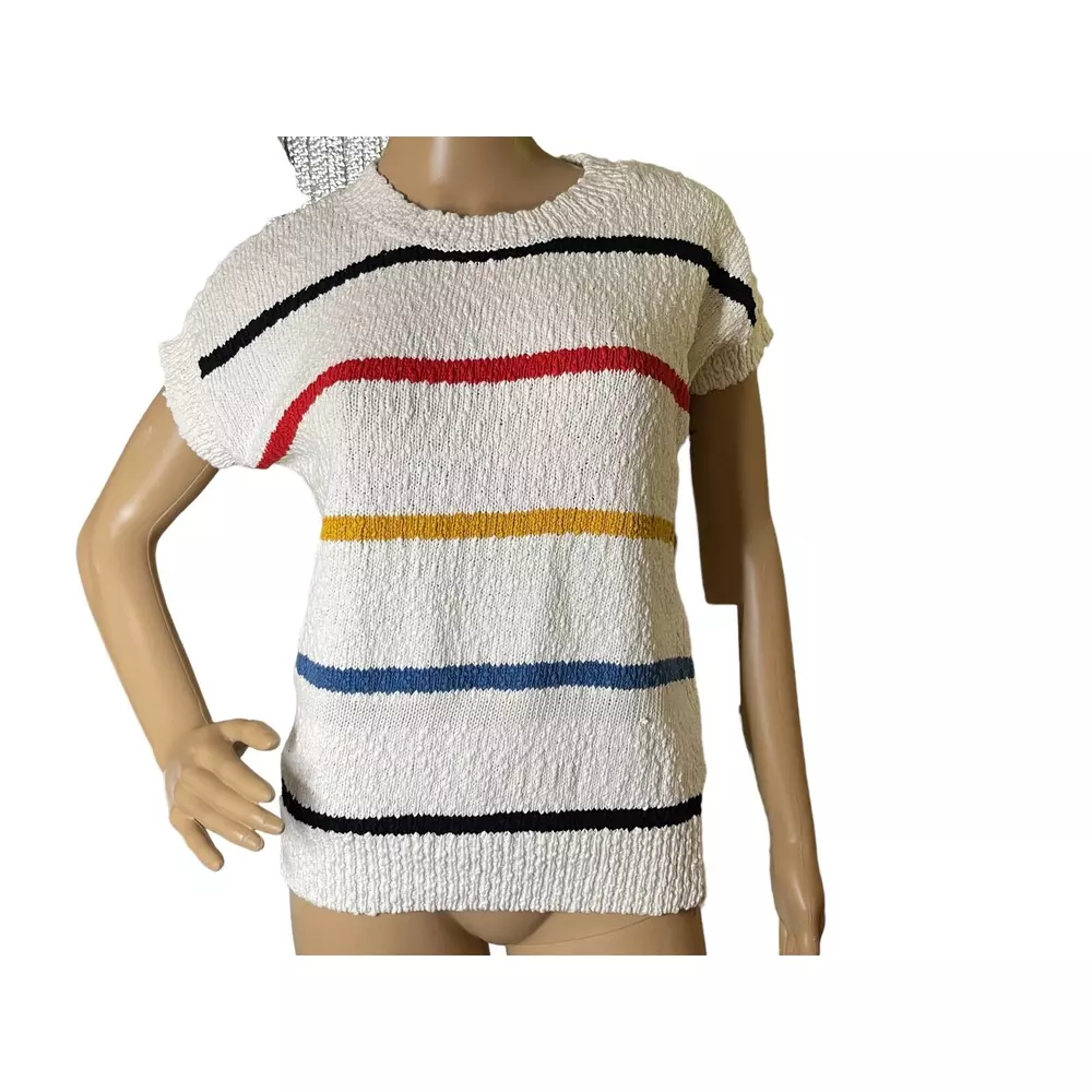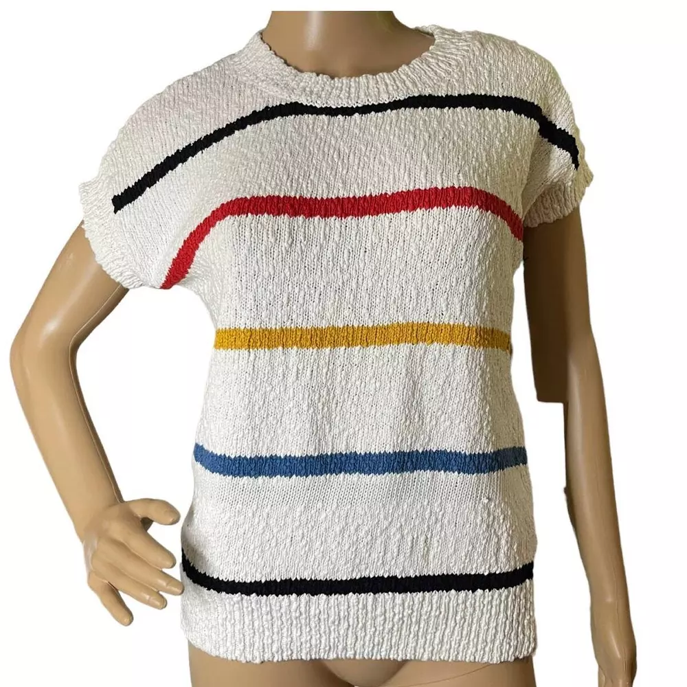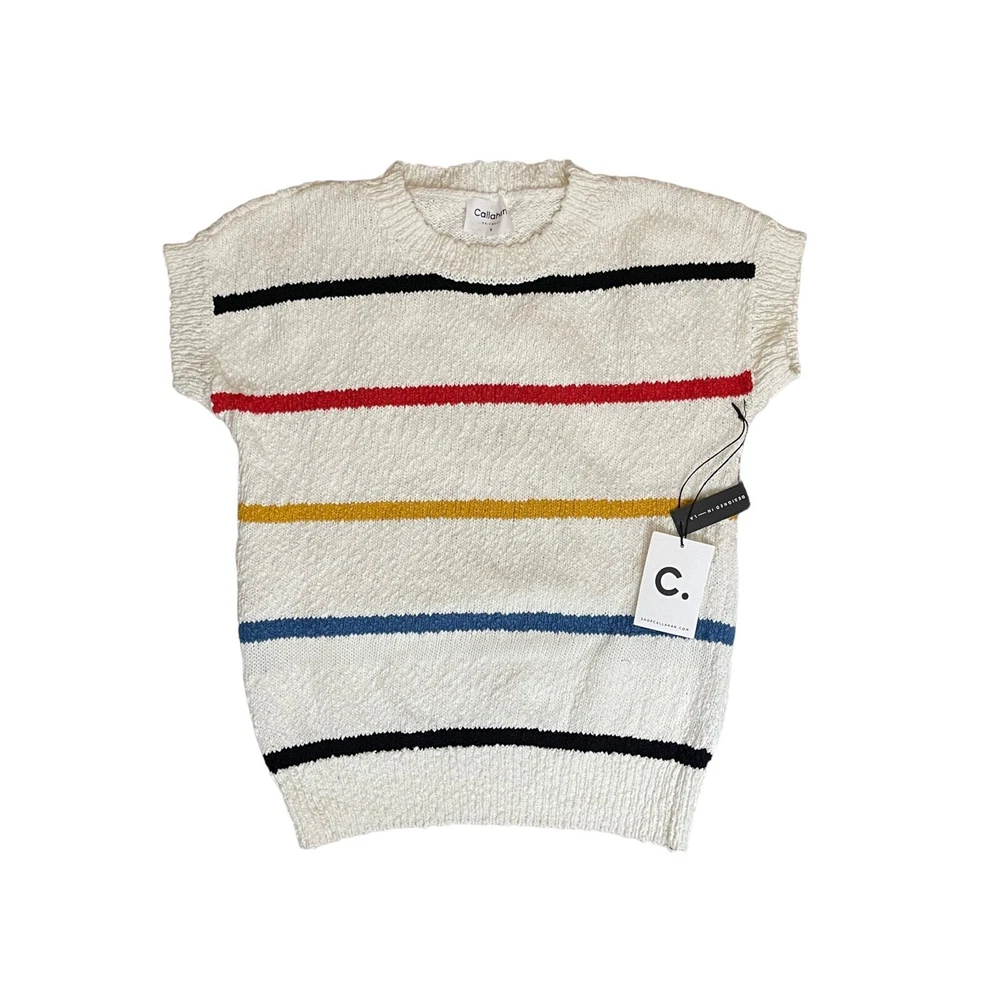 Callahan Revolve Cotton Nubby Texture Sweater Multicolor Striped - NEW WITH TAGS! SIZE SMALL Featuring a unique nubby texture and fun multicolor striped pattern, the Callahan Cotton Short Sleeve Sweater is a must-have for any outfit. Crafted from 100% cotton and soft to the touch, this timeless sweater is perfect for elevating your casual look. With short sleeves that provide great flexibility and breathability, you'll be wearing this classic piece all season long. Add a touch of timeless style to your wardrobe with the Callahan Cotton Short Sleeve Sweater. -Callahan -Style #5208 -Cotton -Nubby texture -Short sleeves -Multicolor striped -Sweater, New. -Measurements (approximate in inches taken flat) Bust 18.75/Waist 17.5/Length 23 Shoulder to hem #Sale #Style #Fashionista #FashionBlogger #OutfitGoals #Bold #Bright