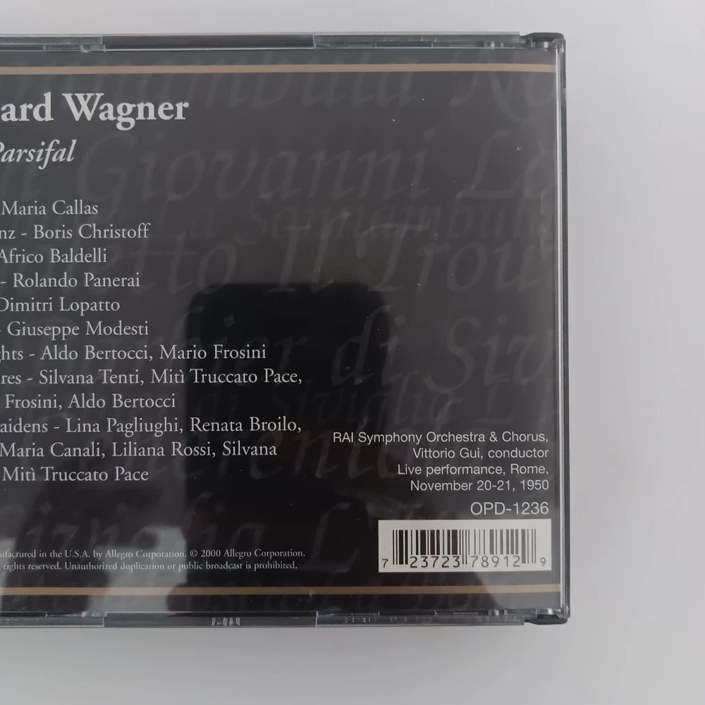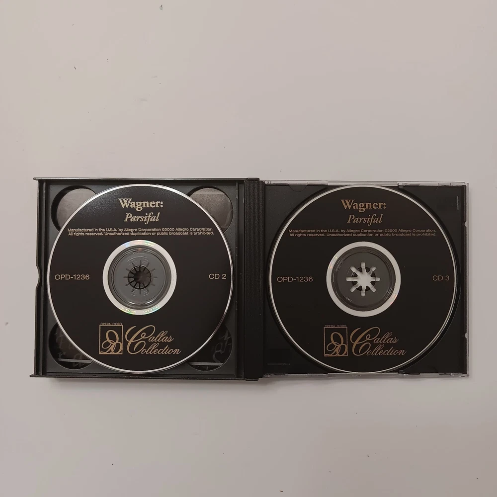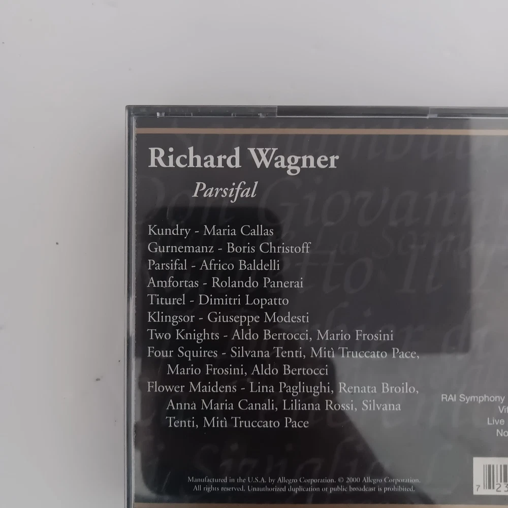 This 3 CD set of Richard Wagner's Parsifal is a must-have for any classical music collection. Featuring the RAI Symphony Orchestra and Chorus, this live edition of the opera is conducted by the composer himself. The CD grading is near mint (NM or M-), and the inlay condition is excellent (EX). The set comes in a standard jewel case with a multicolor design, and is produced by Richard Wagner. The release year is 2000, and the CD format is CD. The record label is Allegro Corporation, and the genre is classical. This item is perfect for fans of Wagner and classical music alike.