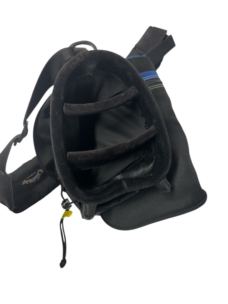 The product is a set of two Callaway Hyper-Lite golf bags, which are soft-sided and collapsible. These carry bags feature a 4-way divider system, dual strap system, and ergonomic handle for easy transportation. The bags are designed to be lightweight, making them ideal for carrying on the golf course. With four pockets and a sleek black color, these bags are perfect for any golfer looking for a convenient and stylish way to transport their clubs. Hard at top of bag where clubs heads would go to protect them.