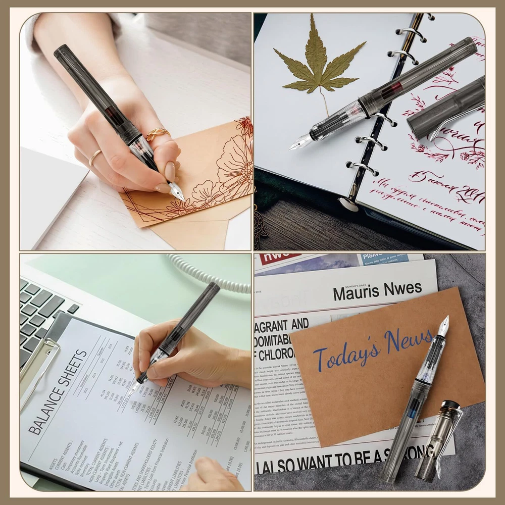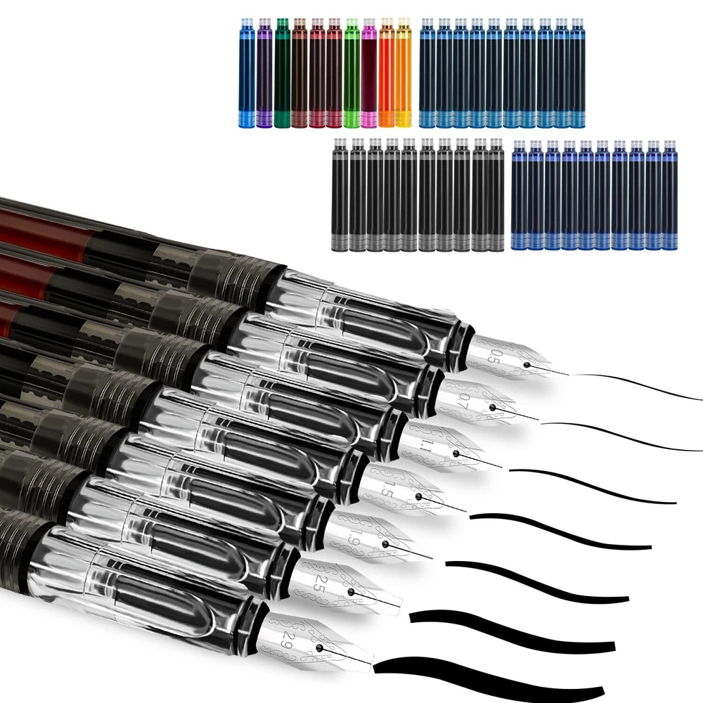 Versatile Set: Calligraphy pen set contains 7 fountain pens with different nib widths (0.5 mm, 0.7 mm, 1.1 mm, 1.5 mm, 1.9 mm, 2.5 mm, 2.9 mm) and 40 ink cartridges in 13 colours, fit for various font styles and meets your writing and drawing needs Two ways to refill the ink: Equipped with 6 ink converters, rotate the pen's plunger converter to extract your preferred ink. The portable ink cartridges can be used on the go to have an instant ink supply Comfortable Usage: Robust, durable stainless-steel nibs for even ink flow and smooth writing. Ergonomic grip area with triangular, streamlined design prevents finger slippage and provides an easy and comfortable grip Transparent Design: Viewing window on the pen barrel makes it possible to see the ink volume at all times to ensure that there is enough ink during use Multifunction: Fountain pen set combines the functions of writing, calligraphy and drawing. Ideal for calligraphy beginners, suitable for children and adults. A perfect set for writer and artist for daily writing, calligraphy, hand drawing and illustrating