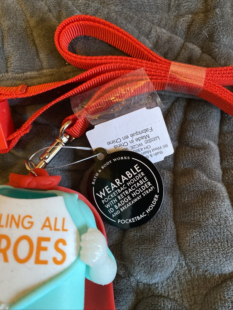 Calling All Heroes Pocketbac Holder And Lanyard. Holds hand sanitizer or lotion. Has retractable ID badge holder and breakaway strap. Brand New with tags still attached. From Bath and Body Works.