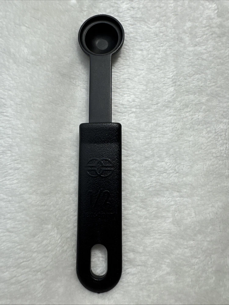 This Calphalon 1/2 TEASPOON measuring spoon is a must-have in any kitchen. It features a solid pattern in black and gray, with a set that includes one spoon. The spoon is made of nylon and silicone, making it heat resistant and easy to clean. The lightweight spoon has a soft grip and is dishwasher safe. Perfect for cooking, this measuring spoon is a great addition to any kitchen tool collection. It is manual in making method and has a unit quantity of one. The spoon's handle is made of silicone and nylon, making it durable and long-lasting. Get accurate measurements for your cooking needs with this Calphalon measuring spoon.