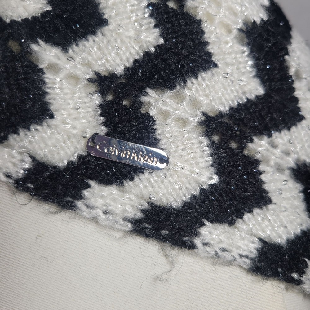 This Calvin Klein infinity scarf showcases a sophisticated chevron pattern in black and white, designed to add elegance to any wardrobe. The knit material provides warmth and comfort, making it a valuable addition to any accessory collection. Its stylish design seamlessly complements both casual and formal outfits. • Chevron pattern design • Infinity style scarf • Soft knit fabric • Elegant black and white colors measures: 64" length 14" width