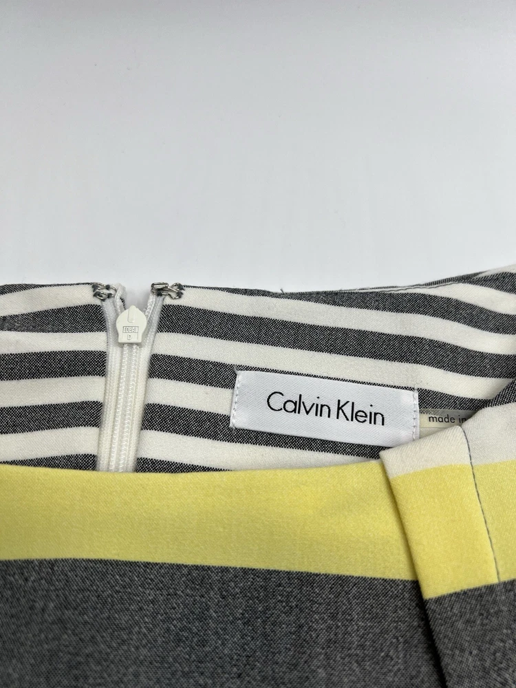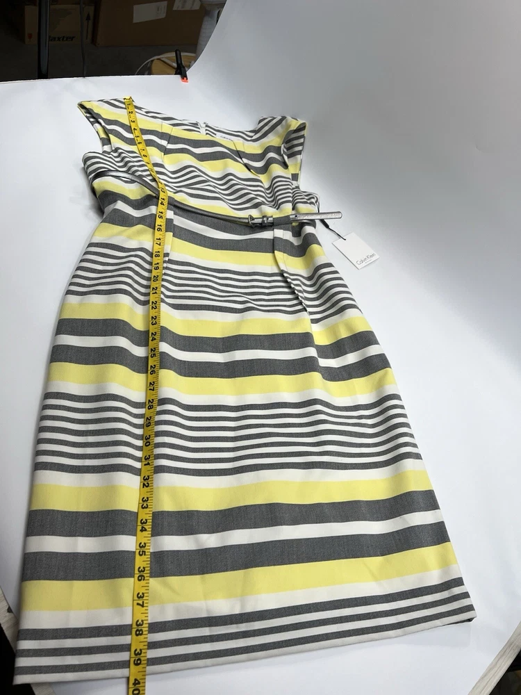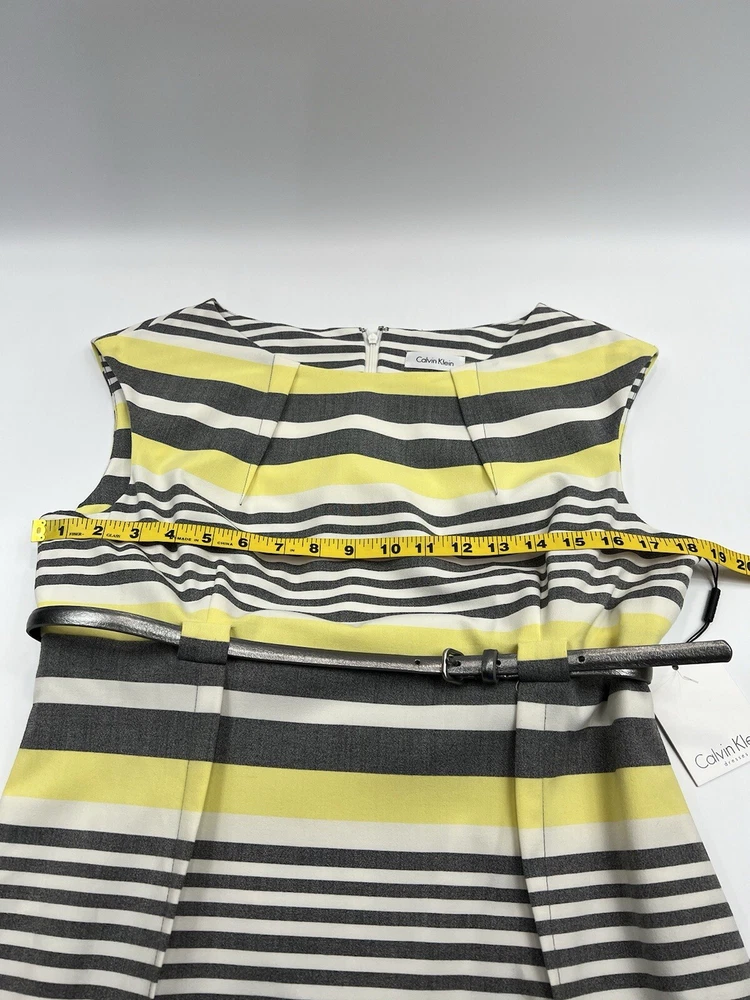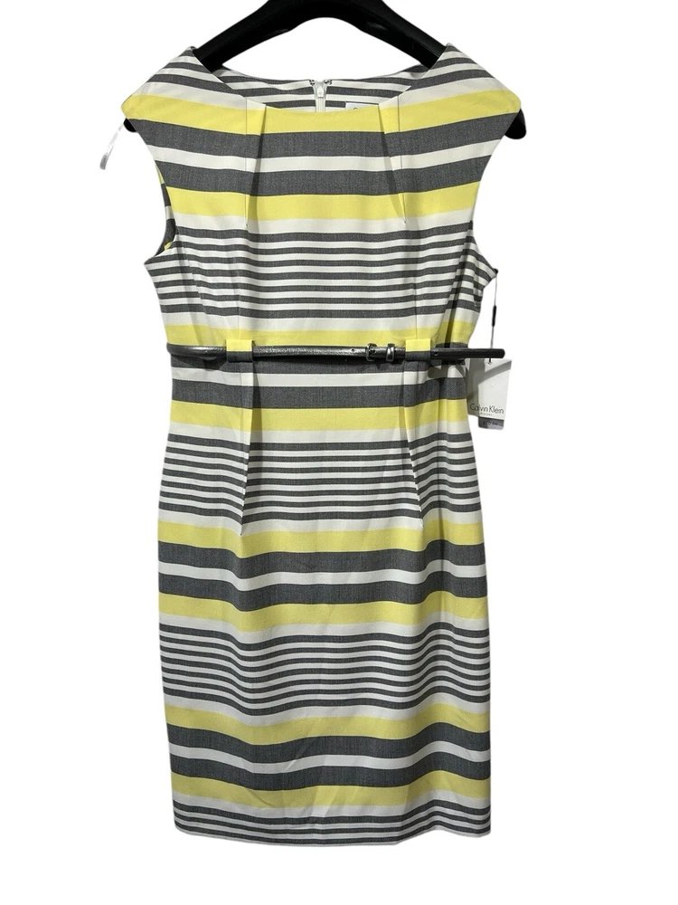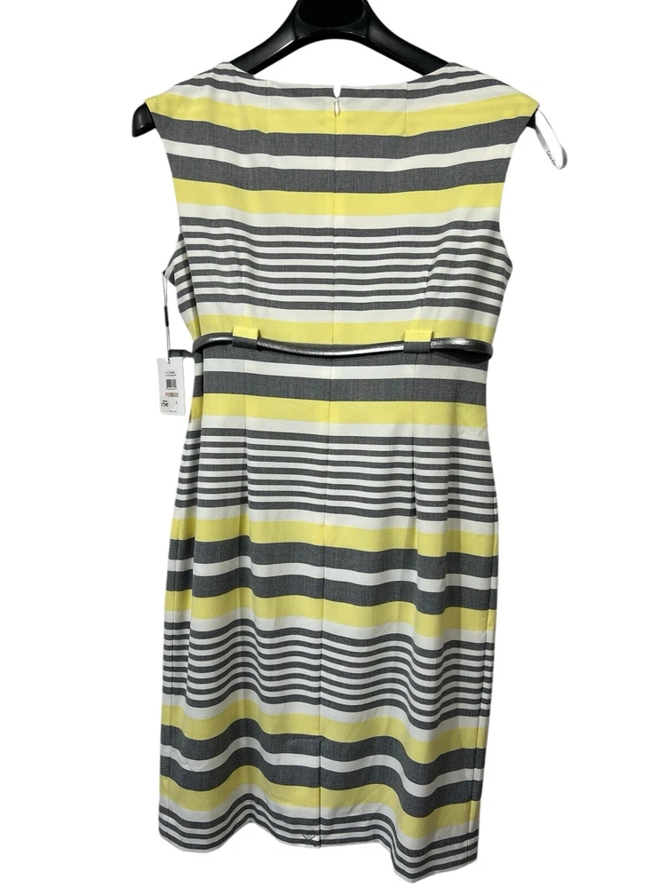 Calvin Klein Womens 12 Yellow Gray Striped Sheath Dress Cap Sleeves Silver Belt