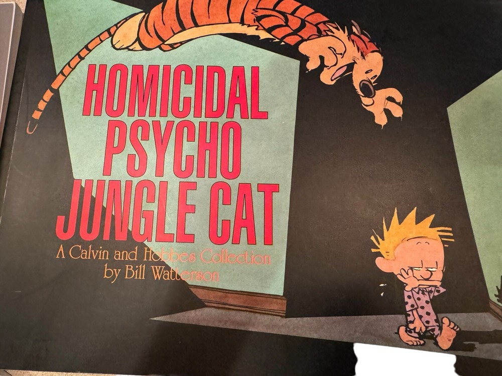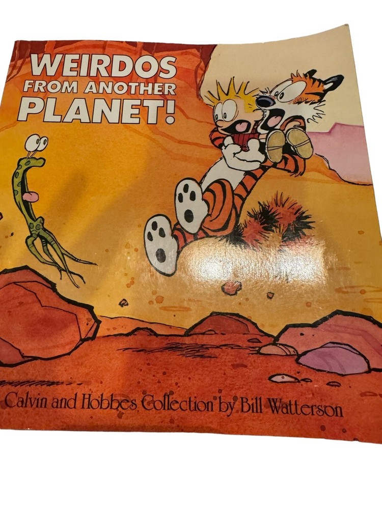 Dive into the world of Calvin and Hobbs with this collection of four graphic novels by Bill Watterson. Immerse yourself in the hilarious adventures of the dynamic duo as they navigate their way through life and death situations. This set includes "Calvin and Hobbs", "Another Planet", "Homicidal" and "Drooling", all in trade paperback format. Explore the modern age era of US comics with this collection, published by Scholastic. Perfect for fans of action and comedy, these comics are sure to keep you on the edge of your seat. Add this set to your collection of collectibles, comic books and memorabilia, and enjoy the thrilling ride of Calvin and Hobbs!