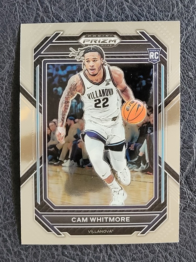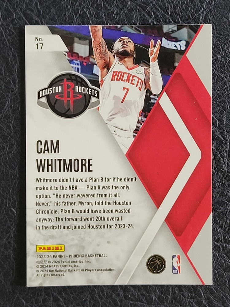 Cam Whitmore 2023-24 Phoenix Instant Impact Rookie & Prizm Draft 98 Rockets RC is a set of two standard-sized sports trading cards featuring Cam Whitmore from the Houston Rockets and Villanova Wildcats. The cards are part of the 2023 Panini Prizm Draft Picks and 2023-24 Panini Phoenix sets, showcasing Whitmore as a rookie player. The cards are made of card stock and include base set and insert features, perfect for basketball fans collecting NBA memorabilia.