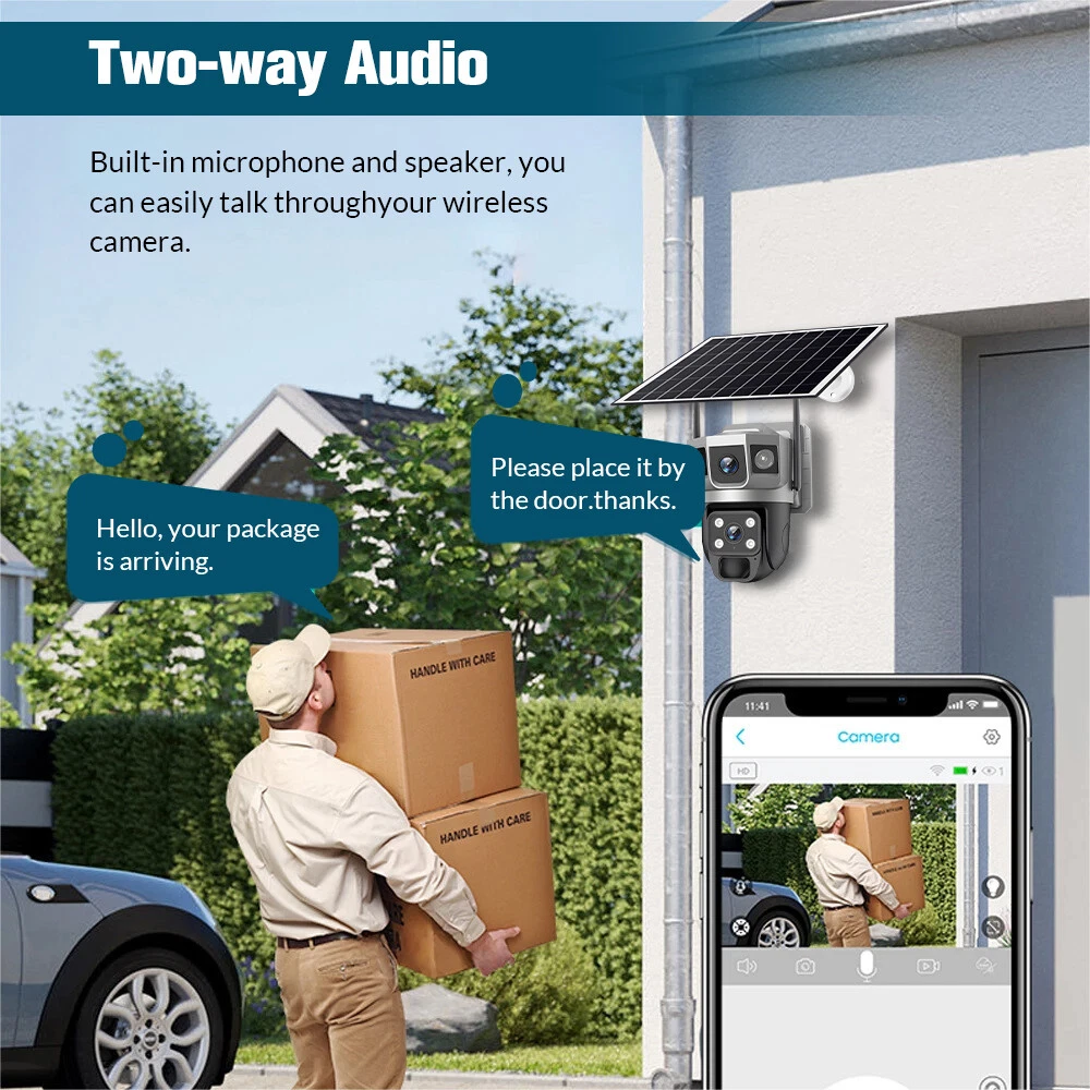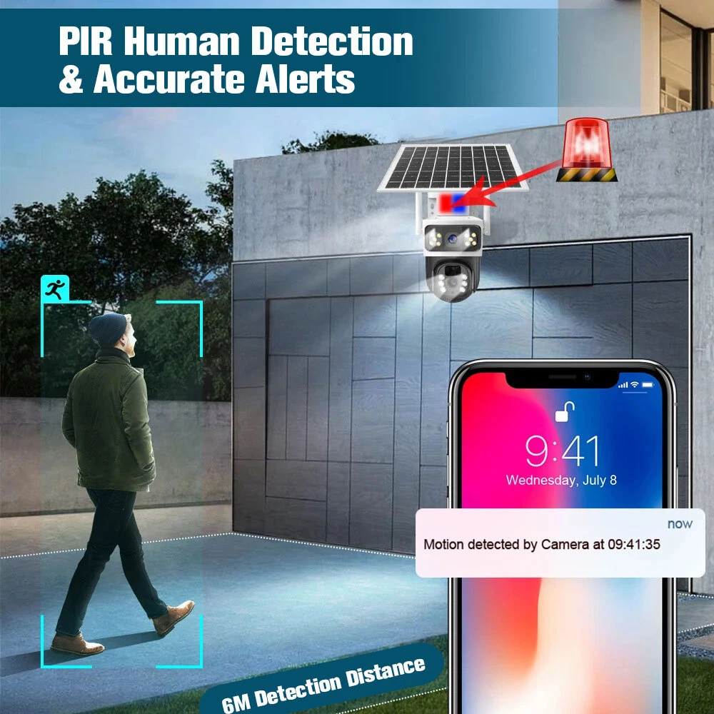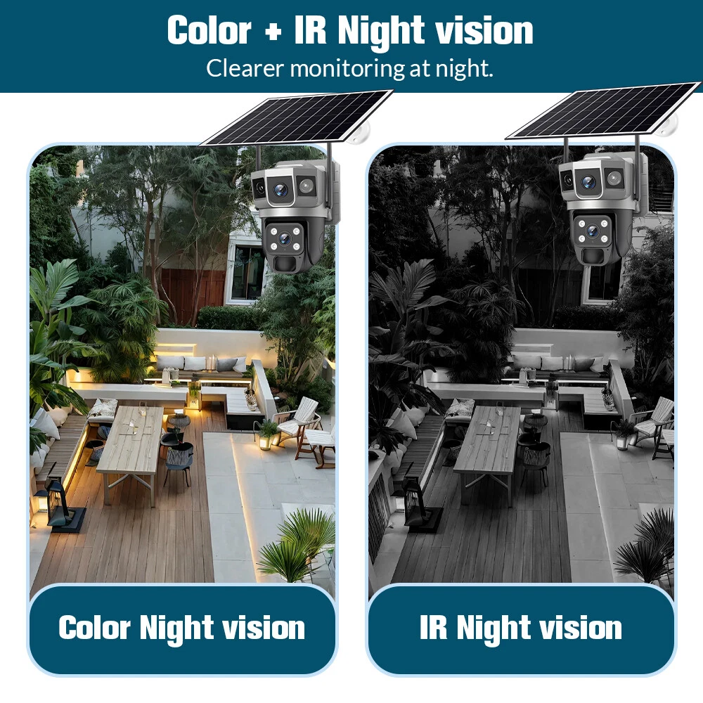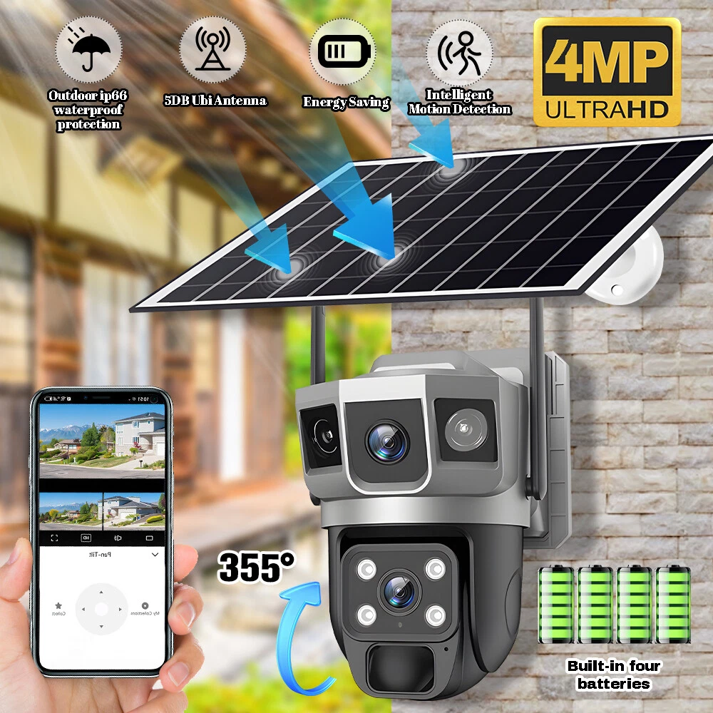 9MP Solar Camera Description Features: dual lens, dual screen viewing Option: WIFI=WIFI 2.4Hz connection 1:3MP+3MP+3MP million pixel outdoor solar monitoring camera 2. High definition: Shoot with a high-definition camera to ensure the effectiveness and quality of video shooting, allowing you to have real-time control of the outdoor environment. 3. Night vision system: optional infrared or color night vision, which can monitor the doorstep in real-time at any time to ensure safe and smooth enjoyment. 4. APP V380 Pro remote operation: functions such as remote operation, photography, and video recording, allowing remote control of the outdoor environment. 5. Voice intercom: With voice intercom function, you can transmit sound to the external environment through your phone or replay the sound to visitors through the device. 6. Custom alerts: supports custom alerts, and when you receive an alert, it will immediately send an alert message to your phone 7. Multi user remote access: Share the same camera with your family, leave everything you protect, and pay more attention to your home. 8. SD card: The maximum size of the SD card is 128GB, 9. Waterproof/Dustproof Ip66: The camera casing is made of high-quality ABS plastic and has waterproof, sunscreen, and dustproof functions. It is suitable for any environment. 10. Motion detection and automatic tracking: After locking the target, the camera will automatically adjust the pan tilt rotation. Track moving objects, cars, pets, humans, and push alert notifications to your smart Phone. Package List: 1x 9MP solar camera 1x bracket 1x solar panel with extension cable 1x installation package 1x instruction manual 1x 32GB card 4MP Solar Camera 3 screens shows on the V380 app Three images can be viewed simultaneously, and each image can be individually enlarged. Real time alerts Set up monitoring areas in advance, conduct actual testing, and promptly push alarm information. IP66 Waterproof / Dustproof The camera is equipped with IP66 case , which is waterproof, sun-proof and dust-proof. It is suitable for any environment. Clear Two Way Audio Built-in microphone and speaker / Customized new speakers with loud volume; You could talk to anyone nears the camera ( Warn someone to leave your house ). Advanced H.265 Video Compression H.265 (HEVC) doubles the coding efficiency compared with its predecessor H.264. H.265 video saves around 50% of the bit rate at the same quality of coding.H.265 only need less bandwidth,faster loading speed,more smooth video,Lower bite rate,higher image quality! 10X Zoom(Both 3 cameras support zoom) you can switch from 1X to 10X zoom instantly;it can fast zoom in or zoom out without lag;watch far and near images Simultaneously through Picture in Picture,don't miss a detail. Full Color Night Vision: When the white LED light is on, the camera will display colorful vision at night, and there are three night modes for you to choose. Ai Human Detect Alert Quickly finds human targets and immediately sends a notification to your phone, letting you see what happens anywhere. It only detects the human shape and will not trigger falsely for objects such as cars and trees. PTZ Control by APP Rotates 355° Horizontally and 90° Vertically.You can control it in the APP directly whenever you want and wherever you are. 6MP Solar Camera Specification: ● Resolution: 4MP; ● iode: 12 x IR white light; ● Night vision: 30m; ● Head: 355° horizontal rotation, 90° vertical rotation; ● PIR infrared sensor: 10m (32ft) 100 degree detection range; ● Battery standby: up to 365 days; ● IP66 outdoor battery camera; ● Cloud storage: supported; requires in-app subscription and payment; ● Local Storage: Supports micro SD card up to 128G (not built-in); ● Multi-viewing: supports sharing to up to 4 families; ● Input/Output: Built-in microphone and speaker; ● Apps: Eseecloud app; please search for this keyword on Google Play or iOS APP Store to download the app; ● Operating time: 10 months based on 3 events triggered per day; ● Operating temperature: -20°C to 60°C (4°F to 140°F); Battery powered+solar charging panel: Built in recyclable rechargeable battery, ultra-low power system optimization, energy saving, durable endurance, and long term standby with solar charging panel Picture in Picture , 8X Digital Zoom you can switch from 1X to 8X digital zoom instantly; it can fast zoom in or zoom out without lag; watch far and near images Simultaneously through Picture in Picture,don't miss a detail. Two-Way Audio Build in speaker and microphone,support clear two way voice speaking AI Auto Tracking When someone passes through the alarm area, the camera will detect the person's movement. And track people. PIR Human Detection When it is found that someone breaks into the monitoring area, the camera will immediately take a picture and push alarm to App. Full Color Night Vision When the white LED light is on, the camera will display colorful vision at night, and there are three night modes for you to choose. PTZ Control by APP Rotates 355° Horizontally and 90° Vertically.You can control it in the APP directly whenever you want and wherever you are. IP66 Waterproof / Dustproof The camera is equipped with IP66 case , which is waterproof, sun-proof and dust-proof. It is suitable for any environment.