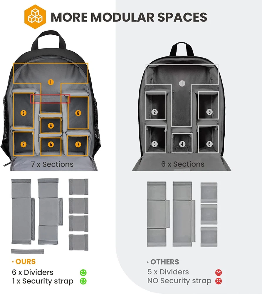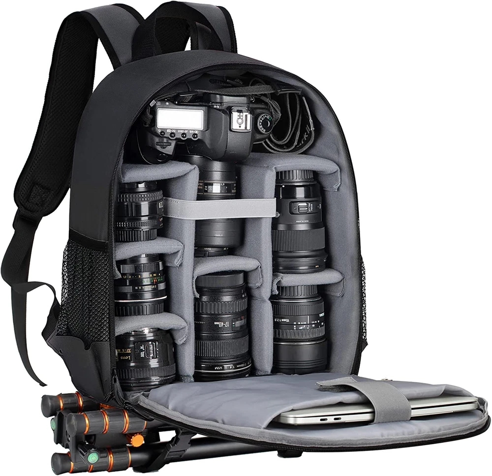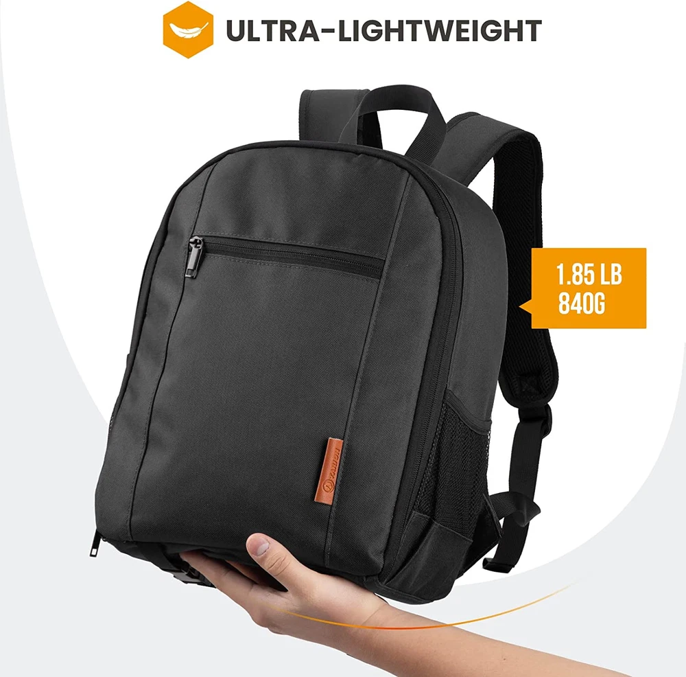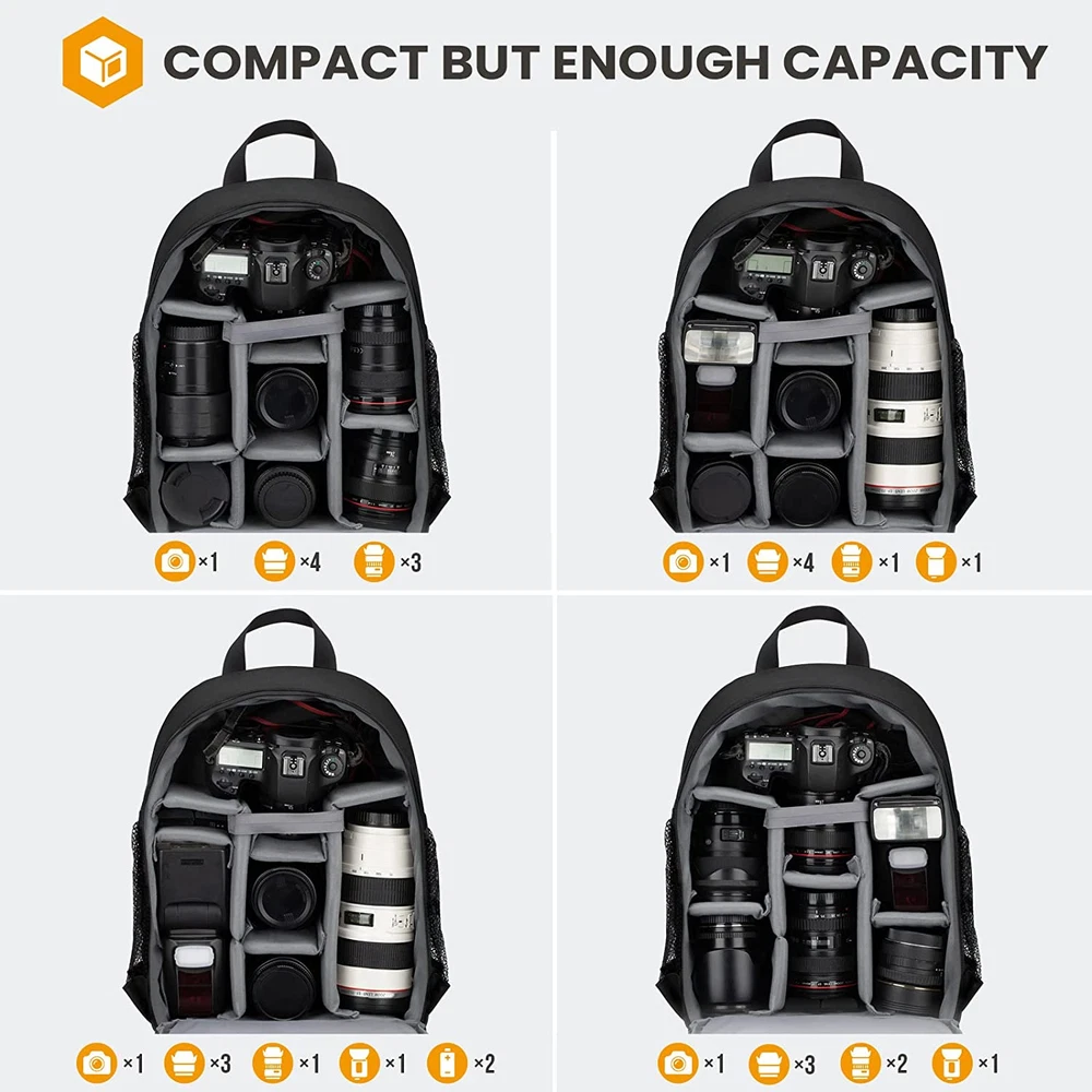 【COMPACT DESIGN BUT ENOUGH CAPACITY】 This camera and lens bag provides 7 rooms with 6 pieces padded removable dividers and 1 security strap which can hold 1 camera 6 lenses, while you can DIY the inner space by removing the thick dividers based on your equipment. Inside there is a dedicated sleeve for a 13" laptop or tablet/iPad. Professional TARION camera backpacks for Photographers 【BOTTOM TRIPOD STRAPS WITH CLIPS】Tripod or monopod can be attached to the DLSR camera bag bottom with straps which does not alter the center of gravity because the weight of both the tripod and the backpack are uniformly distributed, which aids comfort when carrying. The front of the camera gear backpack has a zippered pocket for accessories. Mesh pockets on both sides for bottle and umbrella 【ALL WEATHER PROTECTION】 Comes with a waterproof rain cover for entirely weatherproof. The ventilated shoulder straps are sturdy, well-padded, and easily adjustable, which helps add the necessary comfort and breathability with a full load. Waterproof camera backpack is compatible for Canon, Nikon, Sony, etc 【ULTRA-LIGHTWEIGT】 Dimensions:14.6x5.5x11.2inches(37x14x28.5cm),only 1.83lb(0.83kg). Light as a feather, a perfect weight to be carried for the day's city adventure. You can really make the most use of your carry-on allowance on those strict internal airline carriers. Small compact photography backpack for you 【MULTI-FUNCTIONAL】 This dslr camera backpack can be easily converted into a lightweight flexible simple straight daily backpack by removing the camera compartment dividers. Super easy to use for small day trips, there's enough room for personal gear. Obviously black is far more practical for everyday use. If you are not satisfied with our camera bag or have any questions, please feel free to contact us. TARION is always here Product Description TARION TBS Lightweight Camera Backpack with Tripod Holder and 13in Laptop Sleeve The video showcases the product in use. The video guides you through product setup. The video compares multiple products. The video shows the product being unpacked. Modular Inner Space Lightweight and Compact but Enough Capacity Dimensions:14.6x5.5x11.2inches(37x14x28.5cm),only 1.83lb(0.83kg). Dedicated Laptop Sleeve Dedicated computer space fits up to 13" thin laptops/tablets or iPad. Bottom Straps for Tripod Bottom tripod straps advantage - Center of gravity uniformly distributed. All Weatherproof Bag Cover Bag rain cover keeps rain and dust out, it can take whatever weather throws at it. Lightweight & Travel-friendly Light as a feather, a perfect weight to be carried for the day's city adventure. You can really make the most use of your carry-on allowance on those strict internal airline carriers. Package Includes 1 x Camera Bag Black TB-S 6 x Padded Dividers 1 x Security Strap 1 x Waterproof Rain Cover TARION Camera Bags & Backpacks Comparison Add to Cart Add to Cart Add to Cart Add to Cart Add to Cart Add to Cart Add to Cart Customer Reviews 4.7 out of 5 stars 6,938 4.7 out of 5 stars 984 4.7 out of 5 stars 811 4.6 out of 5 stars 1,521 4.7 out of 5 stars 3,660 4.6 out of 5 stars 1,420 4.5 out of 5 stars 6,099 External Dimensions 17 x 11.8 x 6 inches 16.1 x 8.7 x 5.9 inches 16.5 x 12.2 x 5.1 inches 16.5x11.4x7.1 inches 18.1 x 11.2 x 6.1 inches 11.8 x 7.5 x 23.6 inches 19.5 x 12.8 x 8.3 inches Capacity 17L 6.5L 14L 14.5L 17L 20.5L(Removable laptop Sleeve) 25L (With a shoulder Bag) Laptop Compartment Yes / 15inch - Yes / 14.5inch Yes / 15inch Yes / 15.6inch Yes / 16in Yes / 15.6inch Tripod Holder Yes / Bottom Yes / Side Yes / Side Yes / Bottom Yes / Side Yes / Side Yes / Side Rain Cover ✔ ✔ ✔ ✔ ✔ ✔ ✔ Why Choose It ? Lightweight, Multi-Functional Lightweight, Convenient, Sling All Round Hard Protection Vintage Style, Unisex, Canvas IPX5, Back+Side Access Detachable Laptop Sleeve 2-IN-1. Pro, Extra Large " data-position="triggerHorizontal"> " data-position="triggerHorizontal"> " data-position="triggerHorizontal">