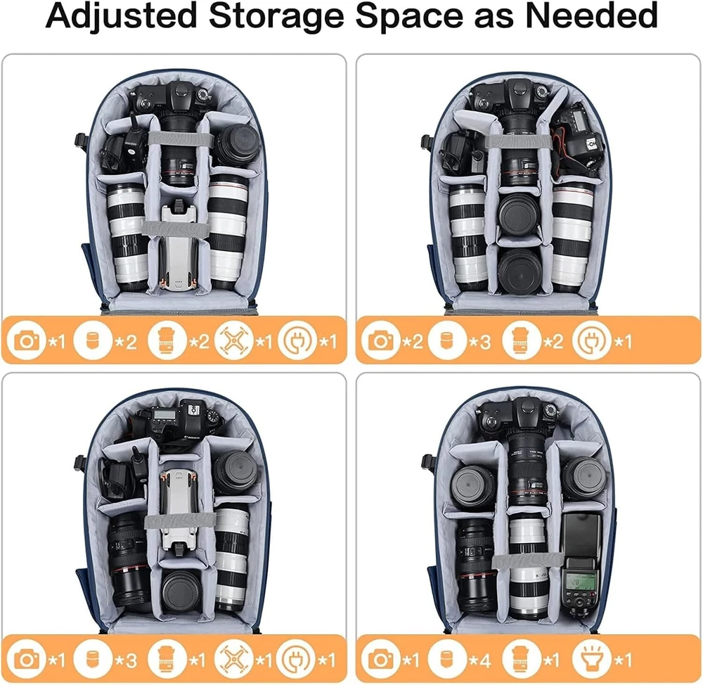 Camera Backpack, DSLR/SLR/Mirrorless Photography Camera Bag 15-16 inch Waterproof Hardshell Case with Tripod Holder&Laptop Compartment Compatible with Canon/Nikon/Sony, Steel Blue x x inch. 2 compartments included. Padded removable modular inserts in the upper one ( x x inch) is customized dividers for different cameras, flashes, lens and drones. You can organize the inner padded to adjust the inner storage space according to your needs. Another one ( x x inch) is laptop compartment to storage up to 16 inch. Full open design. 2 accessory pockets on the back face can store cables, sd cards, powerbank and other small items. Tripod/monopod holder is featured with 1 secure strap on one bag side. 1 pocket on another side can store umbrella or water bottle(up to maximum diameter). 1 anti-theft pocket is designed on the back for your wallet, cell and precious items. With waterproof PU leather hardshell protection in front. The foam padded layer can provide good buffer and protection to your internal stuff against shock and drops. High elastic back cushion can ease your pain after long time take. Padded shoulder strap varied from to maximum inch can be adjusted per personal preference. Clip strap featured on the shoulder strap can hang sunglasses, eyeglasses, towels and clothes. 1 handle is also designed to meet different demand. Back trolley belt makes it convenient during the trip. Perfect for men and women - camera enthusiasts. This multifunctional camera bag is professionally designed for DSLR / SLR / Mirrorless cameras of different products. Compatible with Nikon D5600, D5300, D3500, D3400, D3300, D3200; compatible with Canon EOS Rebel T6, T6i, SL2 and other standard-size DSLRs. Also designed to be compatible with DJI Mavic Drone(Mavic 2/Air/Pro). Camera Backpack Waterproof Hardshell Camera Bag Case Camera Backpack is professionally designed for DSLR / SLR / Mirrorless cameras of different products. Compatible with Nikon D5600, D5300, D3500, D3400, D3300, D3200; compatible with Canon EOS Rebel T6, T6i, SL2 and other standard-size DSLRs. Also desigend to be compatible with DJI Mavic Drone.