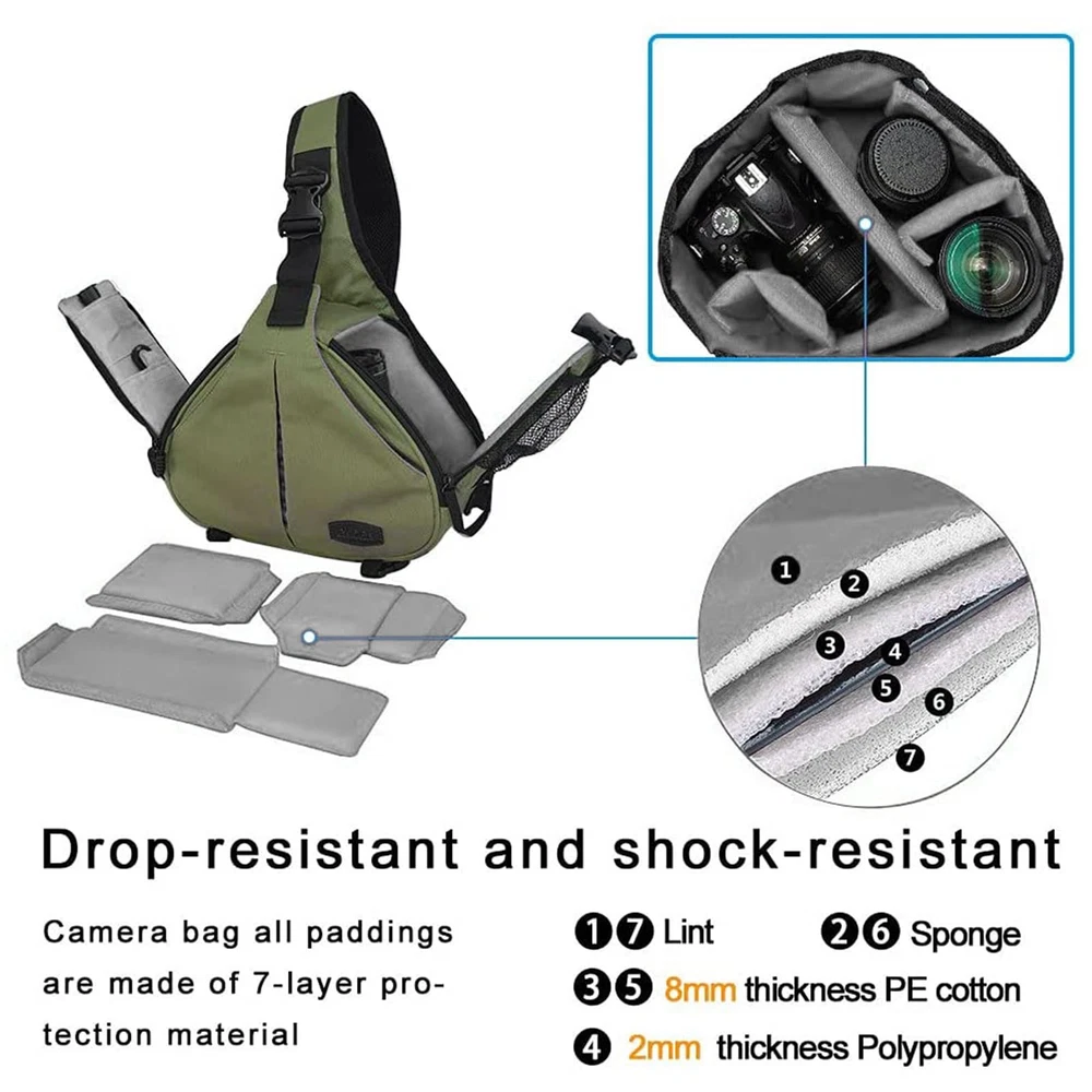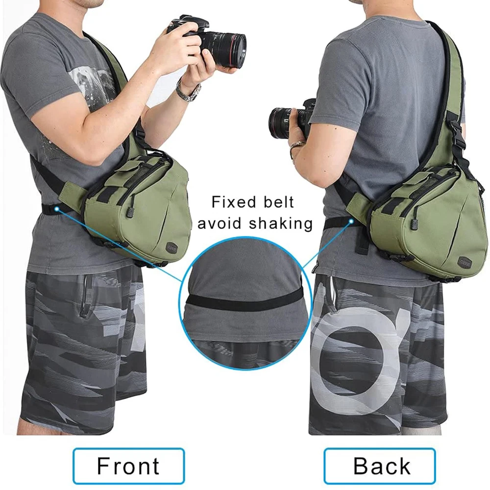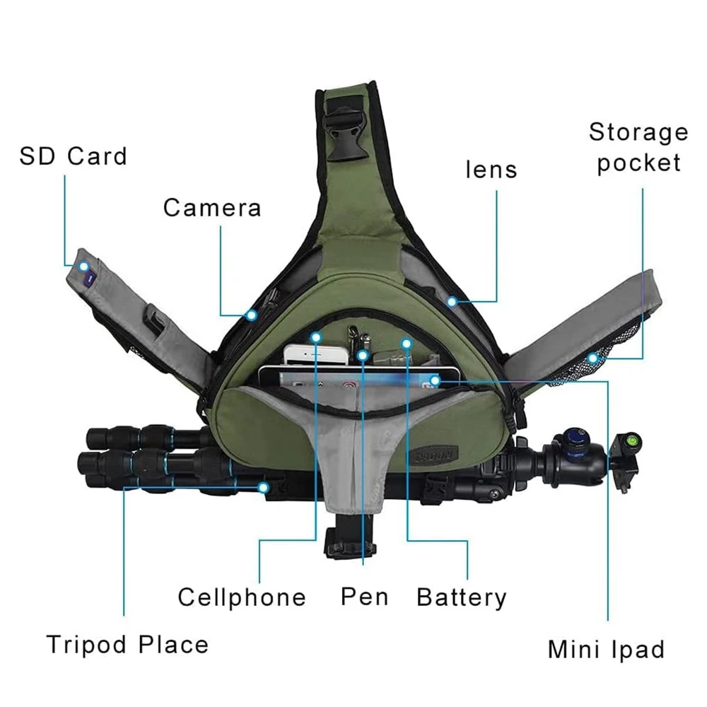Large capacity: Bag size:12.5*4.5*9.4 inches, inner size: 11.69*3.39*7.89 in(L*W*H), 0.68 kg (1.50 lb). Fits 1 camera + 1 lenses + tripod + flash, free rain cover. Double protection for your camera and Photography accessories. Multi-functions: ①Both sides quick acess with protable drawstring, Only 2 seconds to get camera ②Different way of use,In the front it is Chest bag. if used on the back, is backpack. ③Drawstring at the bottom of this travel compact camera bag,used for tripod, monopod or other things ④The detachable and customzied DIY inner bag made of 18MM thickness of 7 layer protection Padding, shockproof and no deformed. Main feature: ⑤The shockproof and breathable mat come with one hidden pocket, you can put glove, work ID, card, date cable and other accessories;⑥The comfortable, shockproof and reduce pressure shoulder strap, can be adjusted by your size;⑦Two pockets on the outside of both quick access,fit battery,lens cap,sunglasses ect;⑧4 small pockets on the inside of both quick access,used for SD card, credit card and others. Perfect design and good quality: ①High density water resistant nylon;②Honeycomb three-layer breathable comfort nylon mesh mat;③More padding, durable and breathable shoulder strap;④Three pieces buckle design,protect your valuable items from being stolen;⑤The DSLR/SlR Camera bag's suture part all used crossing reinforcement technology,use much longer. Services: Any quality problem within 1 year, we will offer a new one for you; Gift: Rain Cover; 20 years factory experience with more than 1000 employees focused on camera bag.