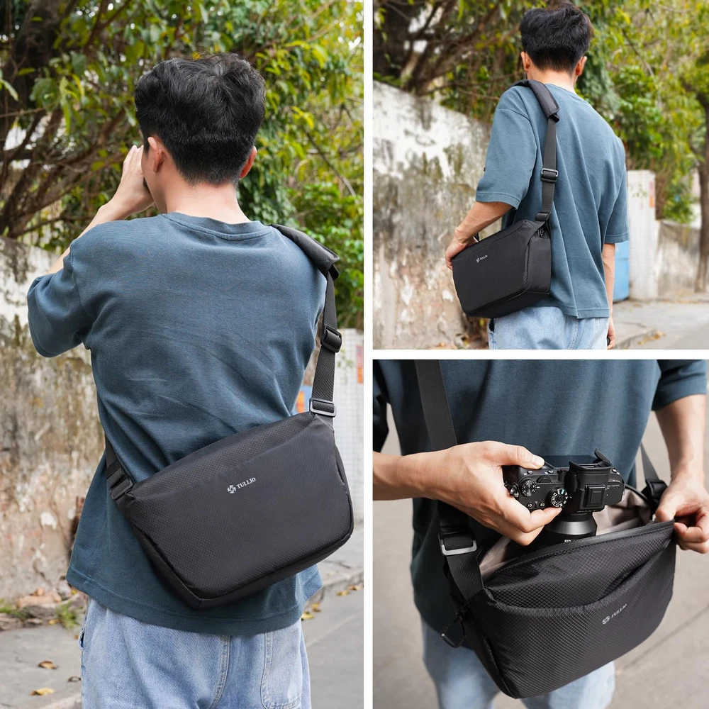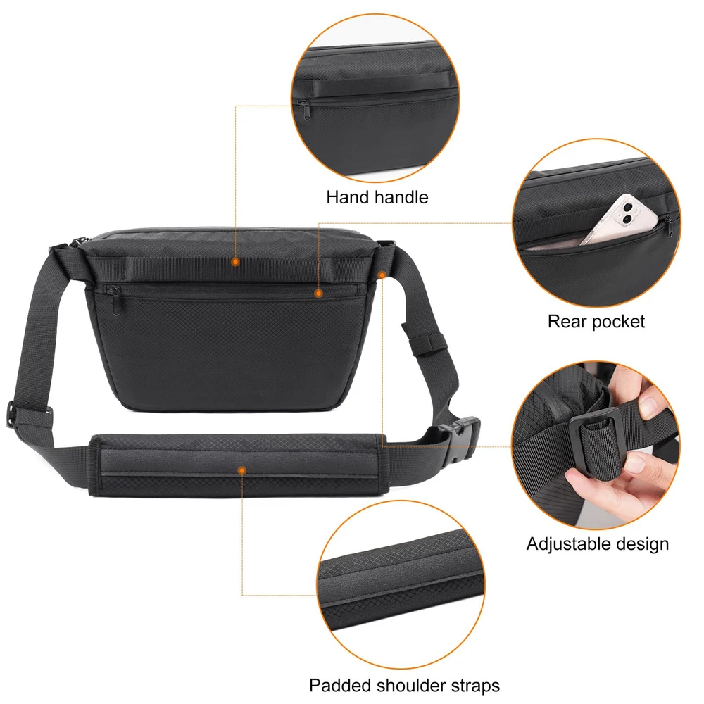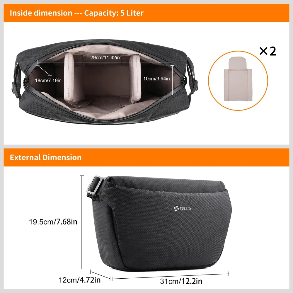 Compact and Convenient - This camera bag is small and compact but can fit an entry level DSLR/mirrorless camera and 2 lens, or 1 dslr camera with a lens and Dji drone. Dimensions:12.2"L x 4.72"W x 7.68"H. Very simple and stylish design and quick to access your camera by top zipper. Expandable Front - The 6 liters camera bag features an expandable front pocket which designed for small stabilizer or tripod. And an anti-theft zipper pocket on back for smart phone or your valuables. Waterproof and Lightweight - This camera shoulder bag made of waterproof fabric and waterproof zipper(mai zipper), it's very lightweight only 1 lb Padded and Ajustable Strap - Adjustable and padded shoulder strap with top handle to provide didfferent carrying way. It can be served as a camera sling bag, camera cross-body bag, camera shoulder bag for women and men. By removing inner dividers can easily convert it from a camera bag into an everyday sling bag. Idea gift for photography friends and fmalilies. Camera Protection - The 10mm soft foam layer surrounded can well protect your camera and accessories from accidental shock. We are dedicated to provide our customers with high quality products and superior service. 12 month manufacture warranty against any quality issue. Please feel free to contact us for any problem