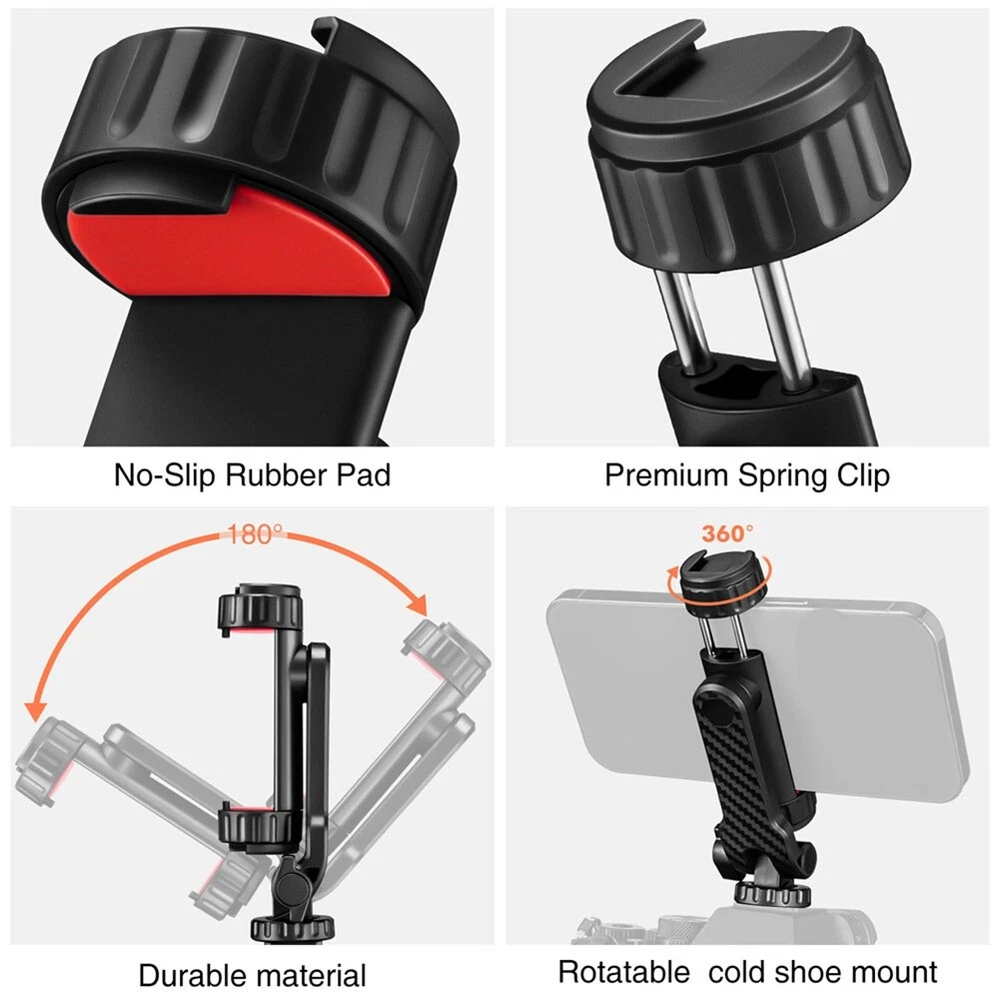 Camera Hot Shoe 360 Rotatable Phone Mount Holder Tripod W Cold Shoe for Mic1436 [Newest Phone Tripod Mount]Cell Phone Mount Tripod design with 360° Rotatable, you can attach extra LED light, microphone or other filming equipment. It helps to record steady videos for , and platforms and live streaming channels. [2 Cold Shoe Mount & 1/4 inch Screw Thread]The mobile phone tripod mount is equipped with two cold shoe mounts, allowing you to attach microphones, photography lights, and other accessories. Additionally, the cold shoe mounts can be easily rotated to adjust the angle of your equipment.Also features a standard 1/4 inch screw hole, making it compatible with tripods, selfie sticks, monopods, cameras, stabilizers, video sliders, ring lights, handle grips, and other accessories. [360° Adjustable Phone Holder] phone tripod adapter has an adjustable angle design,adopts 360° rotation design to support from different angles,allowing you to adjust the pitch angle on a tripod or camera hot shoe without needing a ball . It's more convenient and easy to use. [Quick Release]With the quick to mount smartphone tripod adapter to tedious. You just need to pull the spring, insert the phone and it will be fixed automatically. When you want to the phone, pull the spring clip, which is easy and convenient. Material: plastic colour: black Package Contents: 1 x Phone Mount Holder