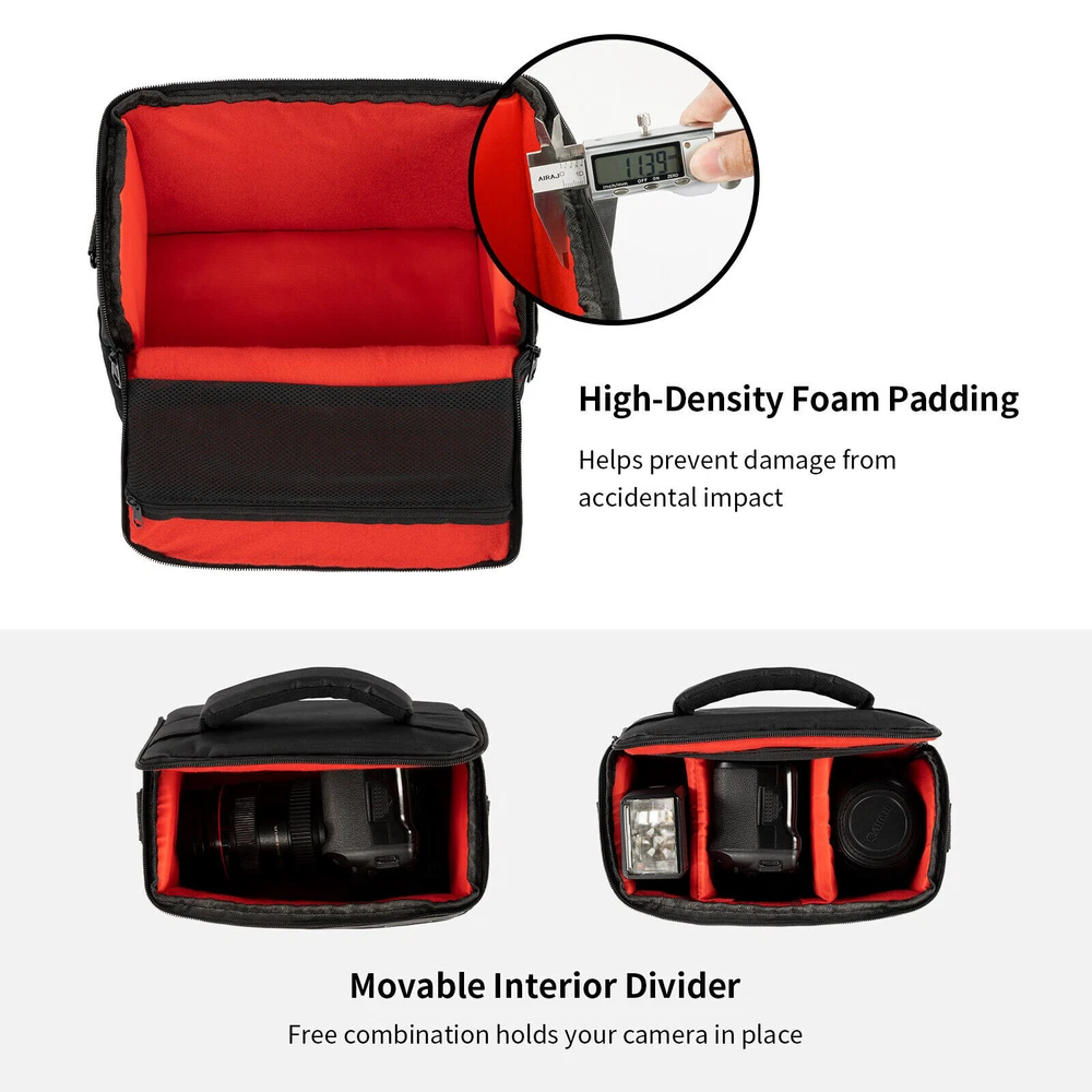 Black Camera Bag Case Shoulder Large DSLR Pouch Zipper Lens For Canon Nikon Item properties: Material:Nylon Length: 9.8 In Width:8.7 In Height : 6.1In Color :Black To Fit:For Canon, For Nikon, For Sony Features: 【Camera Protection】: The versatile camera bag's camera protection system consists of thick padding that you can rely on to keep your kit safe. All exterior fabrics have been treated to make them waterproof and a dust cover is also provided. 【Large Storage Space】: 1removable dividers allow you to customize the main compartment to fit your gear. There are two straps on the back so you can take your favorite little tripod with you. The flap opens away from your body so it's not hindered when you need to move quickly. 【What To Carry】: Specially designed for DSLRs, each intuitive design element is made for total functionality, and it has multiple compartments to neatly pack your mirrorless or entry level DSLR camera, additional lens, accessories, batteries and memory cards. 【User Friendly】: Travel and transport your gear in style. This is a compact camera bag that makes it easy to carry your camera and essentials hands-free, making it ideal for travel and commuting. Ideal gift for men and women. 【Travel Friendly】: 100% brand new and high quality Fashionable and unique design Grid fabric shoulder pouch for digital camera Buckle closures ensure your devices stay safe and proper in the bag Adjustable shoulder strap for your easy and convenient use Soft lining provides great cushioning effect Protect your camera from damage, dust and scratches Package including: 1x Camera Bag 1x Sponge Separator 1x Strap 1x Dust Cover On Dec 16, 2024 at 05:14:25 PST, seller added the following information:
