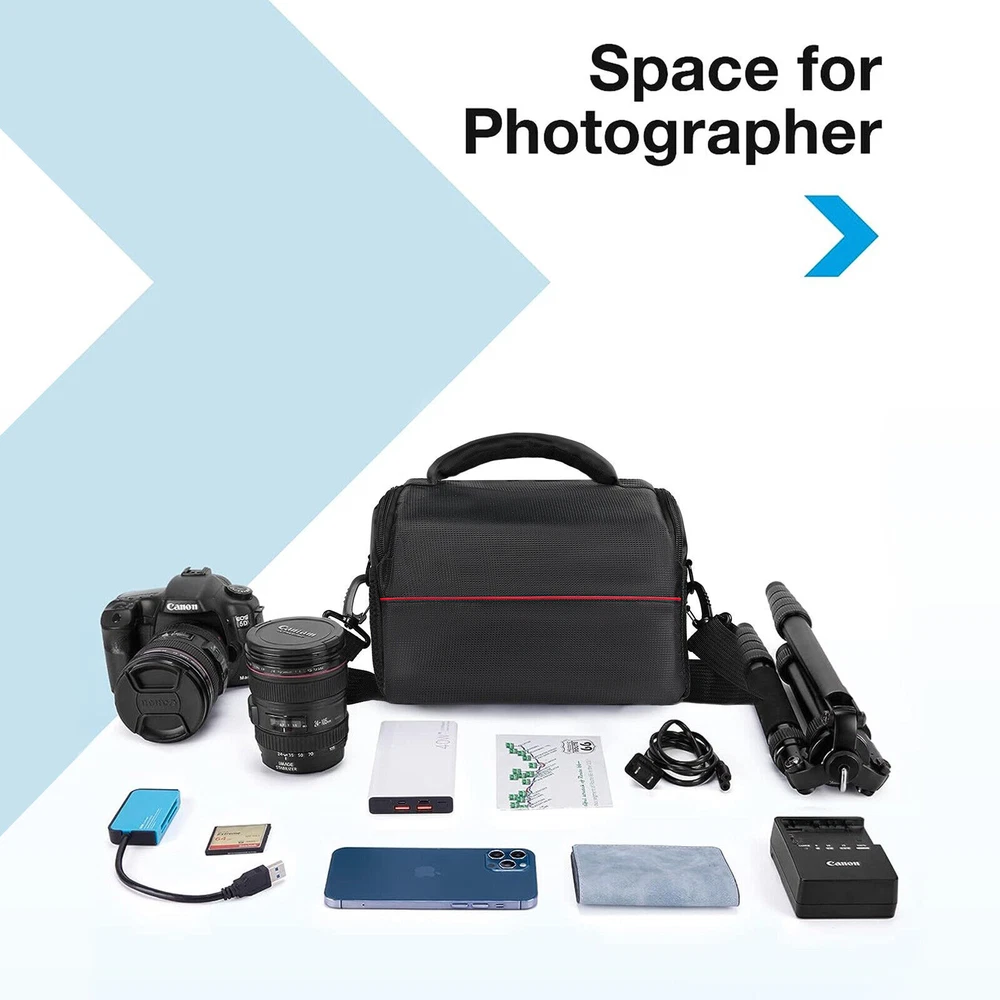 Black Camera Bag Case Shoulder Large DSLR Pouch Zipper Lens For Canon Nikon Item properties: Material:Nylon Length: 9.8 In Width:8.7 In Height : 6.1In Color :Black To Fit:For Canon, For Nikon, For Sony Features: 【Camera Protection】: The versatile camera bag's camera protection system consists of thick padding that you can rely on to keep your kit safe. All exterior fabrics have been treated to make them waterproof and a dust cover is also provided. 【Large Storage Space】: 1removable dividers allow you to customize the main compartment to fit your gear. There are two straps on the back so you can take your favorite little tripod with you. The flap opens away from your body so it's not hindered when you need to move quickly. 【What To Carry】: Specially designed for DSLRs, each intuitive design element is made for total functionality, and it has multiple compartments to neatly pack your mirrorless or entry level DSLR camera, additional lens, accessories, batteries and memory cards. 【User Friendly】: Travel and transport your gear in style. This is a compact camera bag that makes it easy to carry your camera and essentials hands-free, making it ideal for travel and commuting. Ideal gift for men and women. 【Travel Friendly】: 100% brand new and high quality Fashionable and unique design Grid fabric shoulder pouch for digital camera Buckle closures ensure your devices stay safe and proper in the bag Adjustable shoulder strap for your easy and convenient use Soft lining provides great cushioning effect Protect your camera from damage, dust and scratches Package including: 1x Camera Bag 1x Sponge Separator 1x Strap 1x Dust Cover