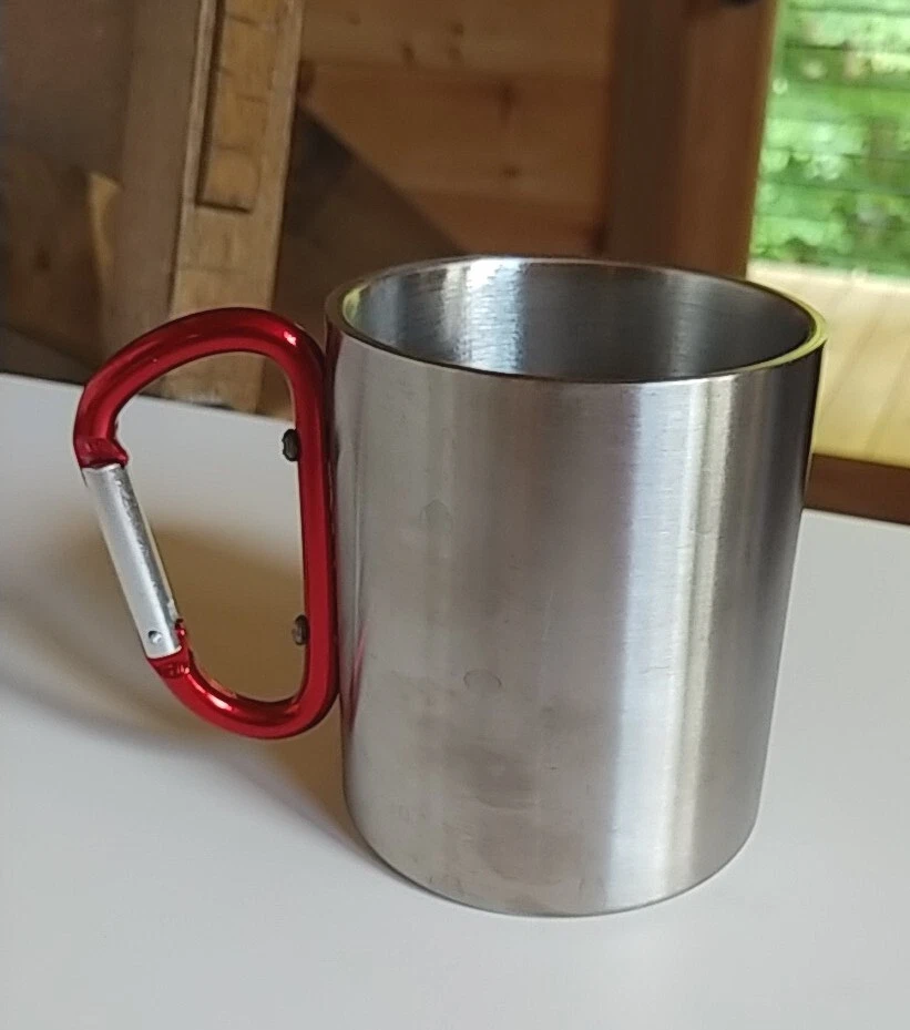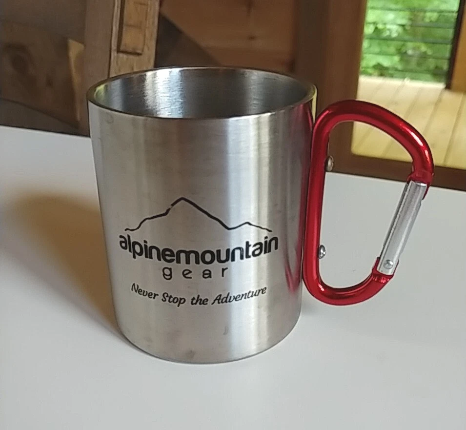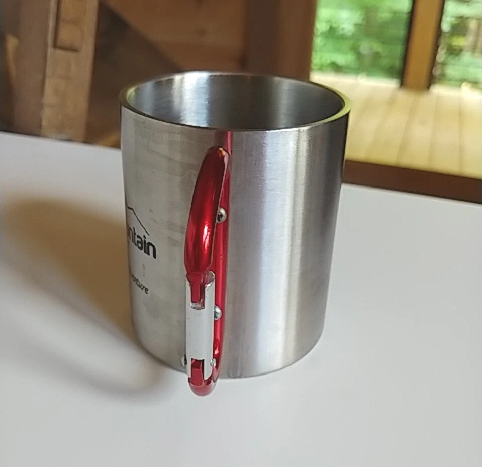 This Alpine mountain gear carabiner mug is the perfect addition to your outdoor adventures. With a capacity of 9 fl. oz., it is suitable for both hot and cold beverages. The silver tone with red carabiner design adds a touch of style to your outdoor gear. Made of stainless steel, this carabiner mug is durable and perfect for outdoor enthusiasts. The carabiner feature adds an extra layer of convenience and the "Never Stop the Adventure" pattern inspires you to never give up on your outdoor goals. This mug is ideal for teens, boys, adults, and girls who love outdoor themes.
