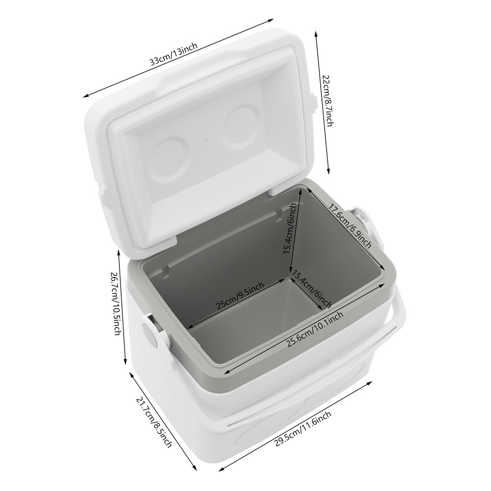Specification Color: Grey + White Material: PP, PE, PU Shape: Rectangular Assembly Required: No Mounting Type: Freestanding Capacity: 8.5L/2.25Gal Product Size: 29.5*21.7*26.7cm/11.6*8.5*10.5 in Product Inner Size: 25*15.4*15.4cm/9.84*6.06*6.06 Cover Size: 33*22cm/12.99*8.66in Opening Size: 25.6*17.6cm/10.1*6.9in Package Size: 35*29*26cm/13.78*11.42*10.24in Gross Weight: 2.15kg/4.74 lbs Net Weight: 2.04kg/4.5 lbs Package Included 1* Insulated Cooler Camping Ice Boxes & Coolers, Smal, Compact Insulated Cooler, Portable Ice Box Description Description Our insulated cooler not only provides long-lasting freshness for your outdoor activities, but also becomes an ideal companion for picnics, camping trips or beach parties with their elegant design and excellent performance. The use of advanced insulation materials and technology ensures that food and beverages remain at the ideal temperature for a long period of time. Key Features Sturdy and Durable: It is made of high-class PE, PP and PU, making the product durabl e, wear-resistant and i mpact-resistant so you can use it for a long time without frequent replacement. Superior Insulated Capability : It is made of excellent insulating material, which can effectively keep your drink warm or cool . Even on hot summer days, your drinks and snacks will remain refreshingly cold in a cetain period, retaining their original flavor and freshness. Large Capacity: With a large capacity of 2.25 gallons, it can hold enough drinks, ice or snacks to make your swim and picnic time more enjoyable. Thoughtful Design: The sturdy lid and airtight design not only enhance the product's cold insulation performance, but also prevent leaks during transportation . Additionally, it does not require electricity to keep food warm and cold, which enhances safety and convenience of use. Compact and Lightweight: With its compact size (11.6*8.5*10.5 in inches) and lightweight (4.5 lbs), you can take it outside in the trunk of your car without taking up too much space. Easy to Clean: The smooth surface and simple structure allow you to easily clean away dust and residue with water and a soft towel. Ready to Go: The one-piece construction allows you to use it as soon as you receive it, which is very time-saving and convenient! Ideal Gift : With its large capacity, this product is an ideal housewarming and holiday gift for family, friends, and loved ones, so they can enjoy a more convenient and tidy life. Details Portable Handle: The ergonomic structure can reduce the pressure on the hand during transportation, allowing you to carry this product more comfortably. Cup Slots: The two round slots at the top can help you secure the water cup or drink (not included), allowing you to have a peaceful picnic. Round Edges: Smooth edges are not only comfortable to the touch, but also enhance safety in use. Application It can hold a variety of drinks, snacks, refreshments and ice. It is suitable for outdoor activities, fishing trips, family camping, picnics and so on. Specification Color: Grey + White Material: PP, PE, PU Shape: Rectangular Assembly Required: No Mounting Type: Freestanding Capacity: 8.5L/2.25Gal Product Size: 29.5*21.7*26.7cm/ 11.6*8.5*10.5 in Product Inner Size: 25*15.4*15.4cm/9.84*6.06*6.06 Cover Size: 33*22cm/12.99*8.66in Opening Size: 25.6*17.6cm/10.1*6.9in Package Size: 35*29*26cm/13.78*11.42*10.24in Gross Weight: 2.15kg/4.74 lbs Net Weight: 2.04kg/4.5 lbs Package Included 1* Insulated Cooler Notes Please note that we do not recommend using the product for seating Please note that when you go out camping, you should strictly abide by the regulations of the local government, civilized camping, safe camping, protecting the environment , and caring for the ecology. Please note that this product does not contain any drink. Please allow the slight color difference caused by the shooting light and 1-3cm error due to manual measurement and make sure you do not mind before ordering. Payment Delivery details Terms of sales About us Contact us Payment We accept ebay payment 。 Fees such as import duties, taxes are not included in the item price or shipping costs. These charges are the buyer's responsibility. Delivery details Shipping: 2-9 working days to: USA Terms of sales We maintain high standards of excellence and strive for hundred percent customer satisfaction. Feedback is very important to us. We hope that you contact us immediately before you give neutral or negative feedback, so that we can address your concerns. It is impossible to address issues if we do not know about them! About us Your satis faction is our ultimate goal. We work hard to earn your trust and future business. Our certified technicians have tested each item before shipping. The unit comes with 1 year limited warranty on all manufacturing defects. a) If you receive a defective item, you may return it or ask for a discount. Please contact us within 14 days after you receive the package. b) What you returned must be intact and in its original packaging as re? u. Customer is responsible for shipping costs of the returned item. c) We will cover the cost of shipping back t with the shipping rate indicated in the registration page. We will send you a new unit or refund the full payment you paid. Thank you. Contact us Business Hour Business Hour: Monday To Friday: 8:30 AM to 5:00 PM (Beijing China time) Due to time zones, our reply to your questions may not be immediately. But within above working time, we will reply your email within 24 hours. If it's non-workdays, please kindly be patient and wait till Monday. Please contact us with ebay message. Please feel free to contact us if you have any questions. Monday To Friday: 8:30 AM to 5:00 PM (Beijing China time) Due to time zones, our reply to your questions may not be immediately. But within above working time, we will reply your email within 24 hours. If it's non-workdays, please kindly be patient and wait till Monday. Please contact us with ebay message. 
