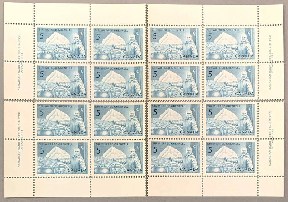 Canada Stamp MNH Plate Blocks of 4 set featuring the 5 Cent denomination from 1965. This collectible stamp showcases Sir Wilfred Grenfell and is part of the Elizabeth II era. The aquamarine blue stamps are in VF/XF grade, with a vibrant design and crisp edges. A perfect addition to any Canadian stamp collection, this set is a great find for enthusiasts and collectors alike.