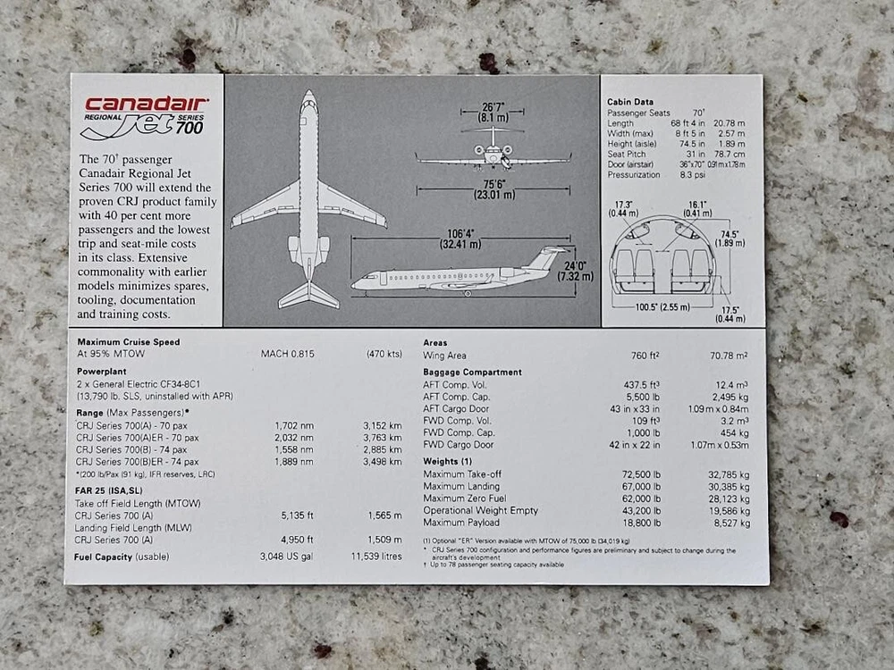 This is a 6-1/2" wide x 5" tall, information & statistics card for the Bombardier Canadair Regional Jet Series 700... All kinds of info are on the backside of this card (see pictures for details) ..