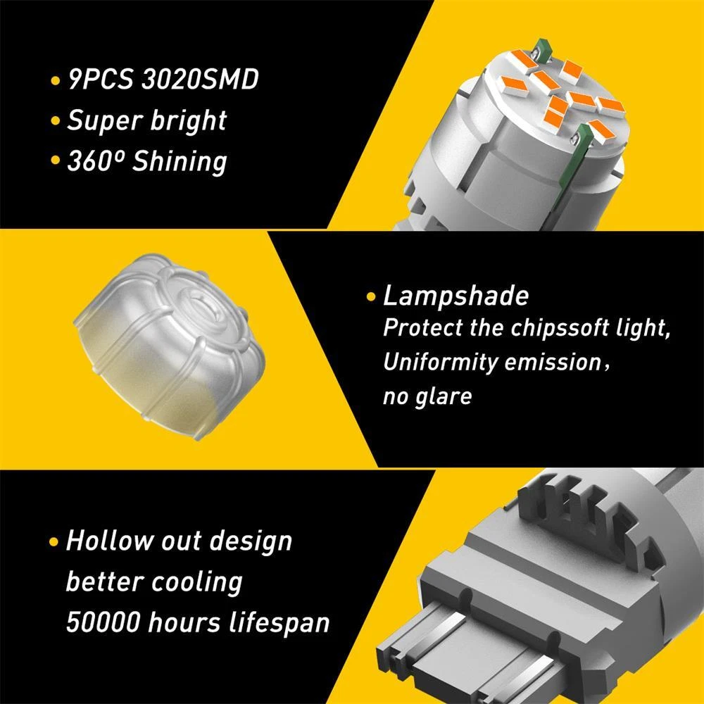 Features: 1. High brightness and uniform light emission. 360 degrees beam, no dead ends or glare. 2. Long life. The aluminum base plate and hollow plug are used for faster heat dissipation. 3. Wide pressure and cross flow to ensure long-term stable operation of the lamp beads. 4. Small size, 1:1 with the original car halogen lamp 5. Easy installation; no polarity, suitable for CK and standard plugs. Specifications: Model: 3157/ 3156/ 4114/ 3057/ 4156/ 3047/ 4157 .etc Lumens: 1200Lm/per bulb Power: 8.5W/per bulb Color: Yellow LED Chip: 9pcs 3020 SMD Voltage(V): DC 9V-16V Canbus Amber LED Turn Signal Blinker DRL Parking Light Bulbs Lamp 3157 4057 4157 Features: 1. High brightness and uniform light emission. 360 degrees beam, no dead ends or glare. 2. Long life. The aluminum base plate and hollow plug are used for faster heat dissipation. 3. Wide pressure and cross flow to ensure long-term stable operation of the lamp beads. 4. Small size, 1:1 with the original car halogen lamp 5. Easy installation; no polarity, suitable for CK and standard plugs. Specifications: Model: 3157/ 3156/ 4114/ 3057/ 4156/ 3047/ 4157 .etc Lumens: 1200Lm/per bulb Power: 8.5W/per bulb Color: Yellow LED Chip: 9pcs 3020 SMD Voltage(V): DC 9V-16V Current: 0.65A Beam Type: 360°Beam Angle Lifetime: More than 50000 hours Certified by: CE & ROHs Warranty: 2 YEAR Applicable Used as a: Turn Signal Light, DRL light, parking light, reverse light, brake light, rear fog light .etc Suitable For Pickup, Wagon, UTB, Cab, ATV, SUV, Jeep, Truck, Bus etc. Package:2x LED 3157 bulbs Attention: LED bulb is low power device, the following issues may occur if you want to use LED bulb on some European vehicles: Hyper Flashing, No Flashing, or Error Code. Those are NOT problems of LED bulb and NOT covered by warranty. You may simply add a set of load resistor (NOT included) to avoid those issues.can be solved with a decoder (decoder must be purchased separately) ABOUT US Canbus Amber LED Turn Signal Blinker DRL Parking Light Bulbs Lamp 3157 4057 4157 Features: 1. High brightness and uniform light emission. 360 degrees beam, no dead ends or glare. 2. Long life. The aluminum base plate and hollow plug are used for faster heat dissipation. 3. Wide pressure and cross flow to ensure long-term stable operation of the lamp beads. 4. Small size, 1:1 with the original car halogen lamp 5. Easy installation; no polarity, suitable for CK and standard plugs. Specifications: Model: 3157/ 3156/ 4114/ 3057/ 4156/ 3047/ 4157 .etc Lumens: 1200Lm/per bulb Power: 8.5W/per bulb Color: Yellow LED Chip: 9pcs 3020 SMD Voltage(V): DC 9V-16V Current: 0.65A Beam Type: 360°Beam Angle Lifetime: More than 50000 hours Certified by: CE & ROHs Warranty: 2 YEAR Applicable Used as a: Turn Signal Light, DRL light, parking light, reverse light, brake light, rear fog light .etc Suitable For Pickup, Wagon, UTB, Cab, ATV, SUV, Jeep, Truck, Bus etc. Package:2x LED 3157 bulbs Attention: LED bulb is low power device, the following issues may occur if you want to use LED bulb on some European vehicles: Hyper Flashing, No Flashing, or Error Code. Those are NOT problems of LED bulb and NOT covered by warranty. You may simply add a set of load resistor (NOT included) to avoid those issues.can be solved with a decoder (decoder must be purchased separately) FAQ Shipping Returns Contact Us Payment Why swith to LED? LEDs not only give your vehicle a clean, modern look but, with proper use, will outlast any halogen bulb and HID bulb! Low energy draw, high lumen output, and instant on/off LED technology out shines stock bulbs in every way. Which bulbs are used in my vehicle? Check Sylvania automotive lamp replacemnt guide , you can select the year, make, and model of your vehicle, then select the application you want to replace or upgrade from stock. What does CAN Bus mean? CAN Bus means Controller Area Network Bus. This system monitors your vehicle and reports operating conditions. CAN Bus systems are commonly found in European vehicles such as BMW, Audi, Mercedes, Volkswagen, Porsche, and in many American vehicles. While most late model American vehicles have CAN Bus systems, it is always good to check with your vehicle dealer to see which system your vehicle has before purchasing electrical products. When do you need Warning Canceller? Some vehicles with cmplex internal computers(such as Audi,BMW,Jaguar,Mercedes,etc.) might report on-dash errors or flickering on the headlights. The warning canceller fixes the dashboard warning and flickering effect. Bulb Out Dashboard Error: On some vehicles, the dashboard will report as if you have a headlight bulb missing or burnt. It does not affect the headlights functioning, but the light on-dash will be on. The warning canceller fixes the issue. Flickering Issue: This happens when your vehicle does not recognize the new headlights installed. When turning the headlights on, the vehicle's computer does not understand the signal back from the headlights hence thinking they are still off. This triggers the headlight flickering effect. The warning canceller solves this issue. LED Advantages: Very low and efficient energy consumption than halogen bulbs & HID Bulbs Compared with HID bulbs, LED bulbs Light up instantly, no warm up period Low voltage protection, high precision constant current driver chip Longer lifespan than HID and halogen bulbs Light can be controlled easily in color and intensity Easy to install a LED headlight conversion kit (1) We will ship your item(s) within 24 hours. (2) We ship this item to US only via USPS first class mail. It usually takes 3-6 working days to deliver. How Long Will It Take to Receive My Refund? If you have emailed us for a refund ,once we have approved it ,after 60 days your money will be refunded. The estimated time for the refund to appear in your account is based on the payment method you use. Paypal is the only supported in NIGHTEYE Store. Please notify us within 30 days after you've received your purchased i
