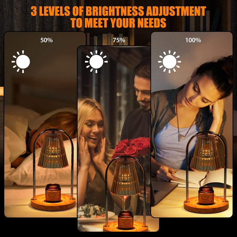 Candle Warmer Lamp with 2 Bulbs,Electric Candle Warmer with Timer,Dimmable Candle Light Melter, Compatible with Small and Large Candles, Aromatic Candle Holders for Bedroom Home Decor Product Details Color: White Brand: DONGULI MPN: DGLCW-001 UPC: Does not apply EAN: Does not apply Finish Type: glassed Base Material: Wood Bulb Base: E27 Product Dimensions: 7.5"D x 7.5"W x 12.5"H Item Weight: 3 Pounds Finish Type: glassed Base Material: Wood Bulb Base: E27 Product Dimensions: 7.5"D x 7.5"W x 12.5"H Item Weight: 3 Pounds Lamp Type: Night Light Shade Color: White Shade Material: Glass, Metal, Wood Switch Type: Pull Chain Style: Vintage Brand: DONGULI Color: White Special Feature: Dimmable Light Source Type: Halogen Material: Glass Room Type: Bedroom Recommended Uses For Product: Decoration Power Source: Corded Electric Shape: Bulb Controller Type: Push Button Number of Light Sources: 2 Connectivity Technology: IR Included Components: Bulb Bulb Shape Size: B13 Mounting Type: Tabletop Wattage: 50 watts Number of Items: 1 Lighting Method: halogen Control Method: Touch Indoor/Outdoor Usage: Indoor Specific Uses For Product: Decoration, Bedroom, Living Room, Home Office Water Resistance Level: Not Water Resistant Installation Type: Tabletop Connectivity Protocol: Homeplug Base Diameter: 3.9 Inches Is Cordless?: No Manufacturer: Dongguanshi xiangguodianzikejiyouxiangongsi Shade Height: 5.5 Inches Item Weight: 2.99 pounds Item model number: DGLCW-001 Date First Available: July 17, 2023 Beautiful Home DecorThe elegant and simple candle warming lantern is definitely a decorative item to match your house. Soft halogen lamps (including 2 x 50-watt bulbs) create a cozy atmosphere, and the candle-warming lantern distributes your favorite candle scent evenly throughout the room, making you feel happy and soothed at the end of the day. Cleaner and Stronger Scent Heater LampThe principle of a candle wax heater is to use the candle heater bulb to heat the candle from top to bottom so that the surface of the scented candle is evenly heated and melted. No open flame, no smoke, no pollution, reducing the risk of fire. Our scented candle wax heaters help to better emit pure fragrance. Safer to use to avoid accidental injury to pets or babies. Candle Heater with Timer With a metal body, glass shade, and wooden base, it is a stylish combination of classic and modern design. This is not only a molten wax warmer, but also a night light for bedroom, living room, office, yoga studio, and so on. The control buttons allow you to control the temperature by adjusting the light to control the intensity of the scent. Scented Candle. Provides 3 timer length options (2H/4H/8H), accompany you to sleep peacefully in the quiet nights Fits most candle sizes The height between the base and the candle light head is 5.5 inches, and the diameter of the wooden base is 3.9 inches. The wax heater is compatible with most sizes of candles, such as large jar candles, Bath and Body Work 3 Wick candles, etc. The Best Gift for Candle Lovers Every year in the United States, many house fires are caused by candle fires. Say goodbye to candle flames, smoke, and soot. Enjoy your favorite candles safely and without fire with our lighted candle melter that will be the perfect gift choice to show love to family, loved ones, or friends on Valentine's Day, Thanksgiving, Christmas, New Year's, housewarming celebrations, or other special occasions!