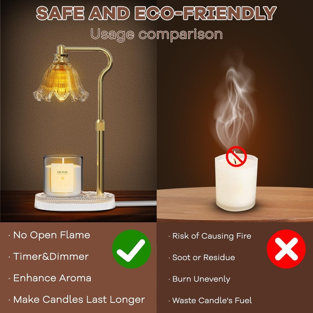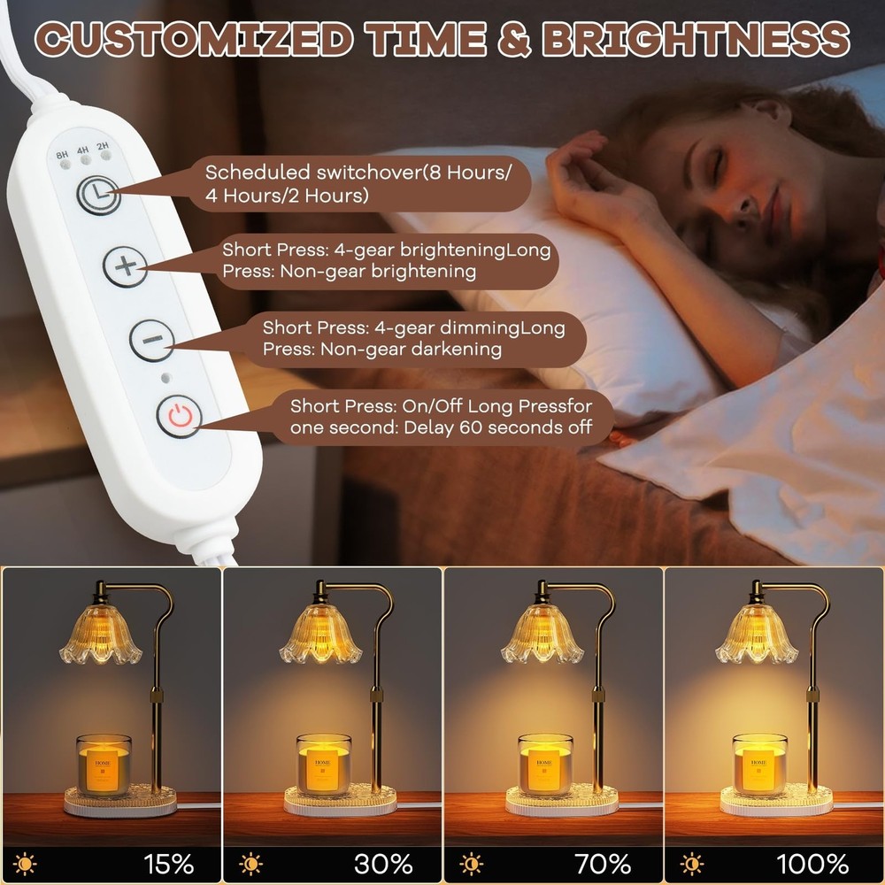 Candle Warmer Lamp,2H/4H/8H Timer,4-Level Dimming,Height Adjustable,Electric Candle Warmer Melter with 2 Bulbs for Scented Wax Home Decor for Her Birthday Gifts for Women Mom Wife Product Details Color: Flower-white Brand: BNWXOY MPN: XXD0917 UPC: Does not apply EAN: Does not apply Bulb Base: GU10 Lamp Type: Night Light Shade Color: white Switch Type: Touch Style: Modern Bulb Base: GU10 Lamp Type: Night Light Shade Color: white Switch Type: Touch Style: Modern Brand: BNWXOY Color: Flower-white Special Feature: Adjustable Color Temperature, Adjustable Height, Lightweight, Color Changing Light Source Type: Halogen Material: Crystal, Metal, and other unspecified materials Recommended Uses For Product: Decoration Power Source: Corded Electric Connectivity Technology: USB Mounting Type: Tabletop Cartoon Character: mom gift; house warming gifts new home Wattage: 5E+1 Number of Items: 1 Lighting Method: Adjustable Indoor/Outdoor Usage: Indoor Specific Uses For Product: Decoration Installation Type: Tabletop Number of Pieces: 1 Voltage: 1.2E+2 Volts (AC) Is Cordless?: No Manufacturer: BNWXOY Product Dimensions: 1 x 1 x 1 inches Item Weight: 3.69 pounds Item model number: XXD0917 Date First Available: September 17, 2024 Perfect Candle Lamp Design: This candle heating lamp perfectly balances aesthetics and functionality. The crystal transparent base is connected to a metal telescopic rod and a unique new appearance lampshade, providing stable support and suitable for candles of all sizes. The most important thing is that the crystal transparent base can reflect different lighting effects with different lampshade patterns and colors, creating a comfortable atmosphere and projecting beautiful ambient light Sleep Light With 4 Brightness & 8h Timing Function: The lamp candle warmer has 4 levels of height temperature adjustable (0%-15%-30%-70%-100%), the stronger the brightness, the faster the candle melts. And our candle warmer lamp can be turned off by timer feature 2H/4H/8H, don't need to worry about forgetting the heating time while enjoying the fragrance, with peace of mind sleep and play anytime. Plus, our candle lamps come with two GU10 50W halogen bulbs to get you started Excellent Security:This candle warmer lamp with timer utilizes advanced heating technology to melt candles from top to bottom, achieving a flameless, smokeless, and pollution-free effect. Both the lampshade and base are coated with a high-temperature resistant material, effectively addressing concerns of fire hazards. When you relax or read time to put it on the side, you can enjoy the melting candle light brings ease and comfort, BNWXOY candle warmer light is your top choice.(Candles are not included) Perfect Home Decor: This candle warmer light suitable as a decorative match for any scene, especially for those living in apartments that do not allow the use of open flame candles. It is a good choice.The candle warmer adopts a Retro style design and is a delicate functional decorative lamp, suitable for living rooms, bedrooms, offices, yoga rooms, cafes, etc. It can also be used as a bedside lamp to create a sleep-inducing atmosphere Best Birthday Gifts for Women: This Candle Lamp Warmer with exquisite packing gift box will be the best gift choice.It can be a Mother's Day gifts, Christmas gifts, Thanksgiving gifts, Valentine's Day gifts, Mother's Day Gifts for Mom Home Decor House,Birthday gifts, Anniversary gifts, Housewarming gifts to show your love. Any problems please contact us, we will respond in 24H and provide a hassle-free replacement or refund