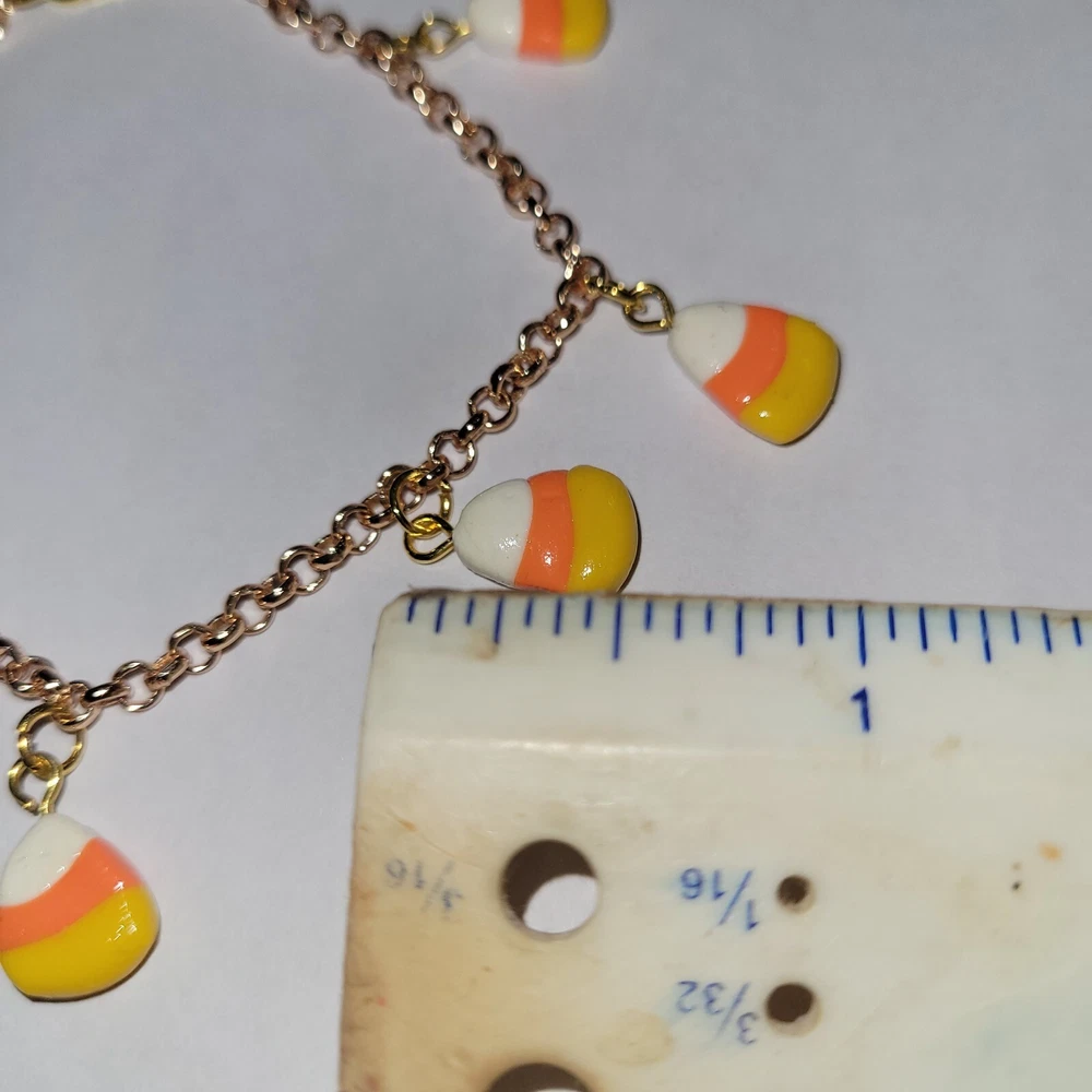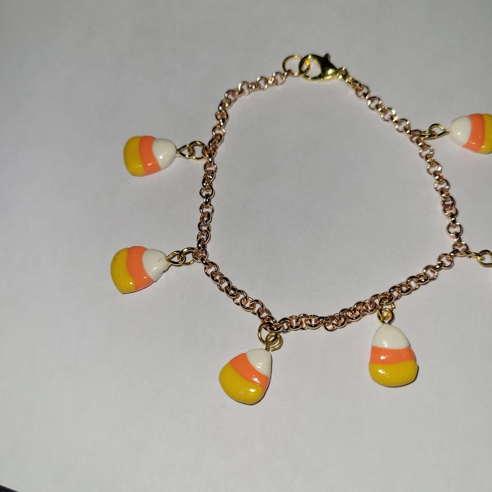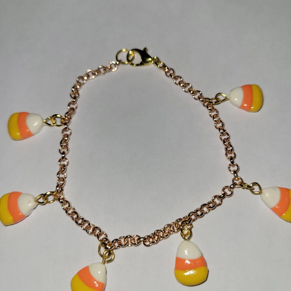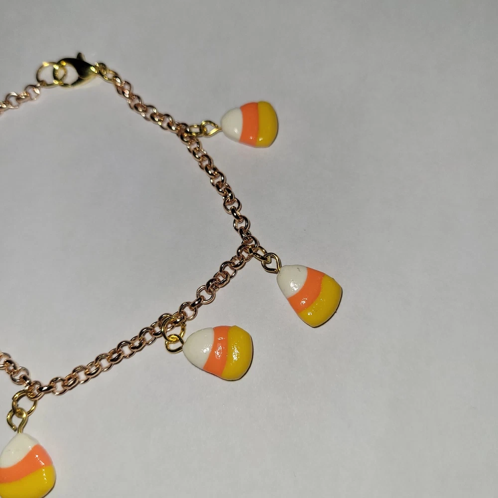 Indulge in the sweetness of fall with this delightful Candy Corn Bracelet. Crafted with care by hand, this bracelet features a charming design that will surely brighten up your day. The bracelet is made of durable polymer clay and has a gold tone finish that complements its vintage style. Measuring 7 inches in length, this bracelet is perfect for women who love to accessorize. It is a charm bracelet with no stone and is suitable for any occasion. Whether you're going to a party or just hanging out with friends, this bracelet will add a touch of fun to your outfit. Made in the United States, this bracelet is a perfect gift for yourself or your loved ones.