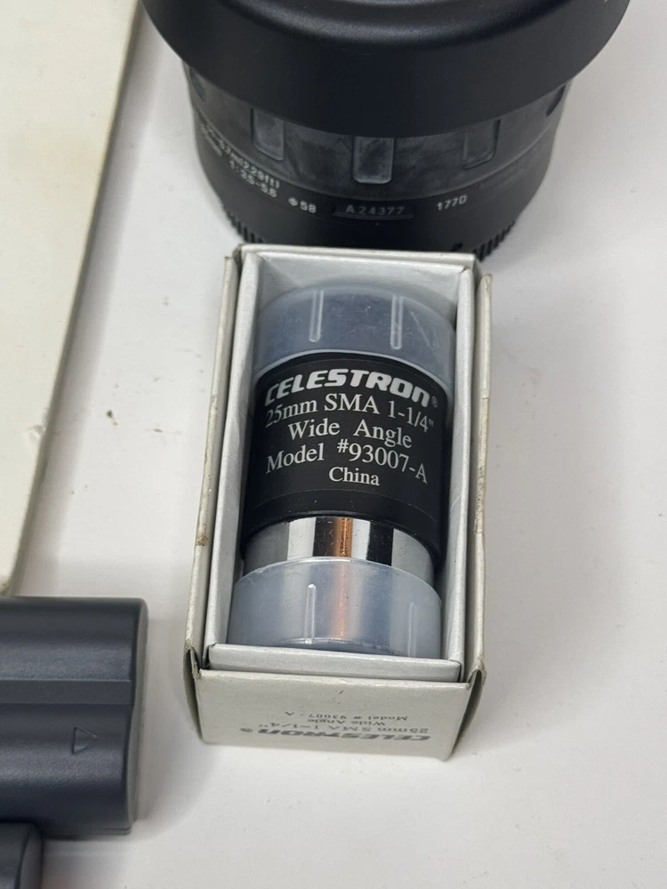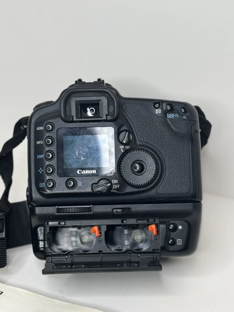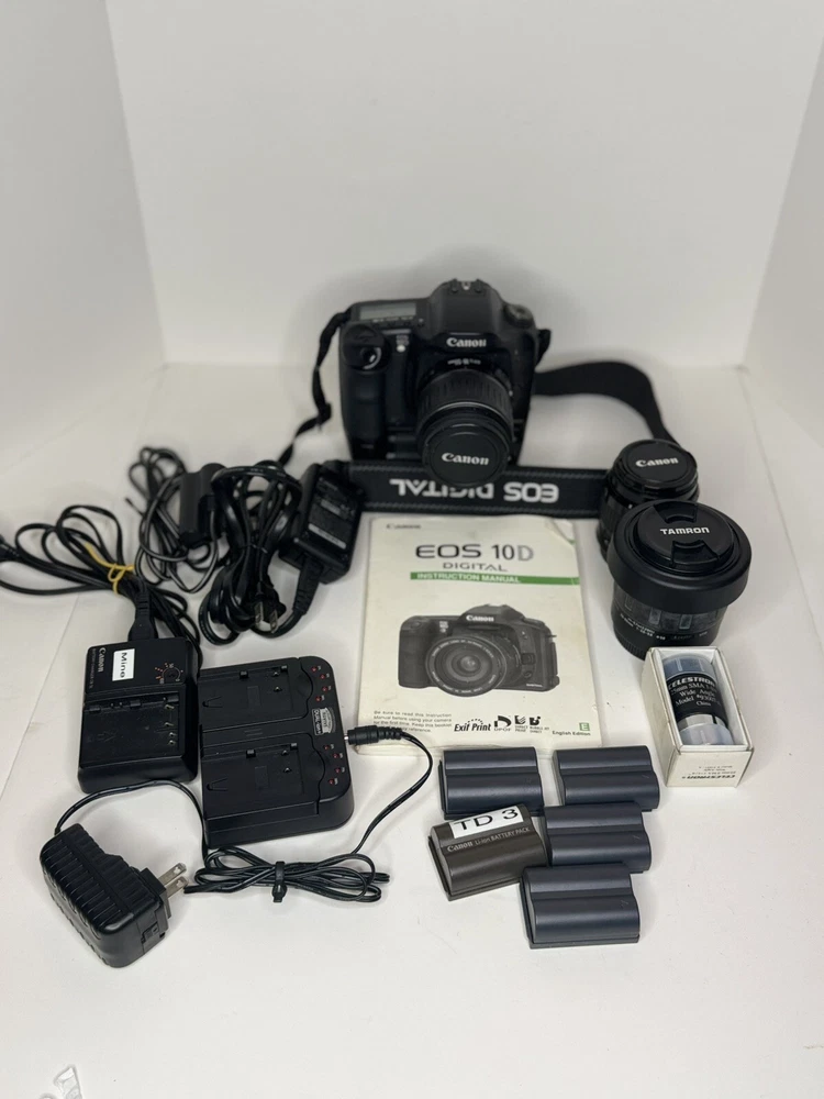 Canon eos D10 DSLR camera. Comes with the manual. A dual charger and a single chatger. There is a Canon battery grip attached which holds two batteries. It also has a Genuine Canon DS8111 AC Power Adapter w/ DC Coupler DR-400. This will allow you to run the camera directly off an electric outlet. There are four lenses Celestron 25mm SMA 1-1/4” Wide angle model 93007-A, Tamron Aspherical 28-80mm, Canon 35-80mm, and a Canon efs18-55mm. There also are five batteries. The only issues with the camera is the original battery door isn’t there. It can’t be when using the battery pack. Also the LCD screen on the back is cracked. The damage is shown in the pictures. You can still see the picture that was taken.