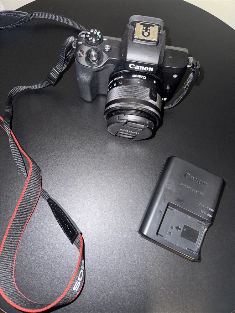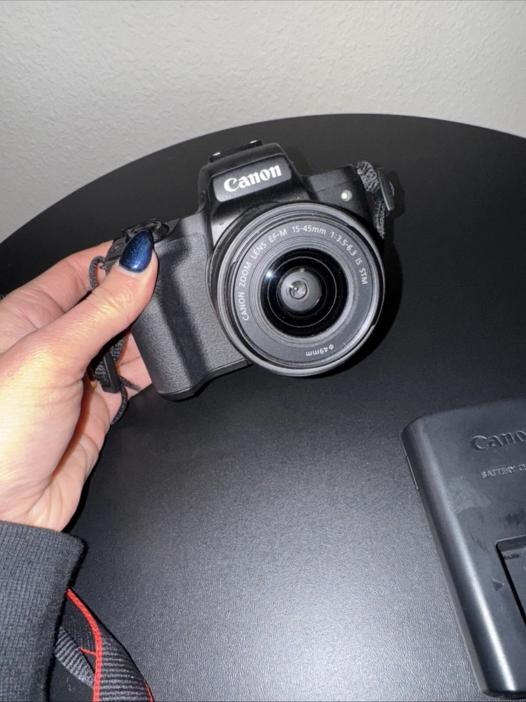 Canon EOS M50 w/ 15-45mm f/3.5-6.3 IS STM Lens. Has been used 3 times. In great condition, free of scratches. Comes with strap, battery, battery charger, and lense