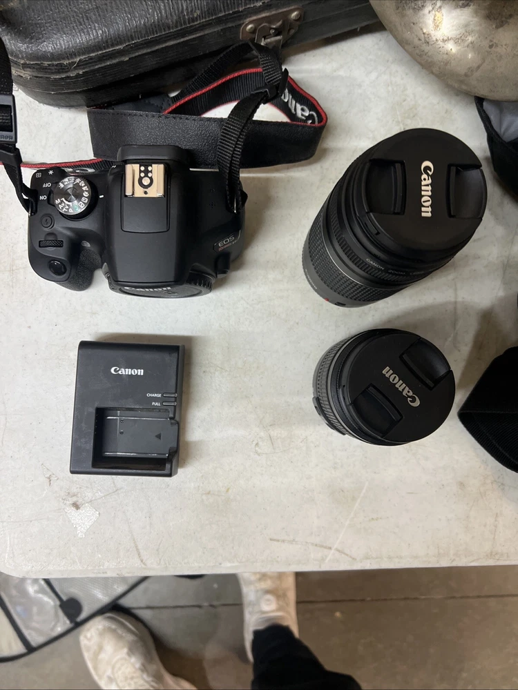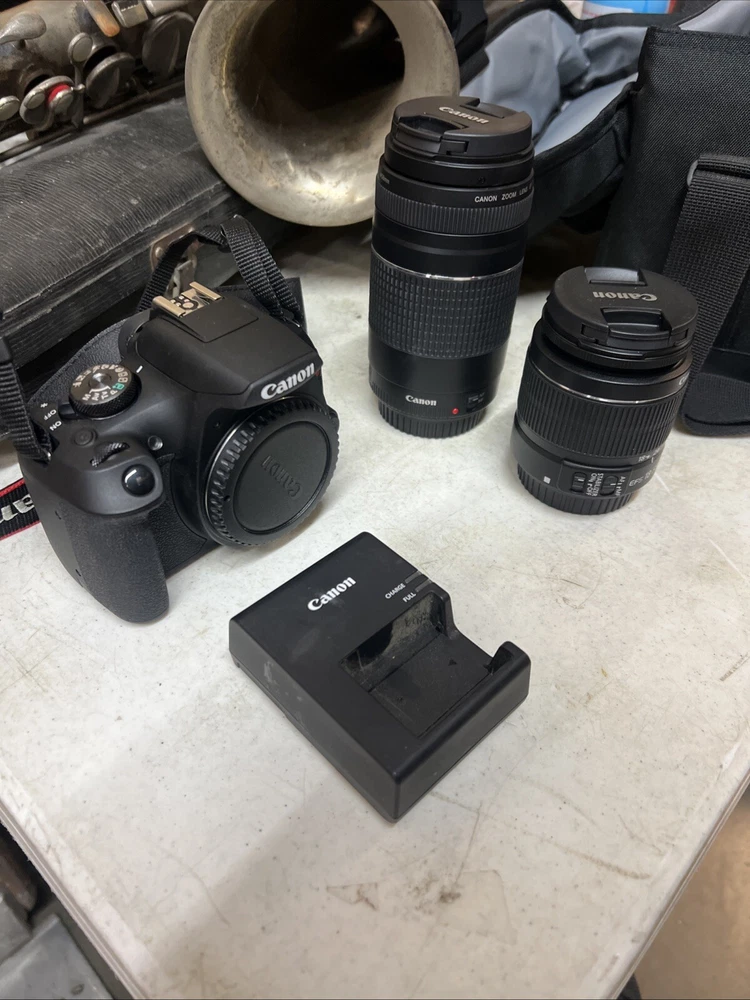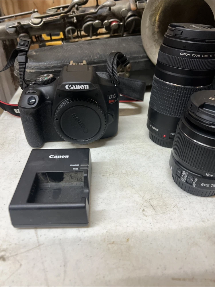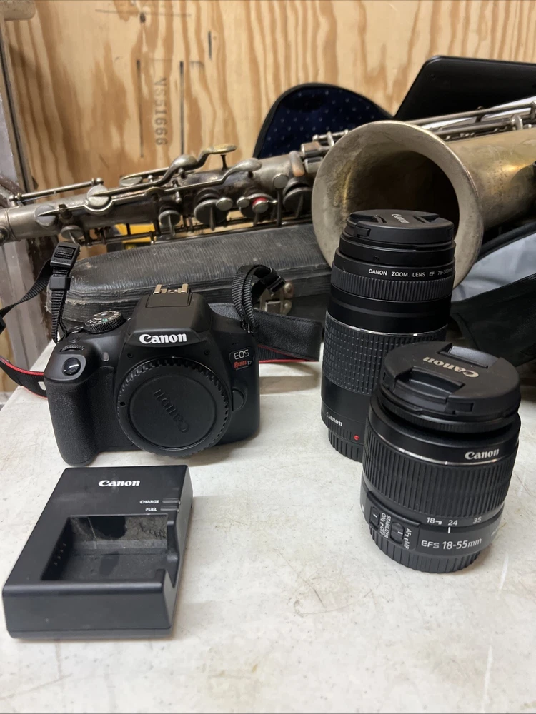 Capture stunning photos with this Canon EOS Rebel T7 DSLR camera and EF-S 18-55mm & 75-300mm IS II lens kit. This camera features a 24.1MP APS-C sensor, 1080i HD video recording, and a variety of features such as built-in flash, auto focus, exposure compensation, and red-eye reduction. The camera's maximum aperture ranges from f/3.5 to 5.6 and has a maximum resolution of 24.1MP. This digital SLR camera comes in black and is weather-resistant. It has a 3.0" fixed LCD screen and a range of connectivity options such as USB, remote control, and mini-HDMI. The camera's lithium-ion battery provides up to 415 shots per charge. Made in Japan, this camera is perfect for photography enthusiasts looking for a high-quality camera with multiple features.