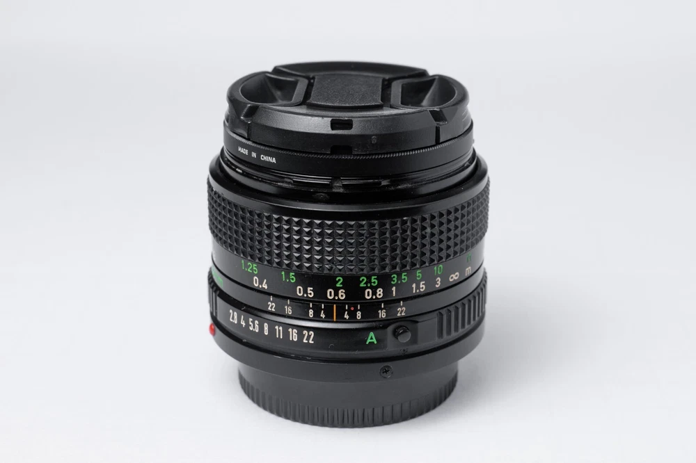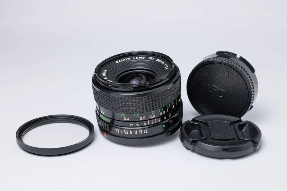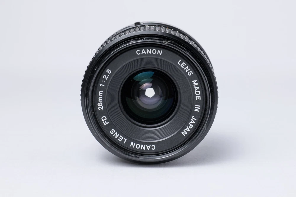 Canon FD 28mm F2.8 Wide Angle Lens FD Mount In Great Condition. Works properly. No scratches or dents on body. No haze or fungus in lens elements. Bundled with front and back lens caps and UV filter.
